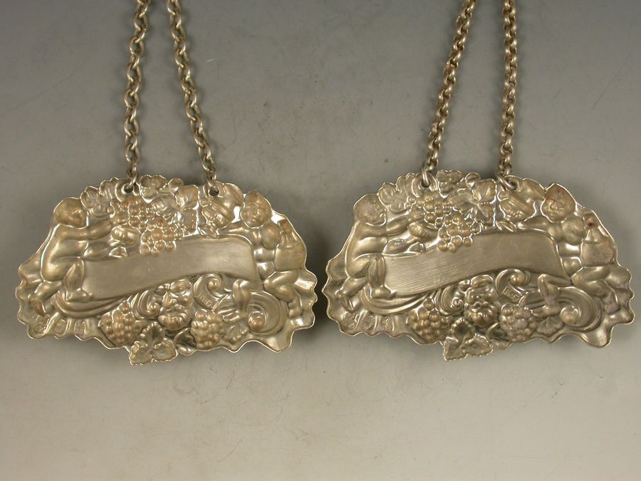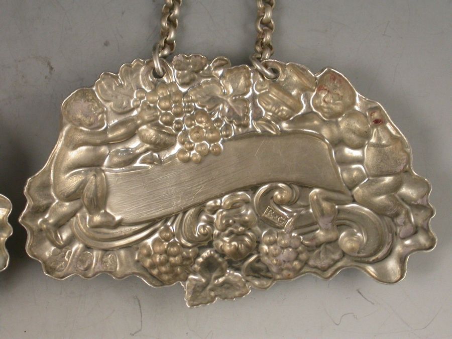 A pair of William IV die-stamped Provincial silver Wine Labels of ""two putti with jug and bottle form"", the scrolled name plates incised for Madeira and White Wine.