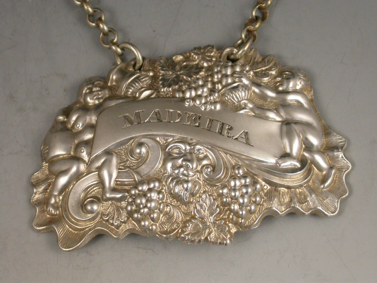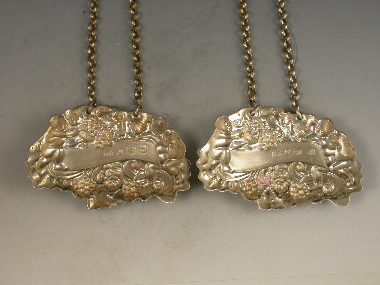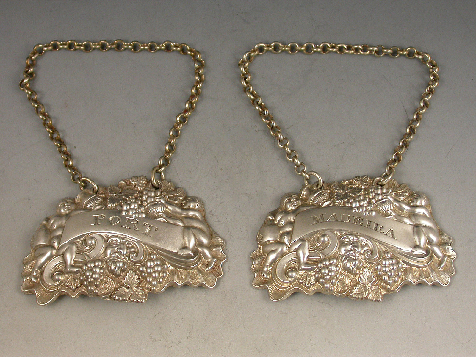 A pair of William IV die-stamped Provincial silver Wine Labels of ""two putti with jug and bottle form"", the scrolled name plates incised for Madeira and Port.