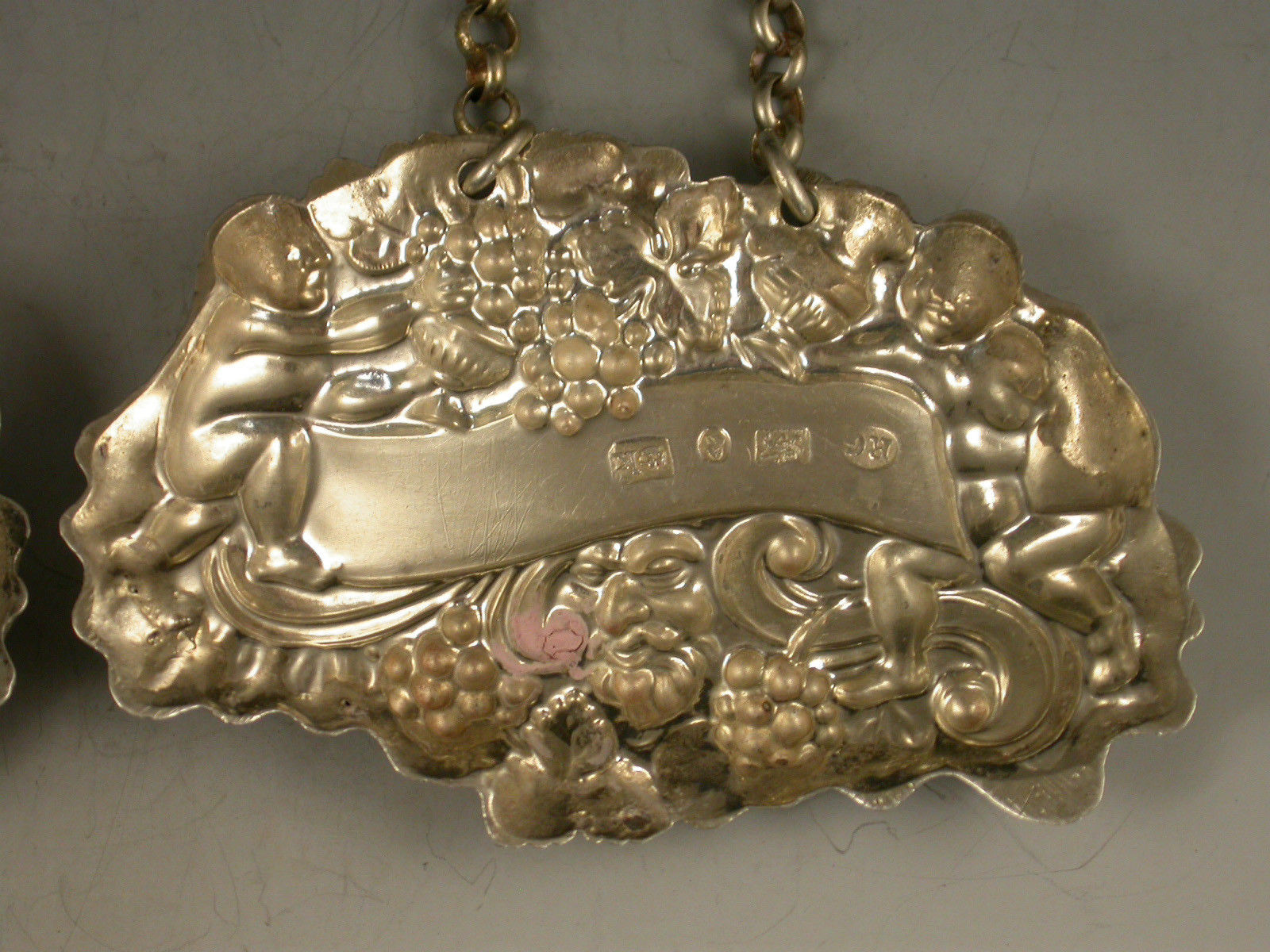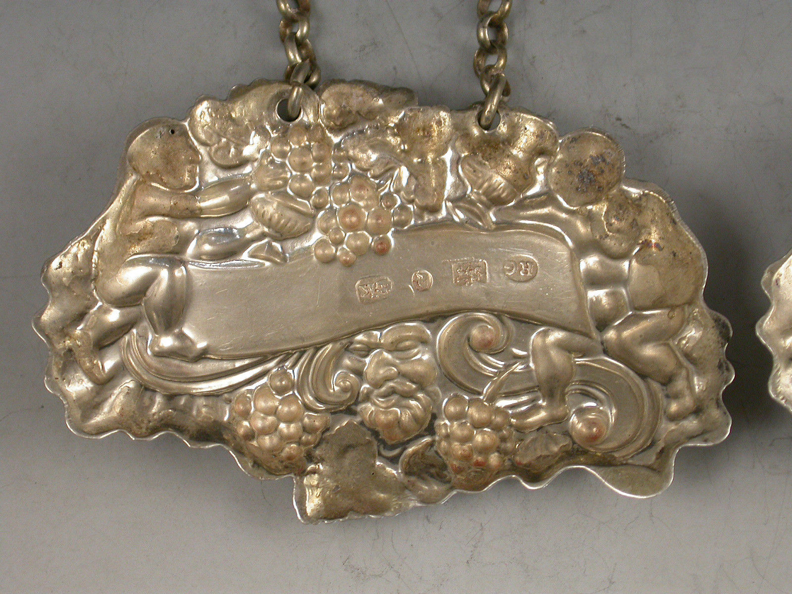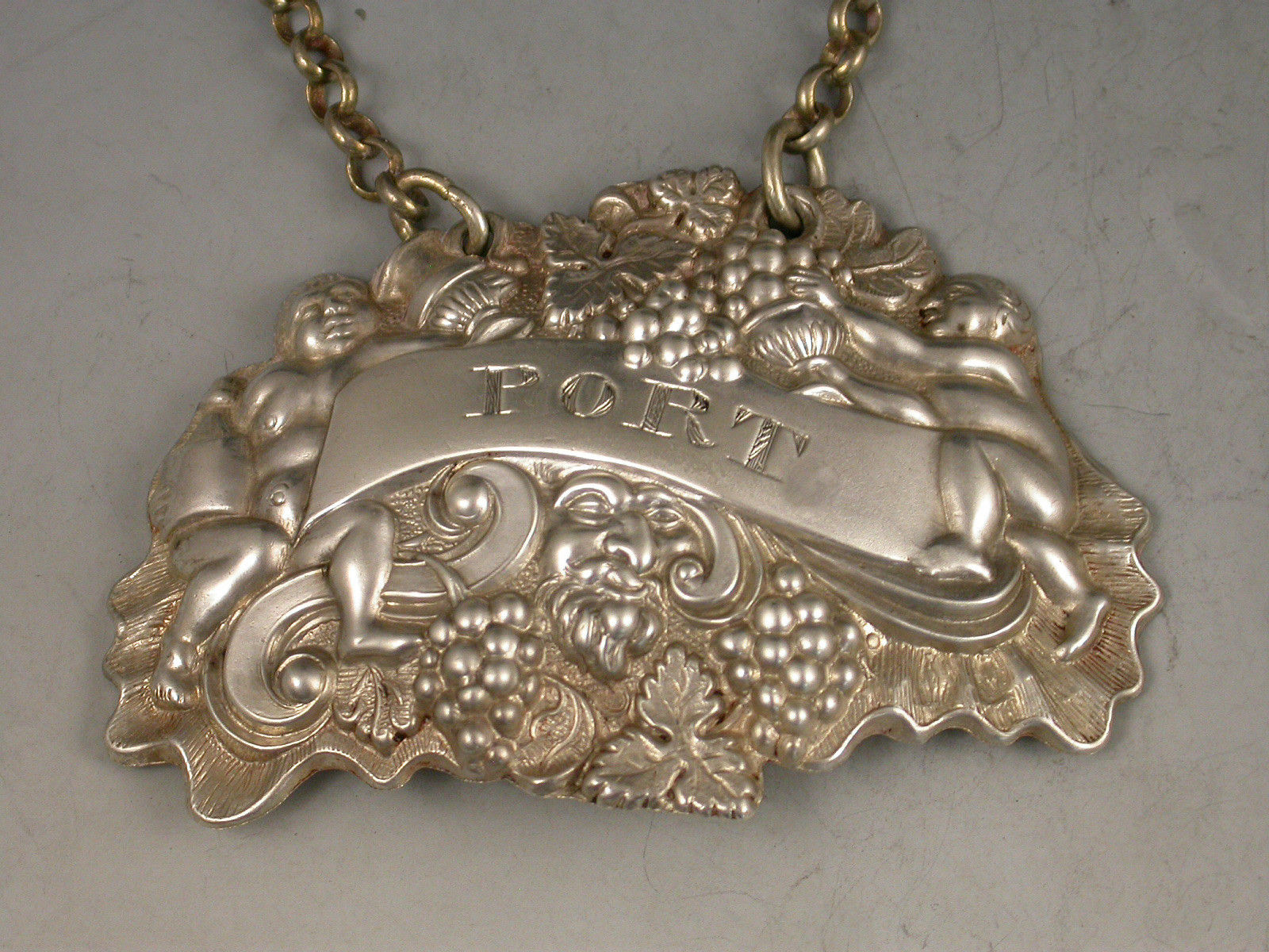 A pair of William IV die-stamped Provincial silver Wine Labels of ""two putti with jug and bottle form"", the scrolled name plates incised for Madeira and Port.