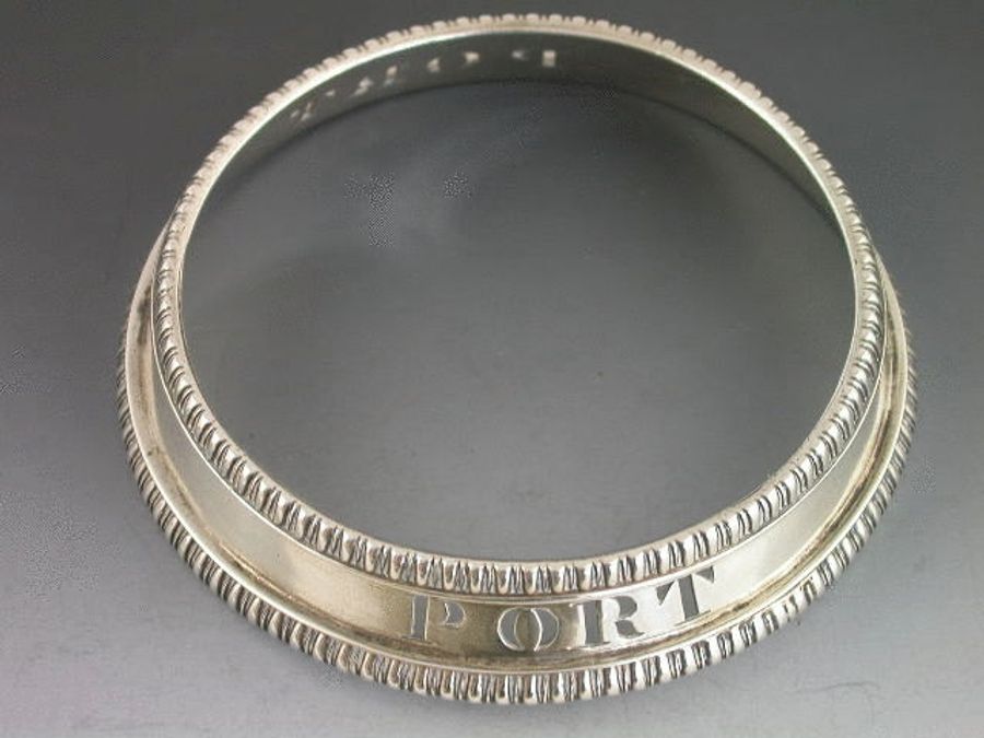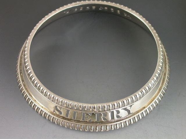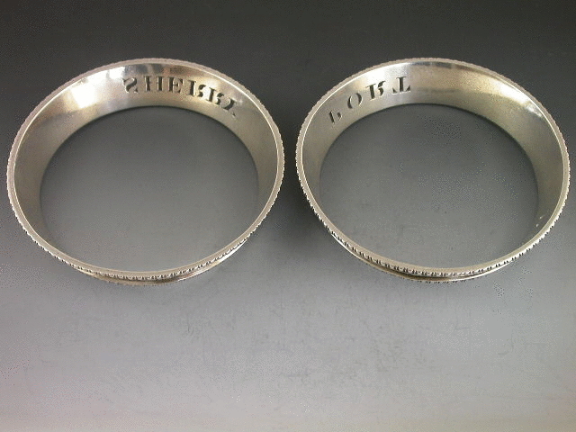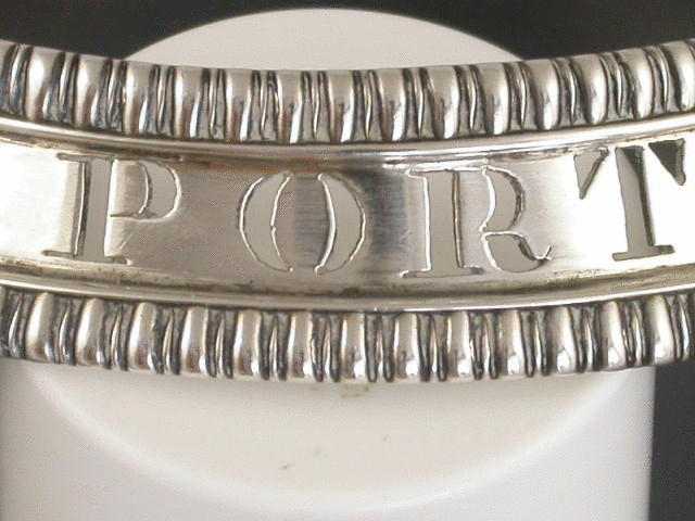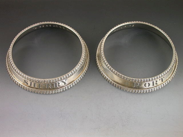 A very fine quality pair of George IV heavy cast silver Wine Labels of bottle collar form, the circular collars with sloping sides and gadrooned rims, pierced for PORT & SHERRY.