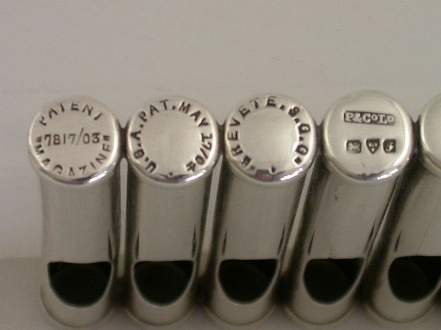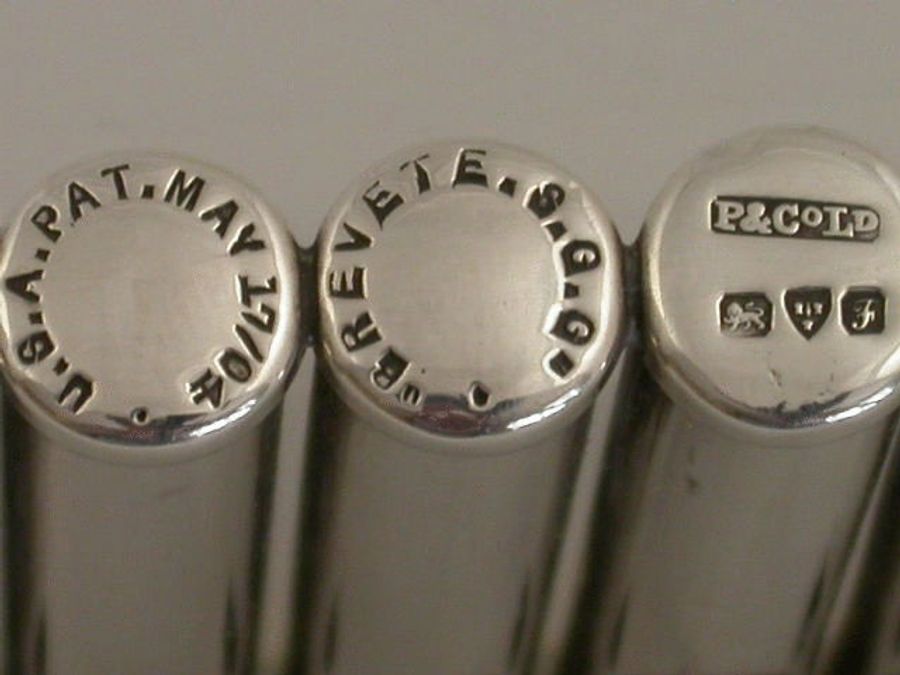 An unusual Edwardian silver Patent Rifle Magazine Cigarette Case, the six compartments for cigarettes made in the form of a rile bullet magazine. Engraved to the base – Magazine Patent 7817/03, U.S.A. Pat. May 17/04, Brevete.S.G.G.