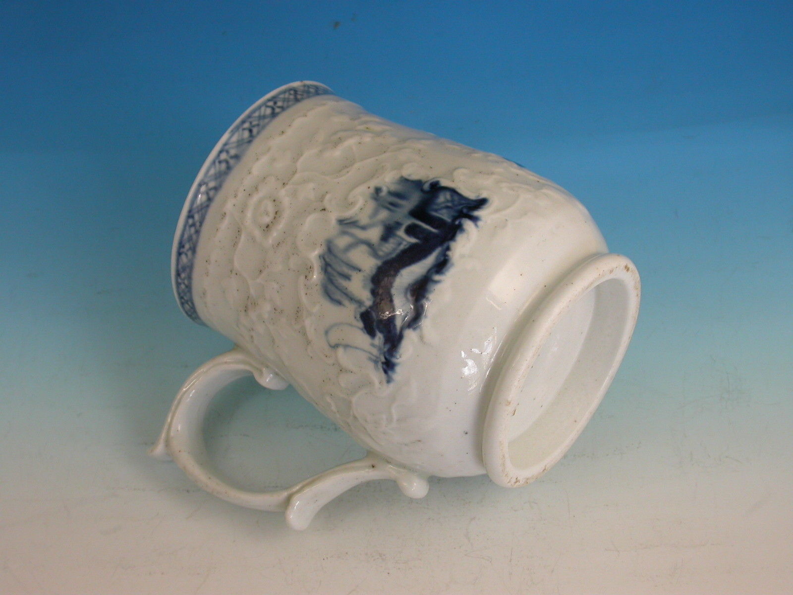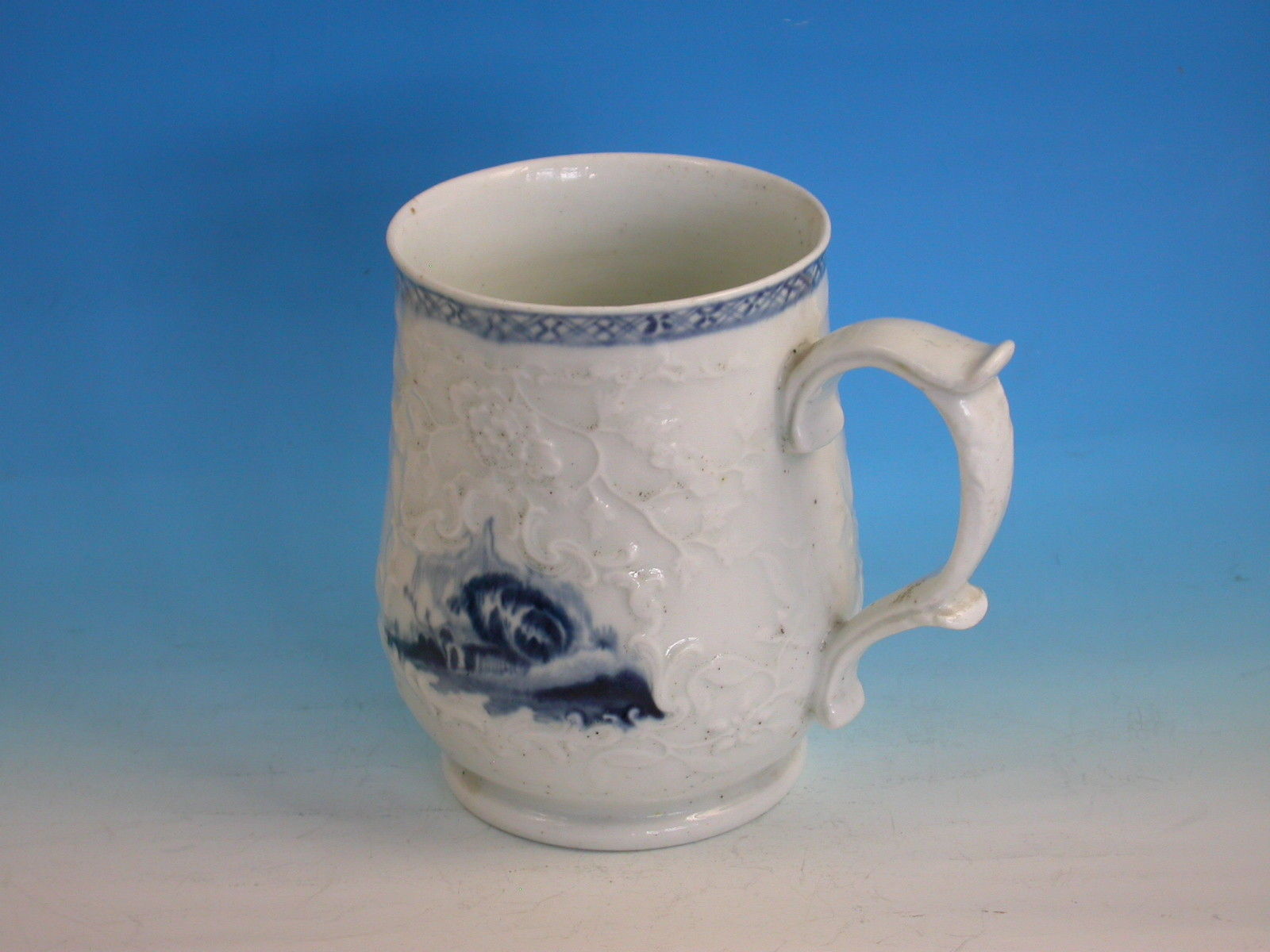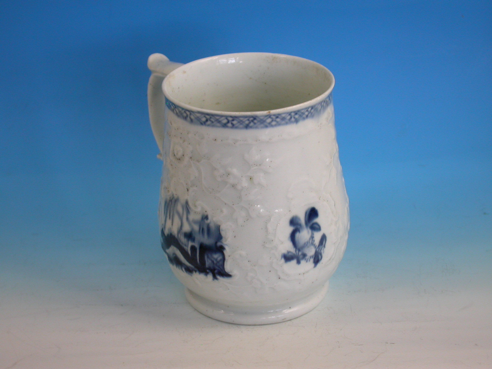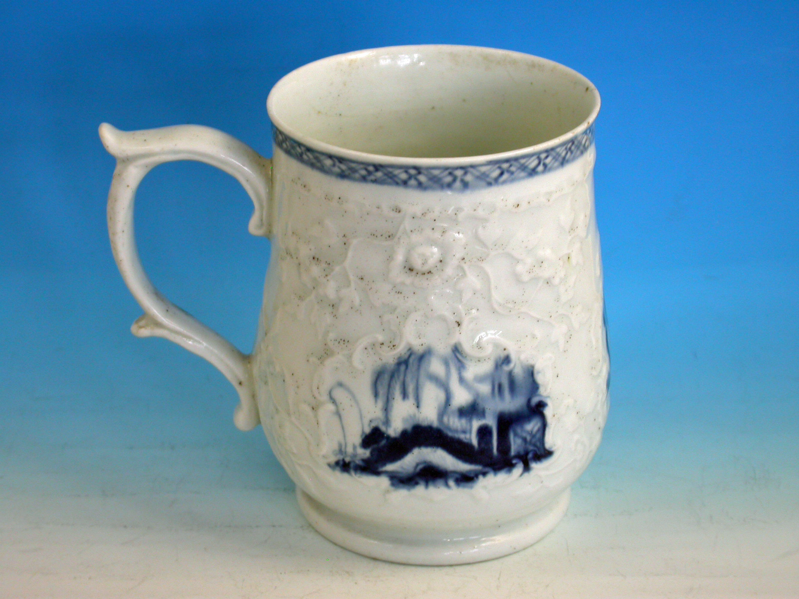 A fine and rare Philip Christians Liverpool Relief moulded Mug of small size, with scroll handle and thumb rest, painted in the scrolled reserve in under-glaze blue with Oriental lakeside scenes including a fisherman on a bridge.