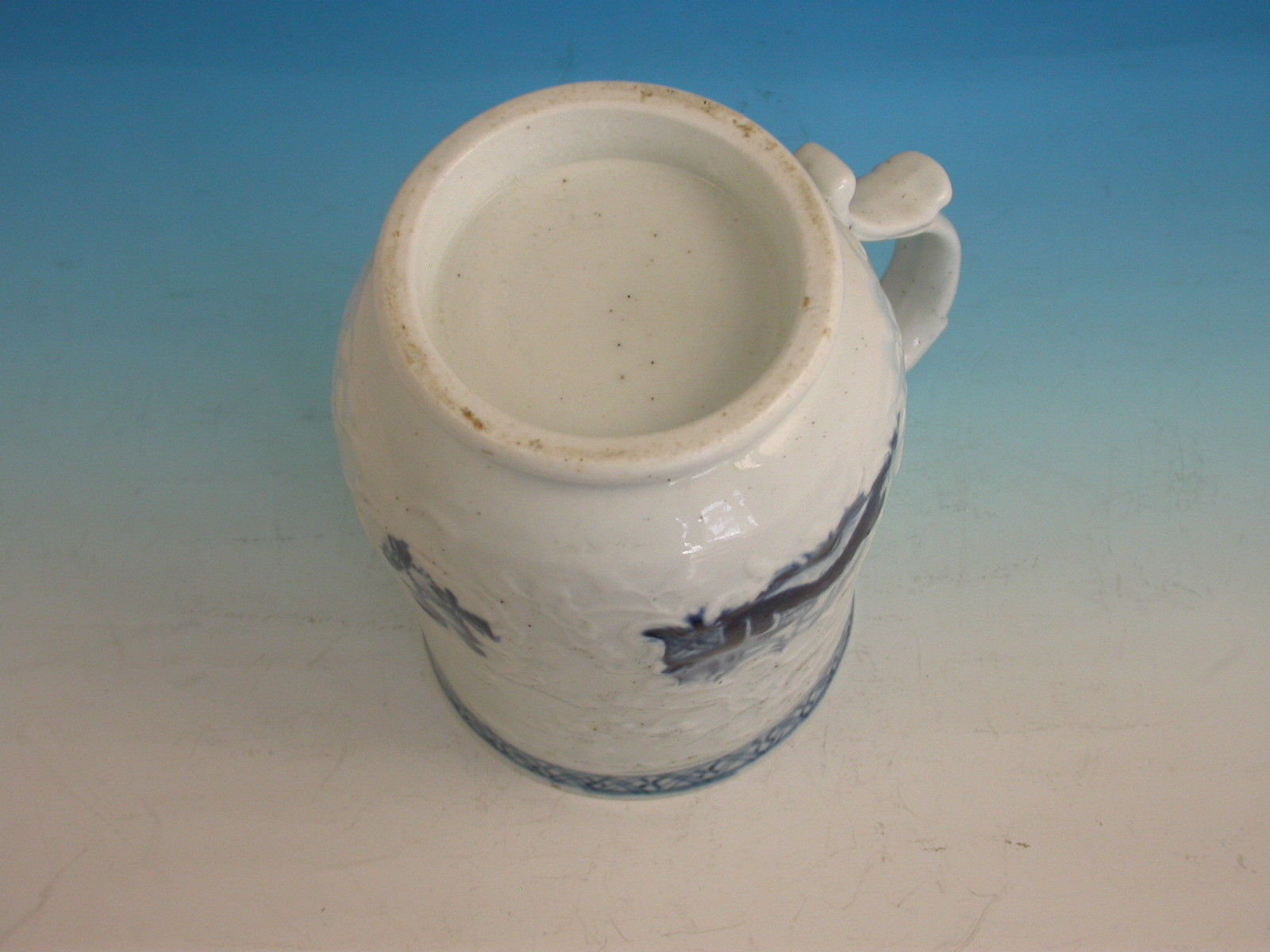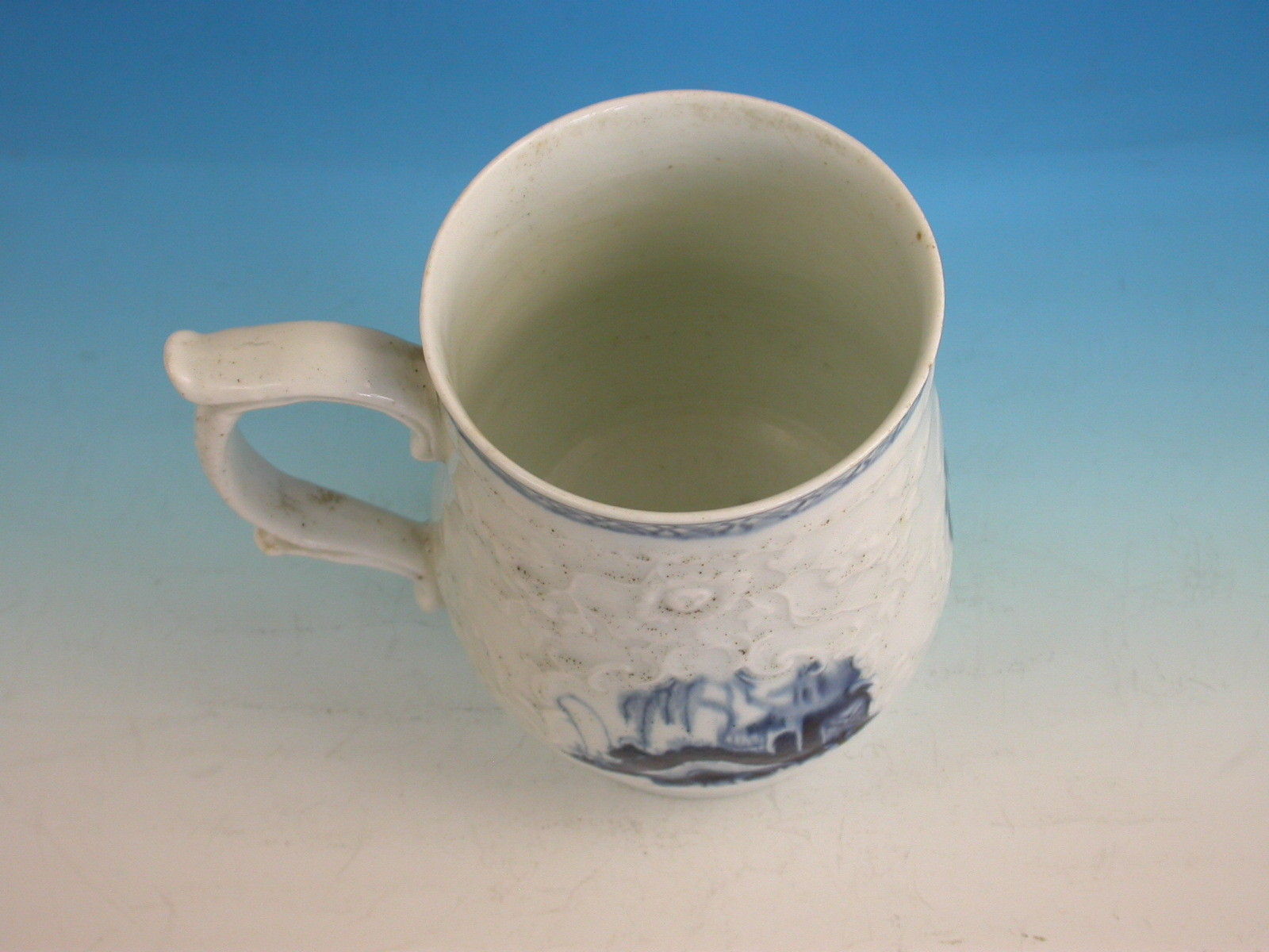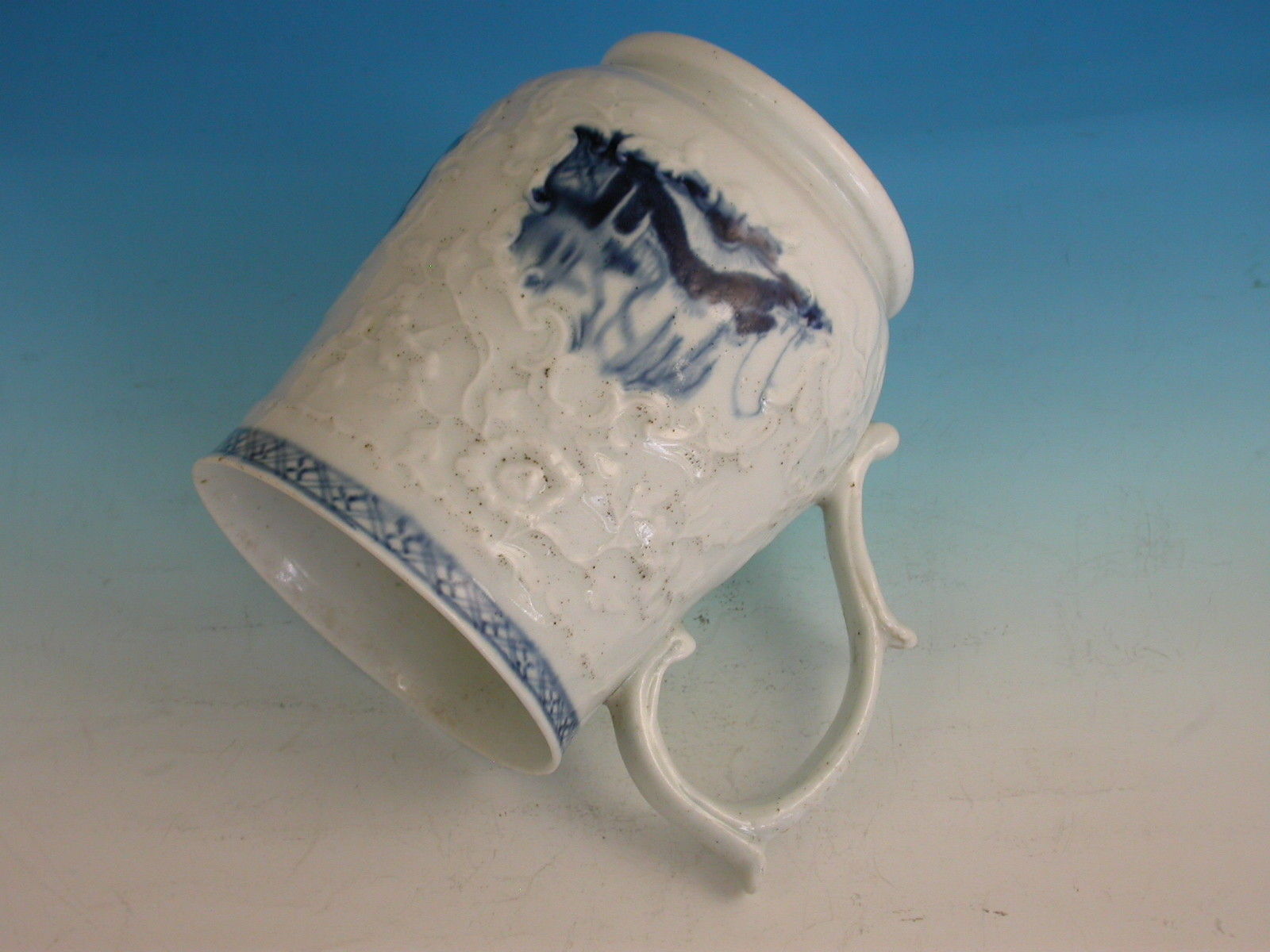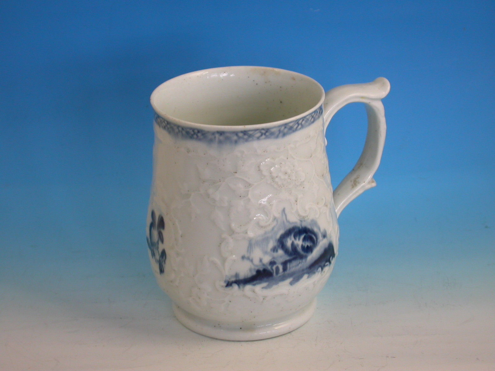 A fine and rare Philip Christians Liverpool Relief moulded Mug of small size, with scroll handle and thumb rest, painted in the scrolled reserve in under-glaze blue with Oriental lakeside scenes including a fisherman on a bridge.