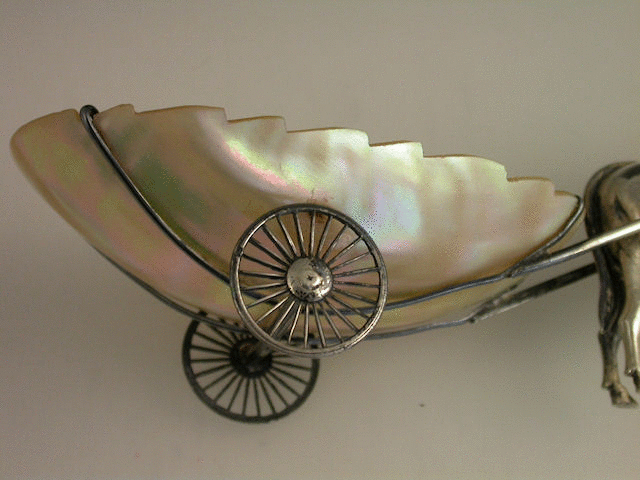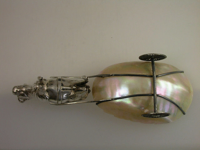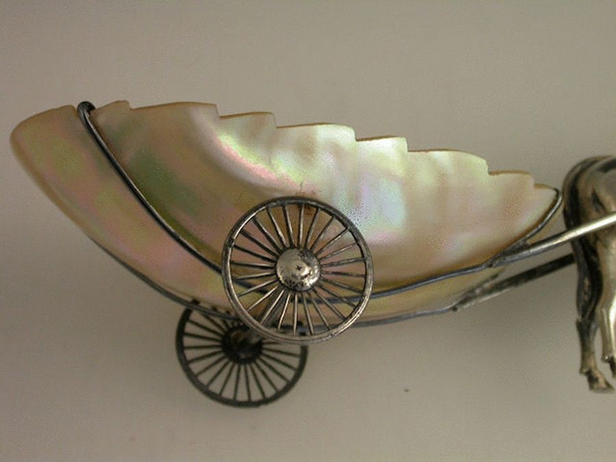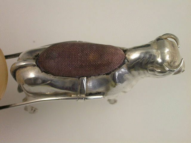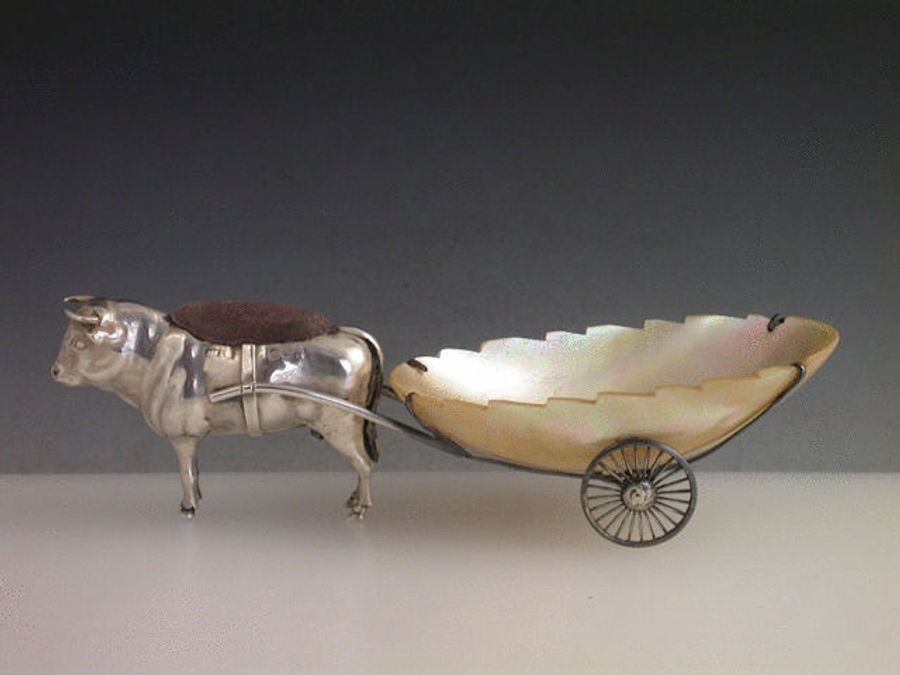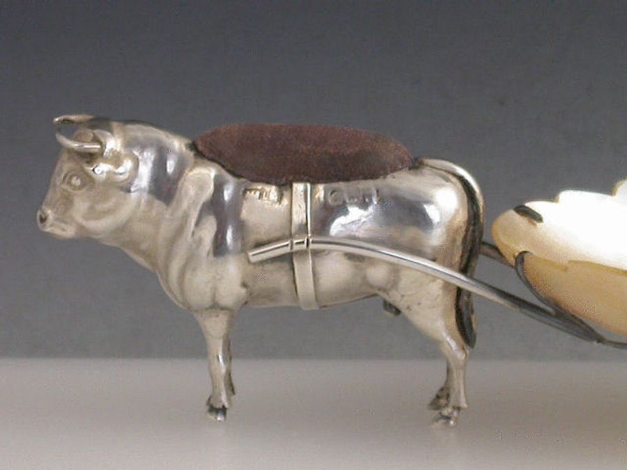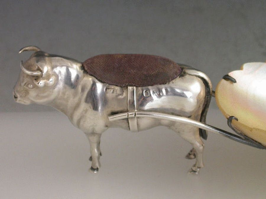 An extremely rare Edwardian silver Pin Cushion modelled as a Bull pulling a shaped Mother of Pearl Cart on two wheels. The Bull realistically modelled with fine detail and complete with original velvet cushion.