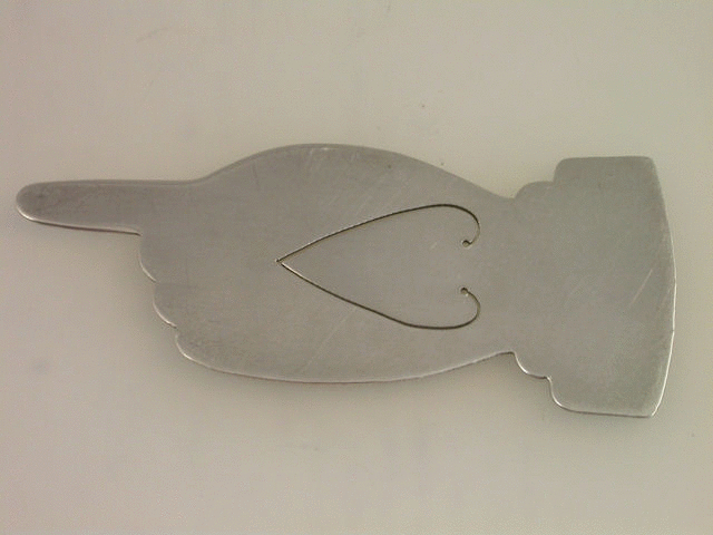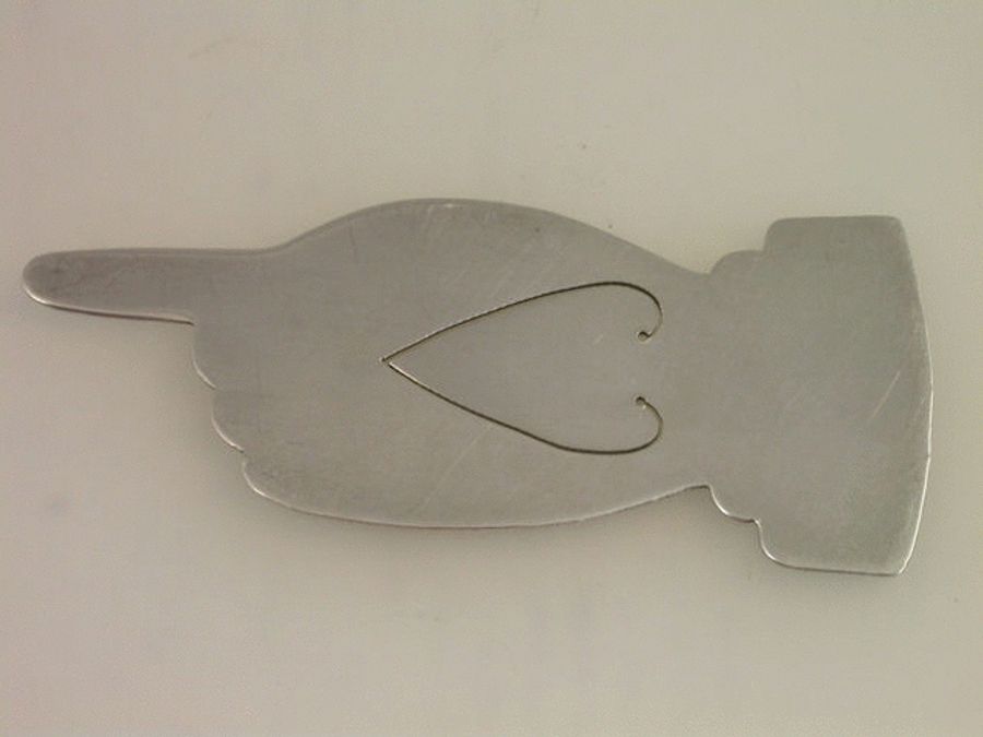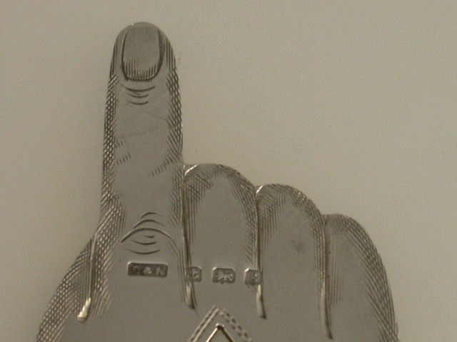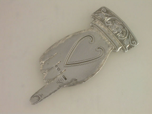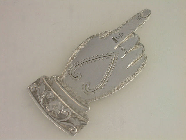 A rare Edwardian silver Bookmark modelled as a hand with pointing index finger, fine bright-cut engraved floral scroll decoration to the cuff and lifelike engraving to the hand.
