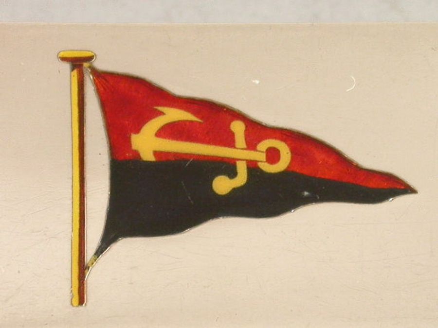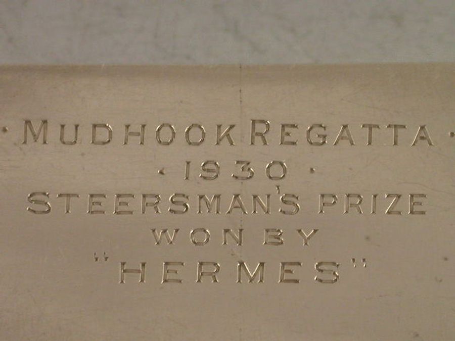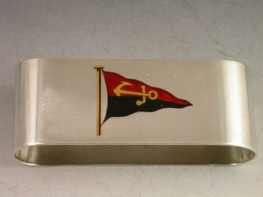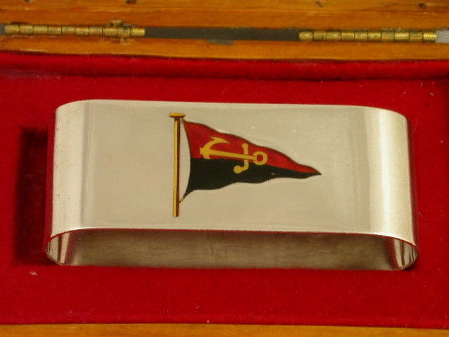 An early 20th century cased silver and enamel Presentation Napkin Ring with sailing interest, of plain rounded compressed form. The front enamelled with a red and black burgee with gold anchor, representing the Mudhook Yacht Club. The reverse with contemporary engraved inscription: 'MUDHOOK REGATTA 1930 STEERSMAN'S PRIZE WON BY 'HERMES'. Complete with original fitted hinged box with a velvet and satin lined interior with the retailers mark of Sorley, 107 - 109 West George St, Glasgow.