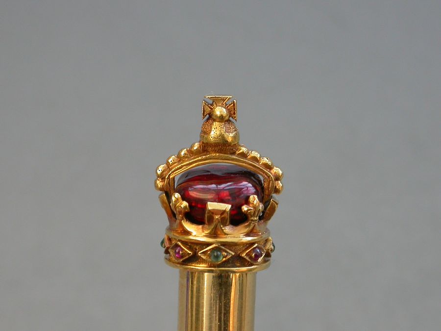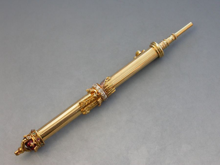 An extremely fine quality Prince of Wales Royal Presentation high carat gold sliding Propelling Pencil, an applied gold band to the centre of the pencil made in the form of The Prince of Wales Feathers rising from a coronet set with old-cut diamonds and supported by scrolls enamelled in blue with the motto 'ICH DIEN', the slider button set with a single old-cut diamond, the terminal formed as a Royal Crown set with emeralds and rubies and with a red enamel cap.