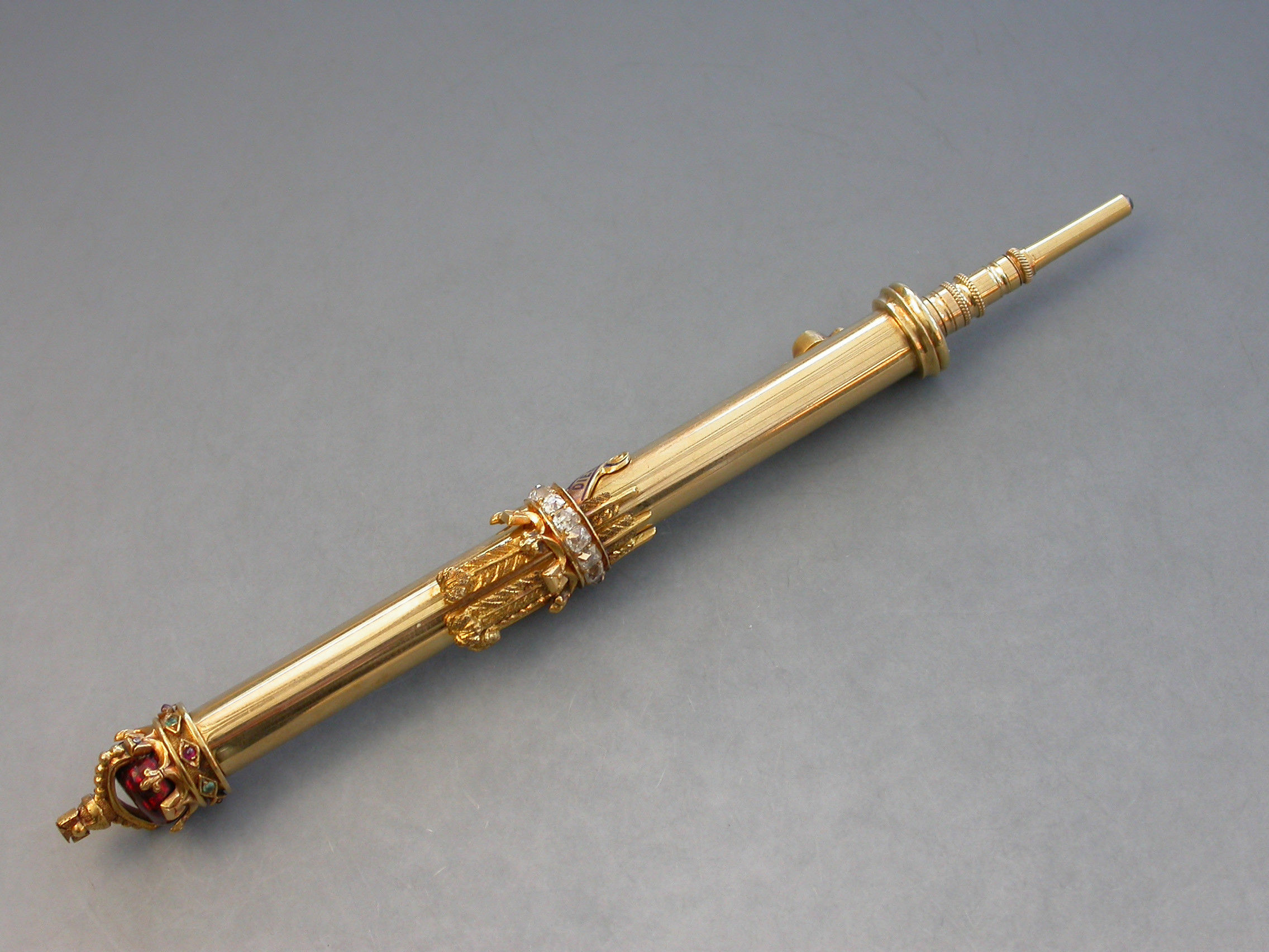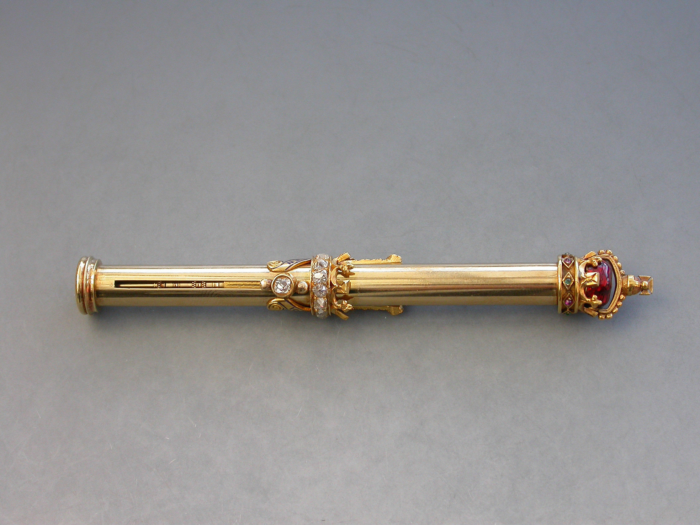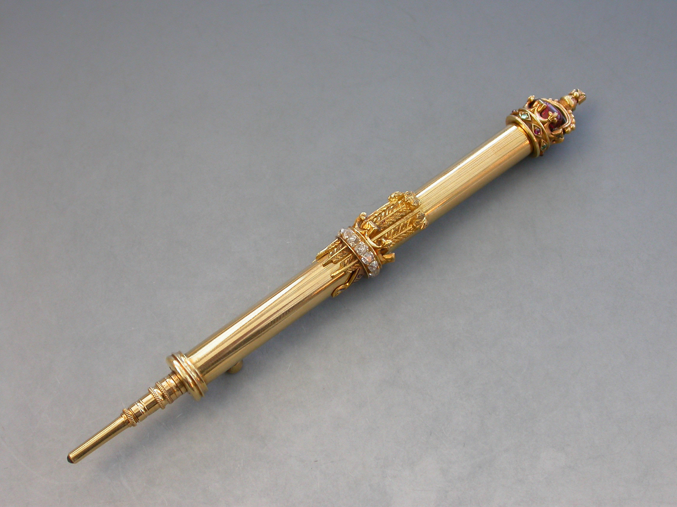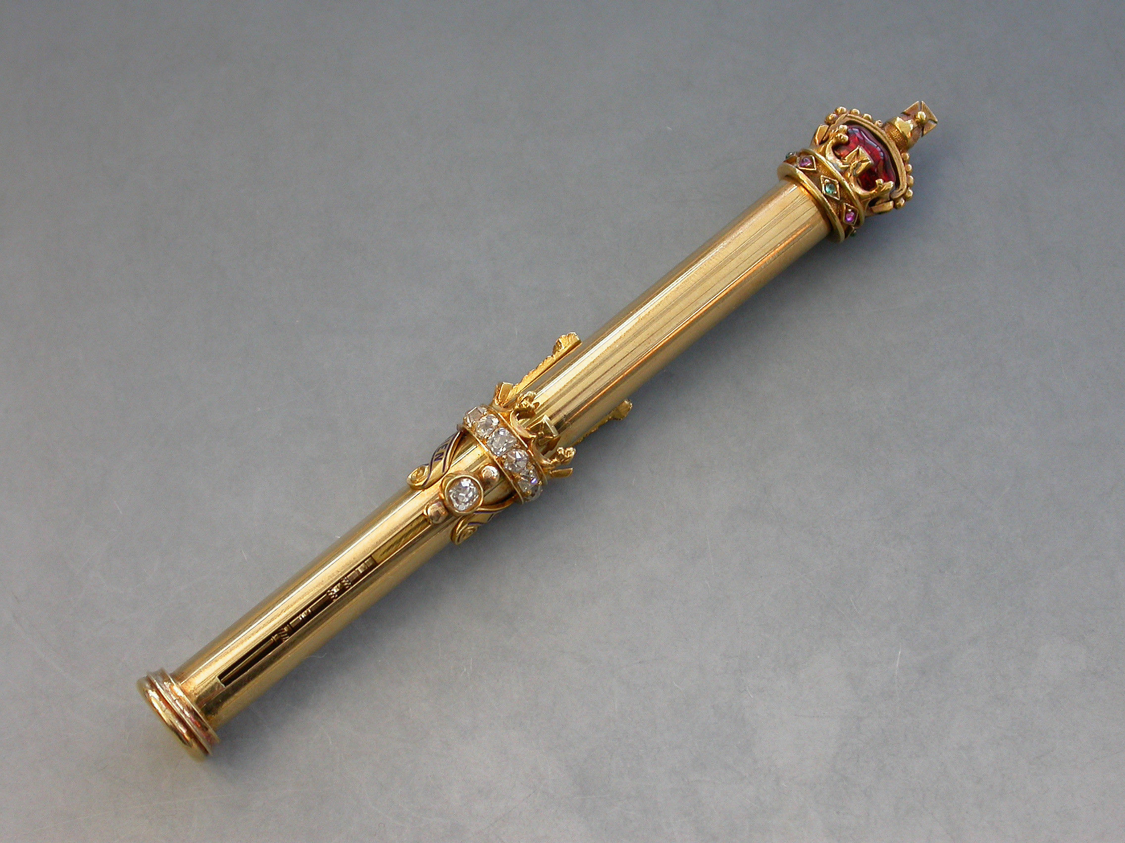 An extremely fine quality Prince of Wales Royal Presentation high carat gold sliding Propelling Pencil, an applied gold band to the centre of the pencil made in the form of The Prince of Wales Feathers rising from a coronet set with old-cut diamonds and supported by scrolls enamelled in blue with the motto 'ICH DIEN', the slider button set with a single old-cut diamond, the terminal formed as a Royal Crown set with emeralds and rubies and with a red enamel cap.