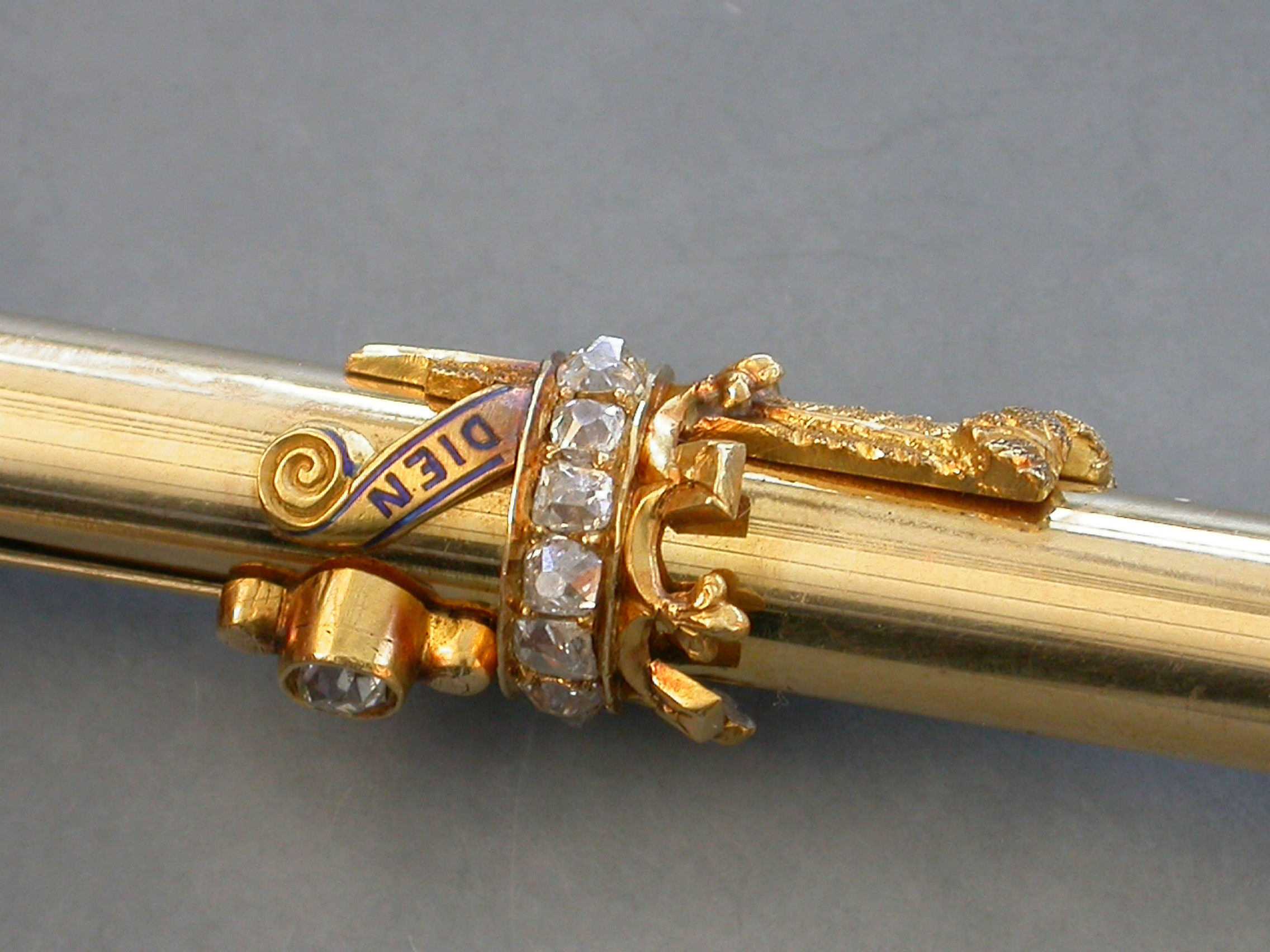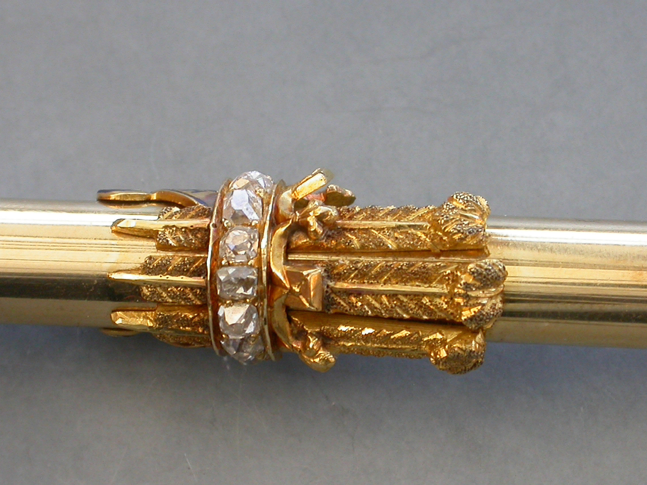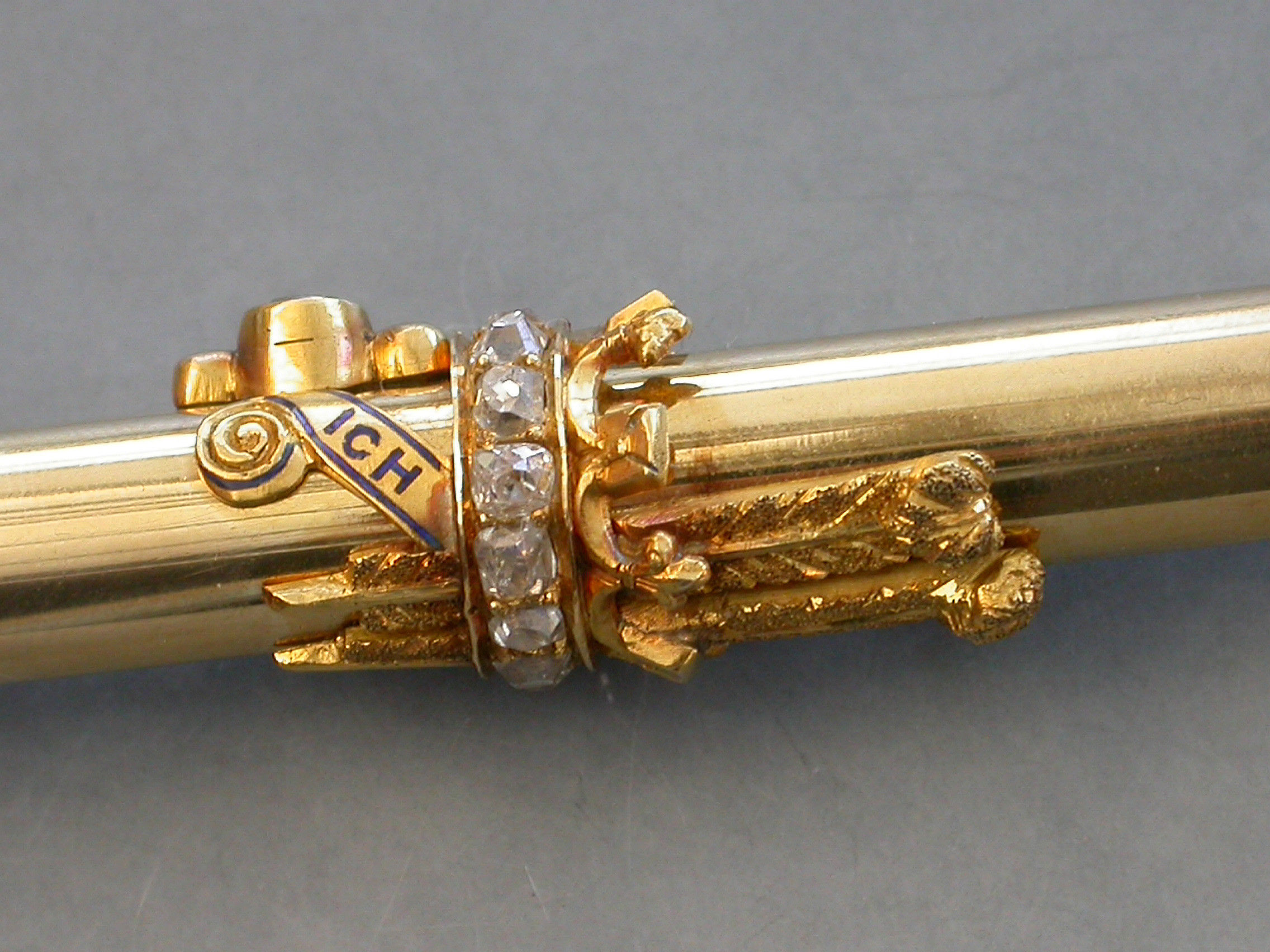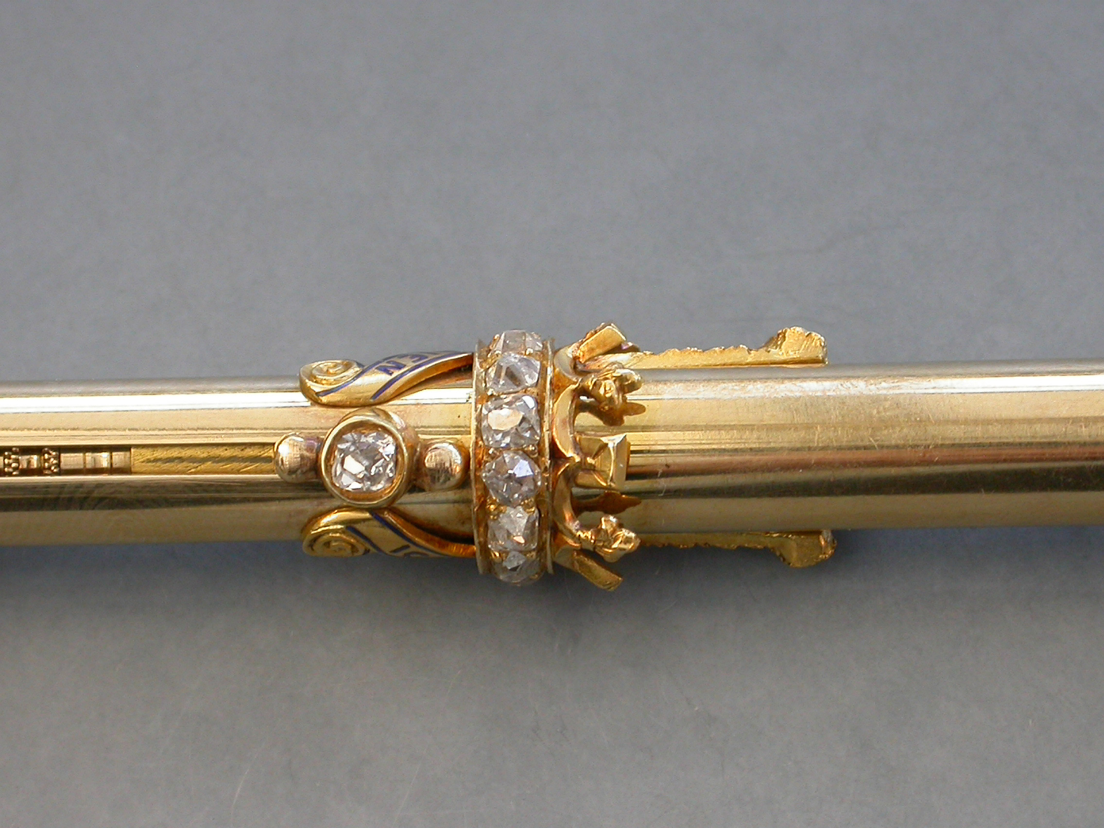 An extremely fine quality Prince of Wales Royal Presentation high carat gold sliding Propelling Pencil, an applied gold band to the centre of the pencil made in the form of The Prince of Wales Feathers rising from a coronet set with old-cut diamonds and supported by scrolls enamelled in blue with the motto 'ICH DIEN', the slider button set with a single old-cut diamond, the terminal formed as a Royal Crown set with emeralds and rubies and with a red enamel cap.
