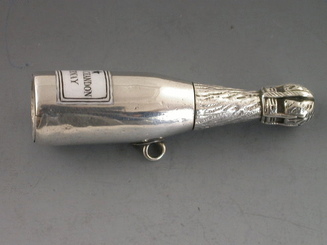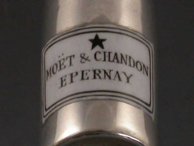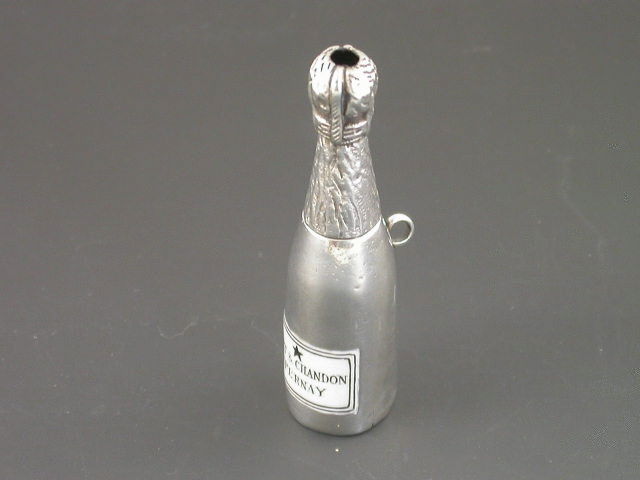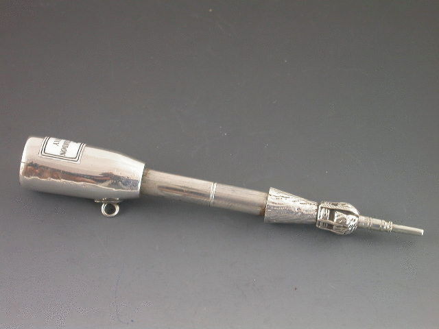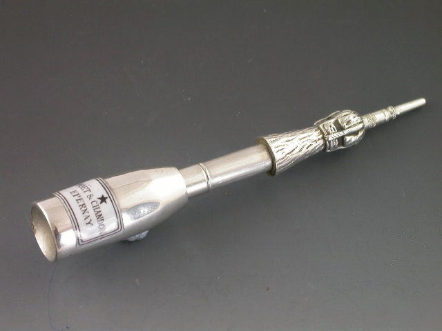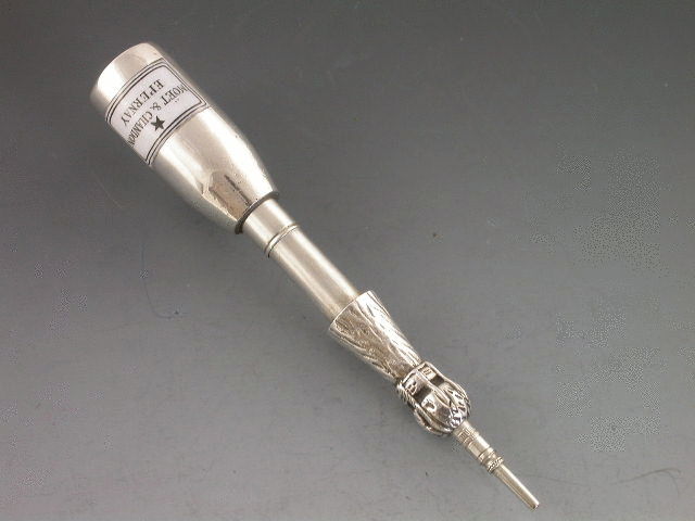 A rare Victorian silver telescopic Propelling Pencil modelled in the form of a Moet & Chandon Champagne Bottle, complete with black and white enamel label.