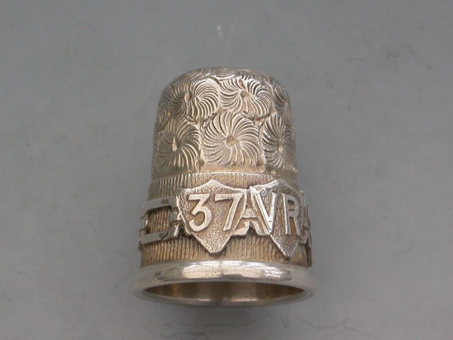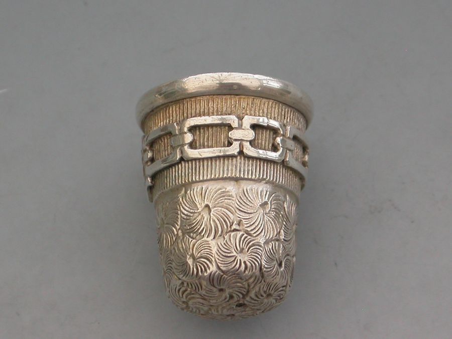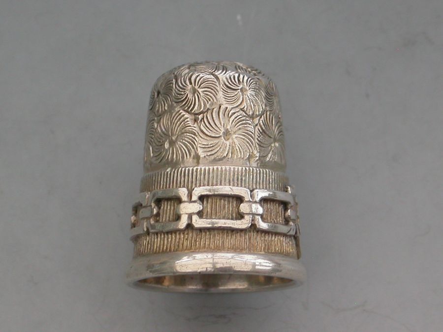 A Victorian silver Thimble made to Commemorate the Diamond Jubilee of Queen Victora (1837-1897) with a ribbed border decorated with applied linked chain with three shields containing '37', 'VR' & '97'. Chased flower heads to the body.
