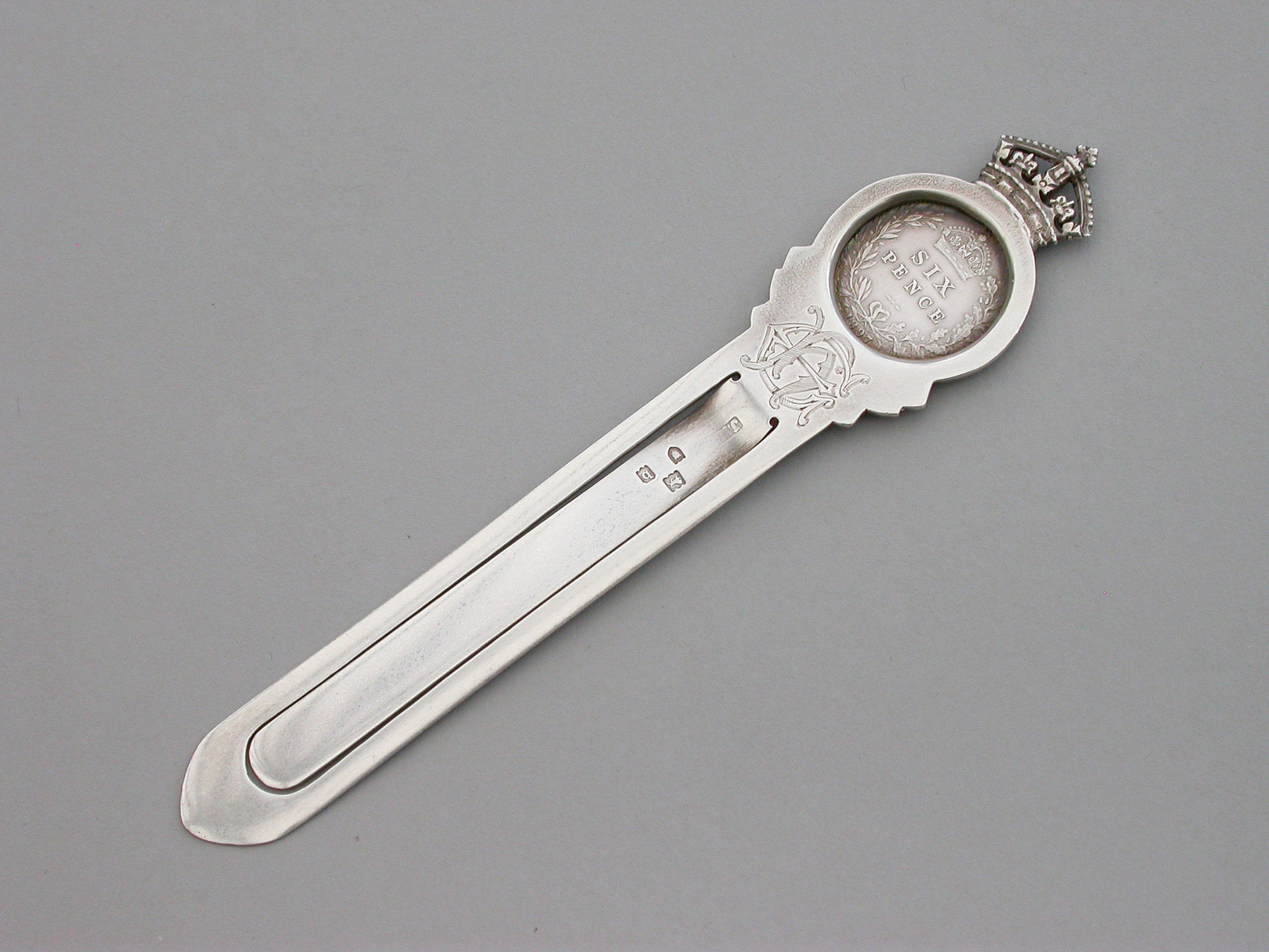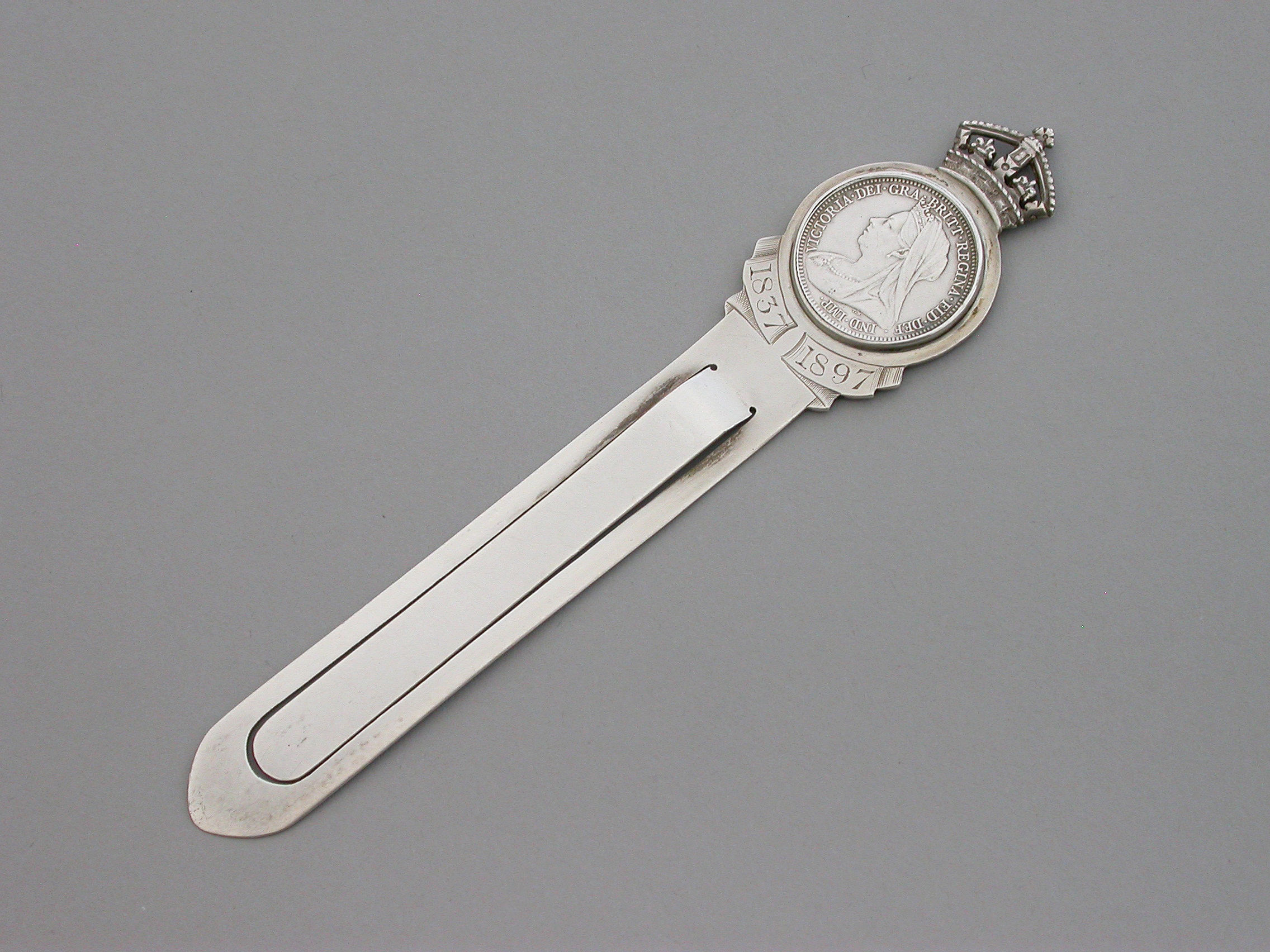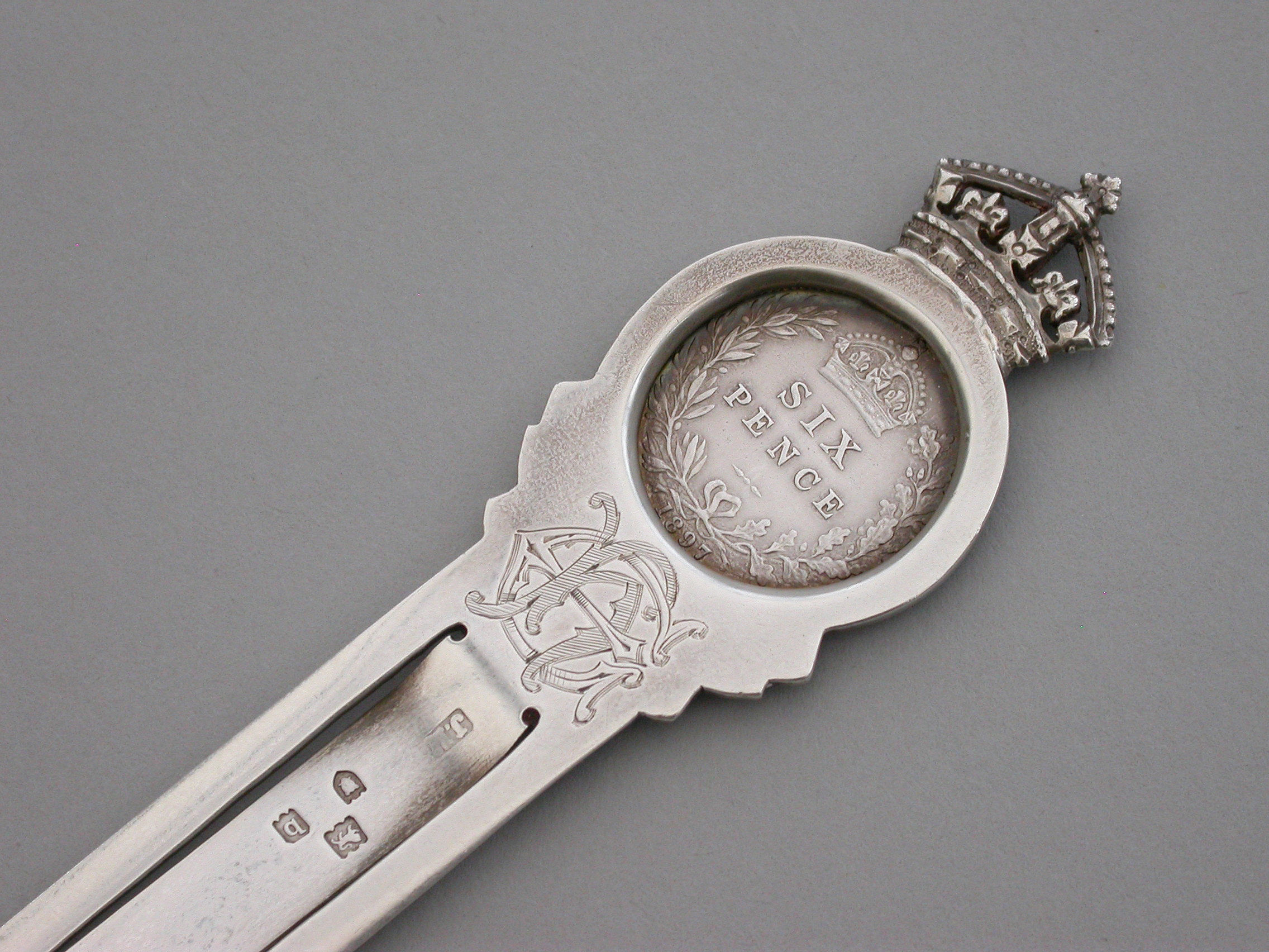 A good quality Victorian silver Bookmark made to commemorate Queen Victoria's Diamond Jubilee in 1897. The circular mount with inset Victorian sixpence surmounted by a Royal Crown and dated 1837-1897. Engraved with contemporary owners initials.