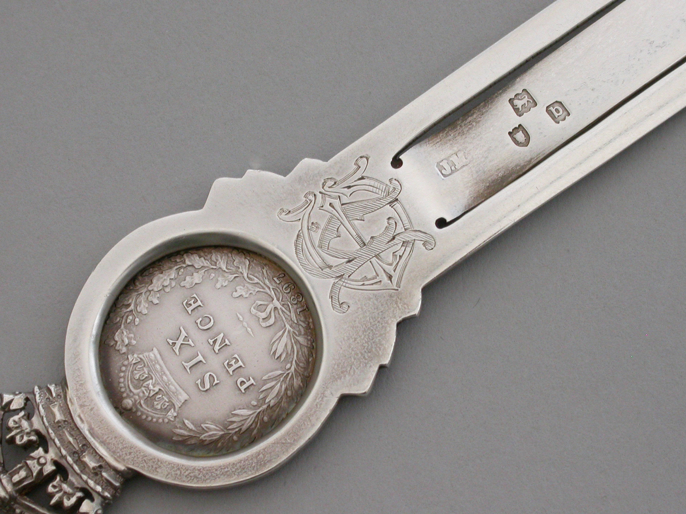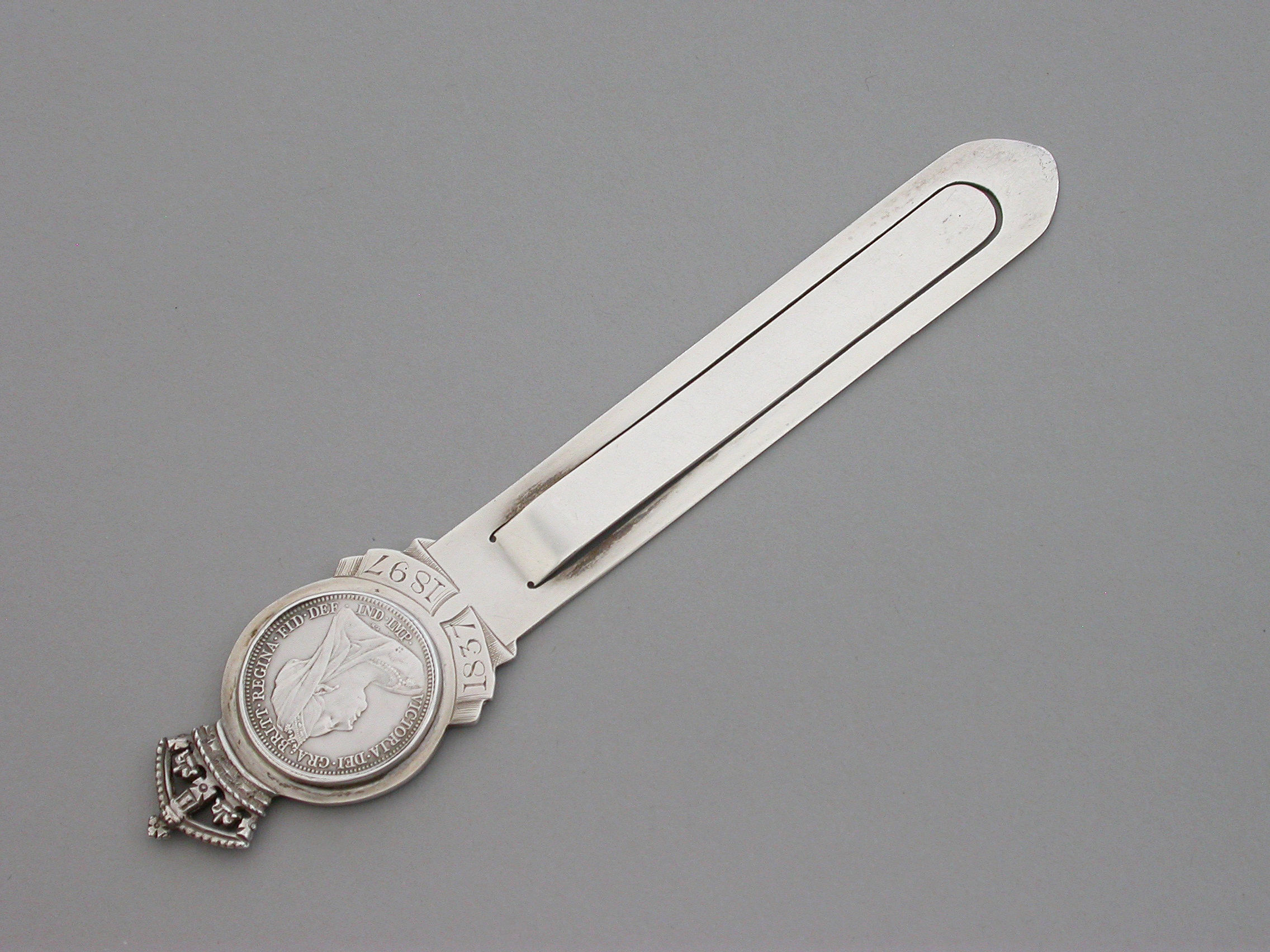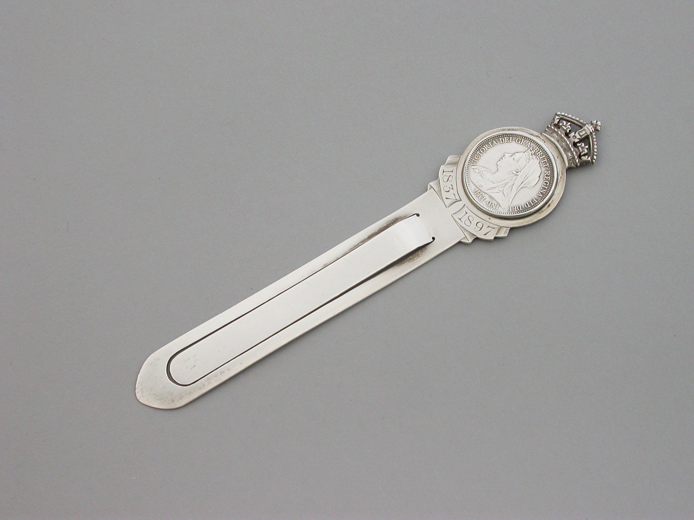 A good quality Victorian silver Bookmark made to commemorate Queen Victoria's Diamond Jubilee in 1897. The circular mount with inset Victorian sixpence surmounted by a Royal Crown and dated 1837-1897. Engraved with contemporary owners initials.