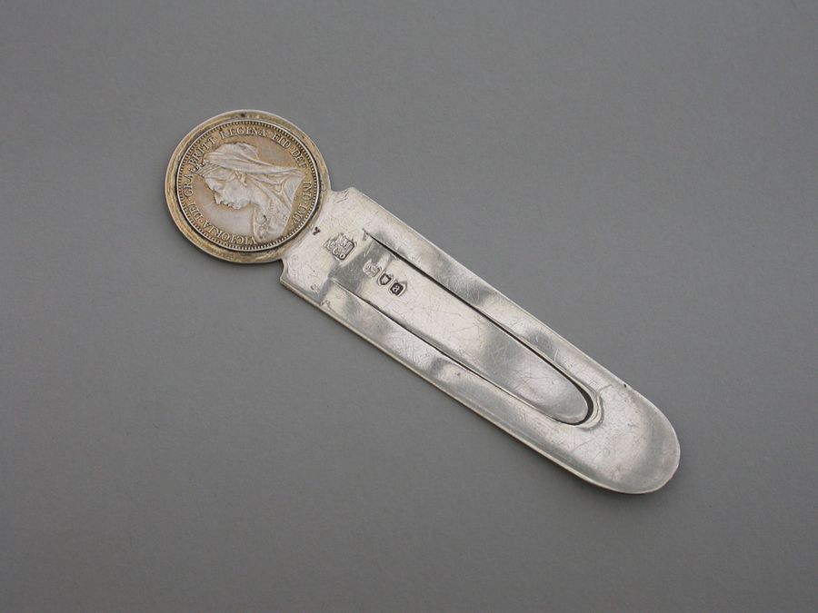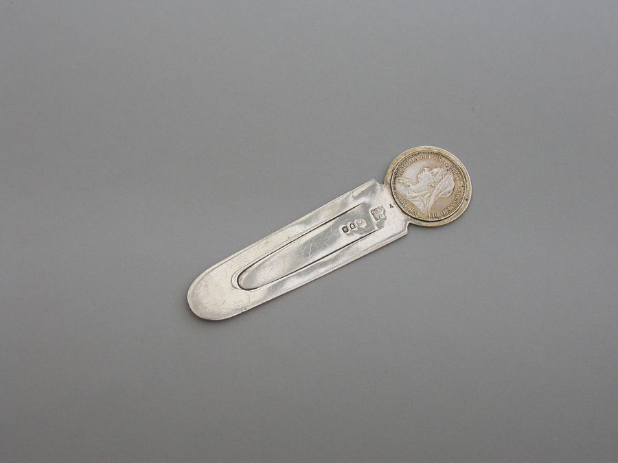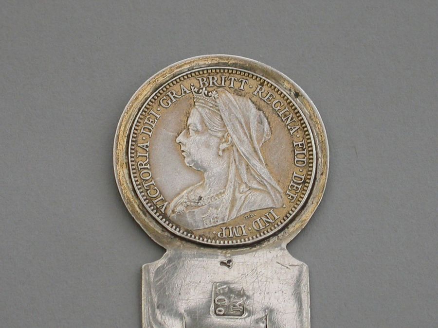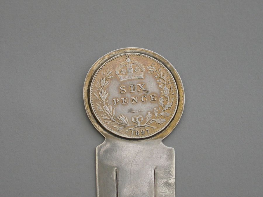 A good Victorian parcel gilt silver Bookmark, the terminal set with a gilded 1897 silver Six Pence Coin. Made to commemorate the Diamond Jubilee of Victoria 1n 1897.