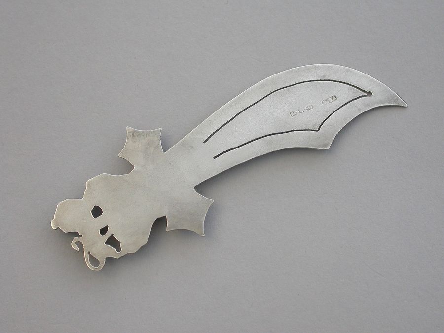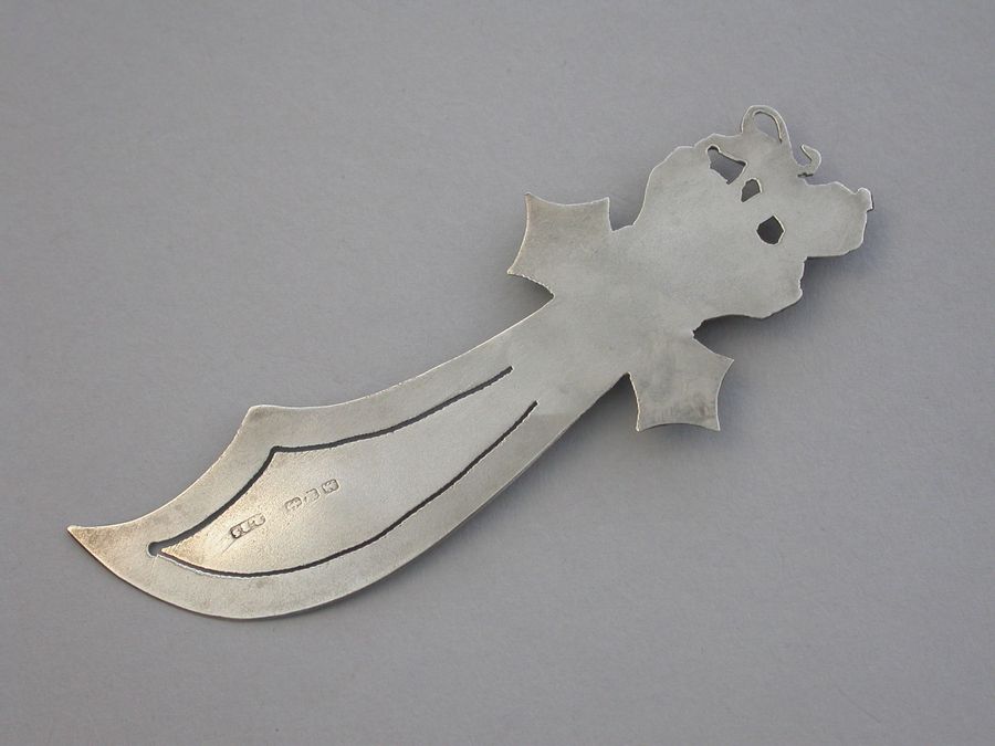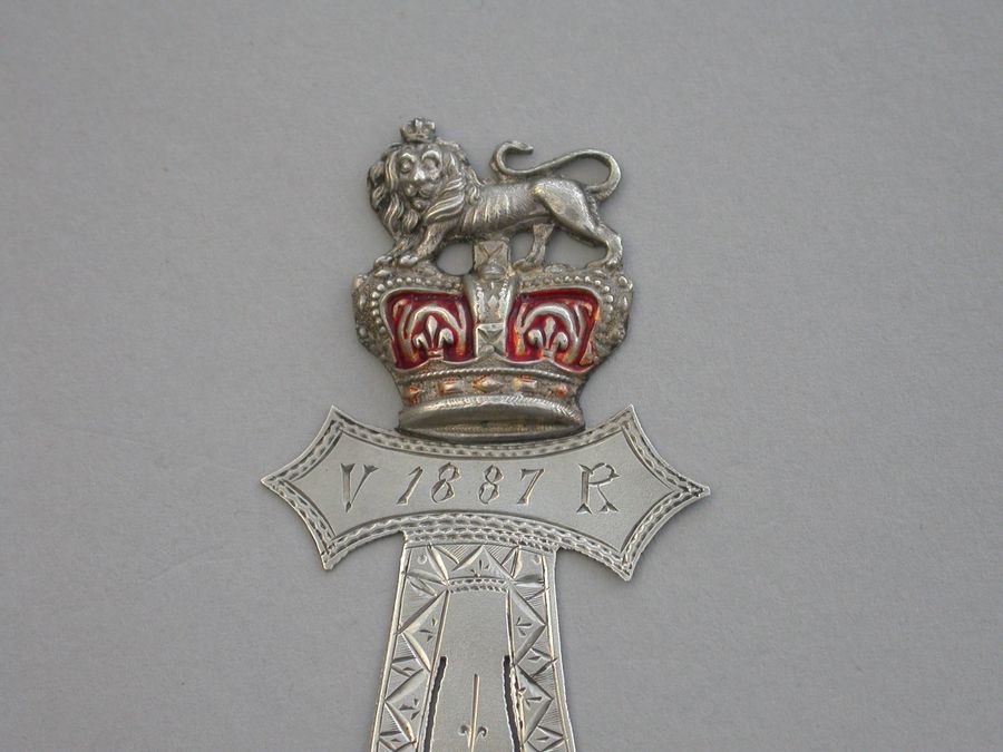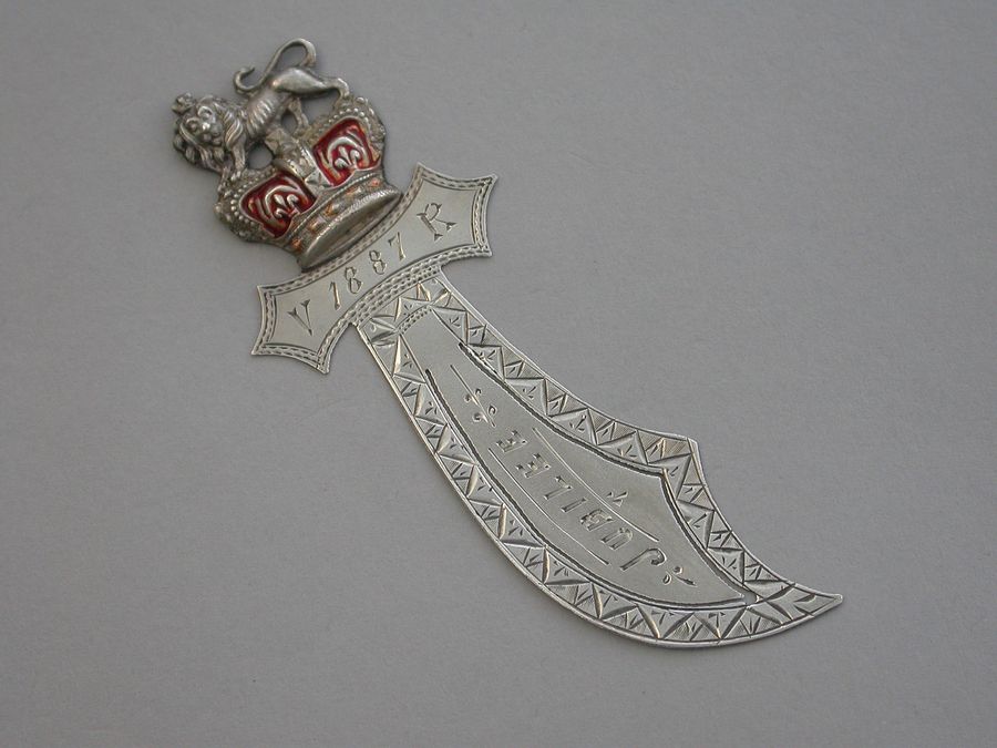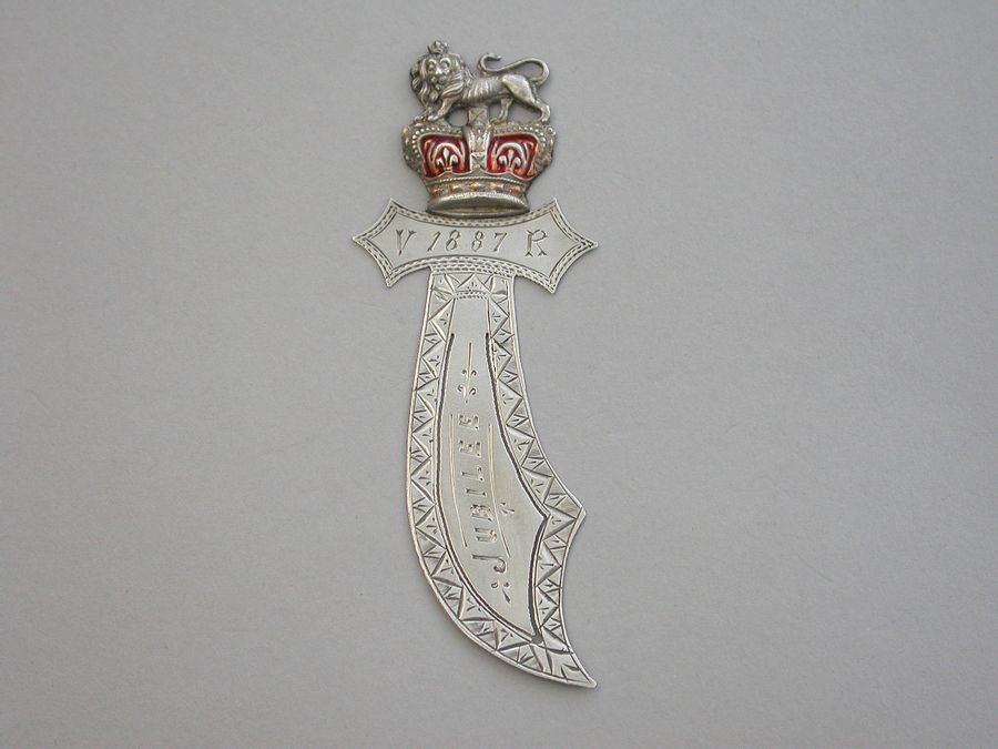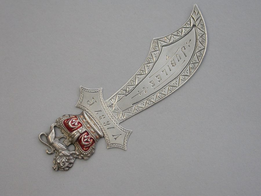 A good Victorian silver Bookmark made to commemorate the Golden Jubilee of Queen Victoria in 1887, of scimitar form with Royal Crown and Lion terminal highlighted in red. The blade engraved ""V 1887 R"" and ""JUBILEE"".