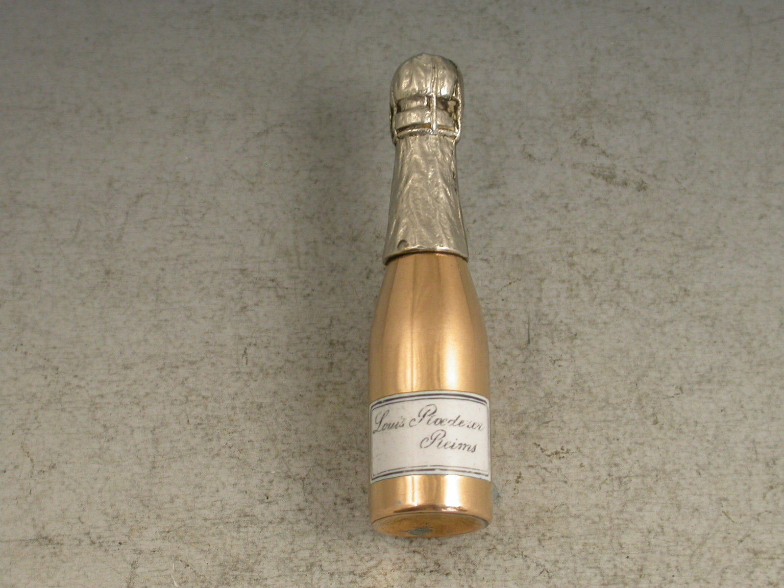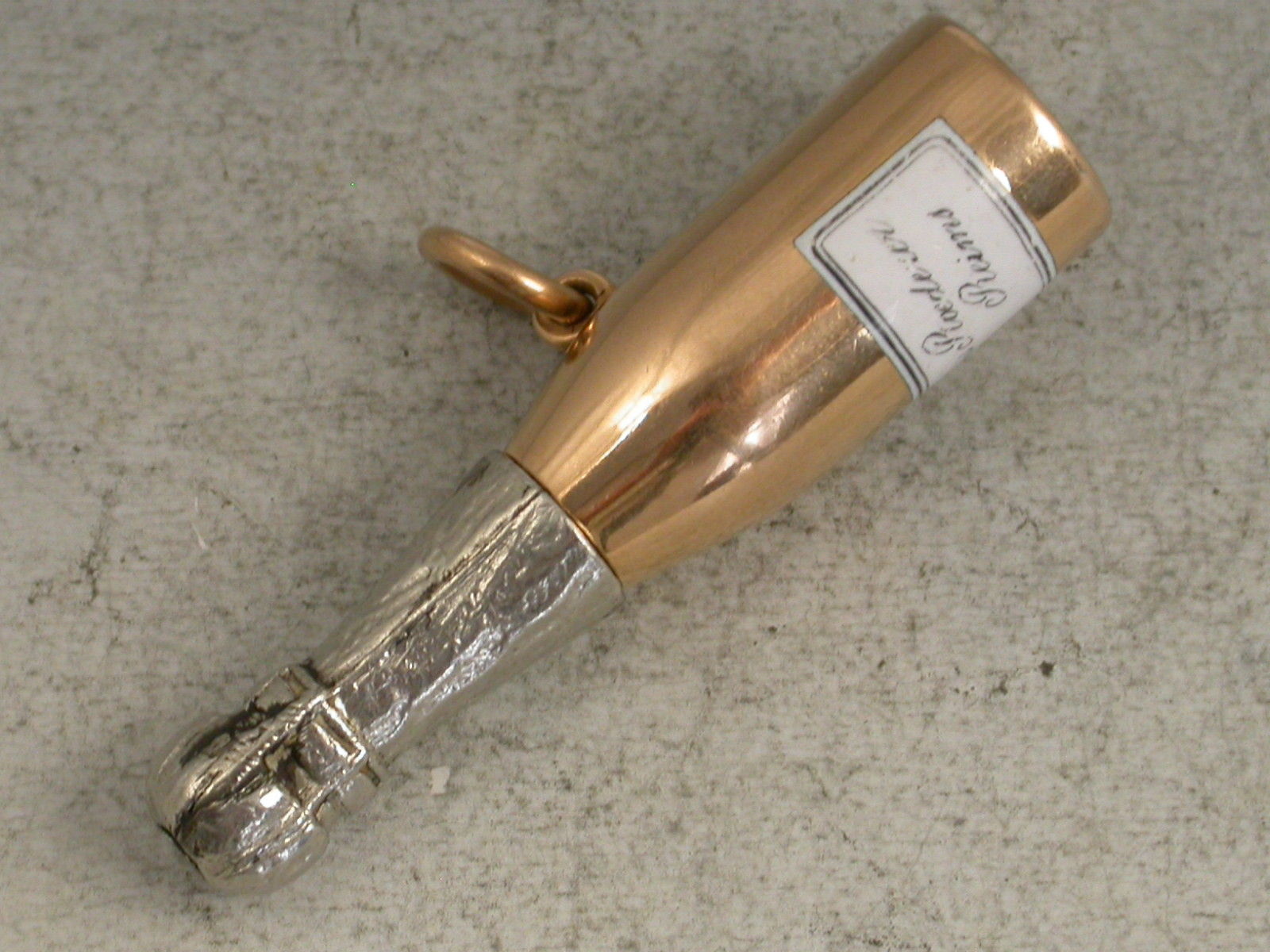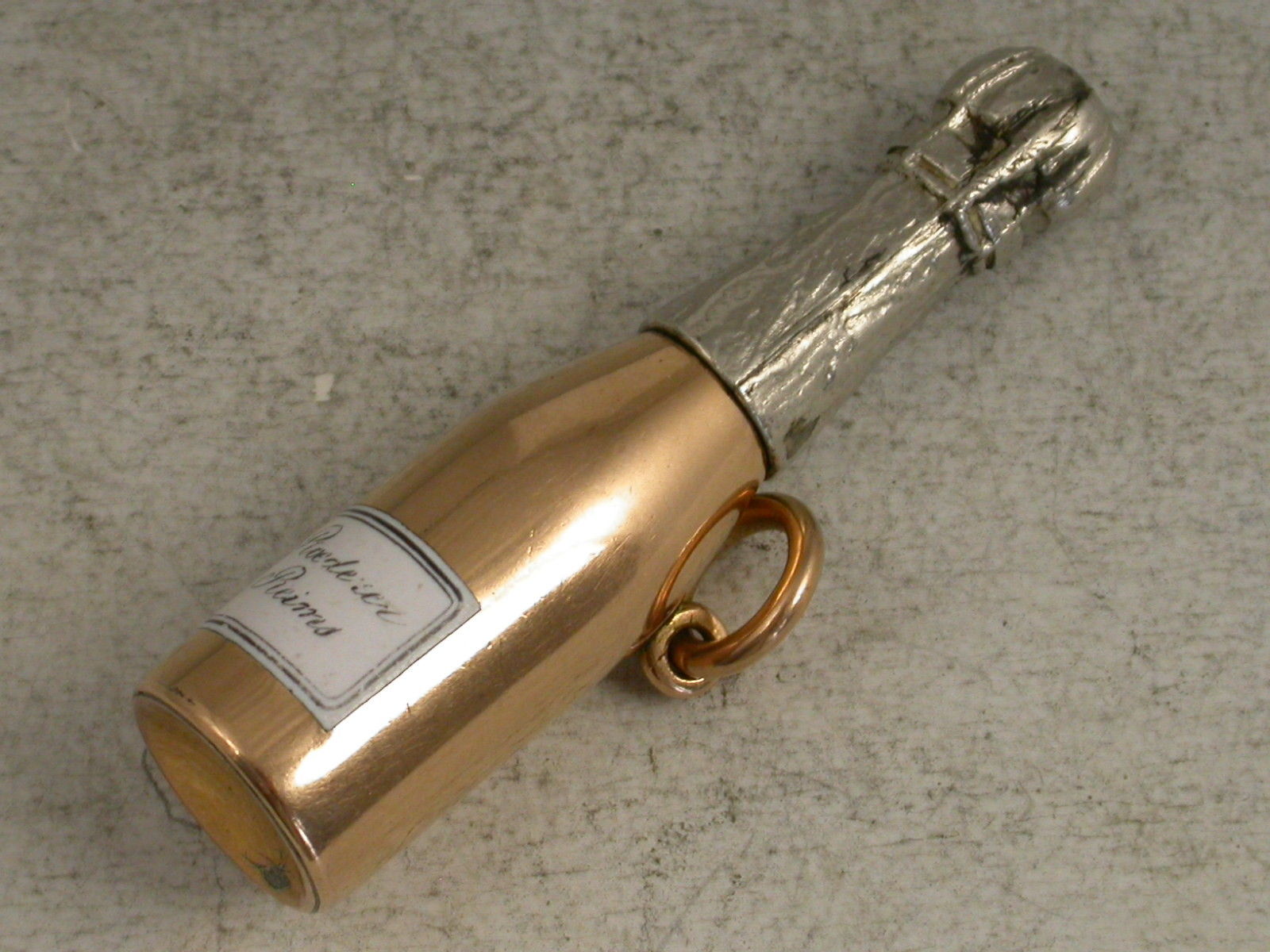 An extremely rare Victorian 18 carat gold, silver and enamel novelty telescopic Propelling Pencil modelled as a Champagne Bottle, with white enamel label for Louis Roederer, Reims. Attached gold suspension ring. The barrel stamped with the retailer's mark of J & G Beasley, 34 St James's Street, 18 Ct.