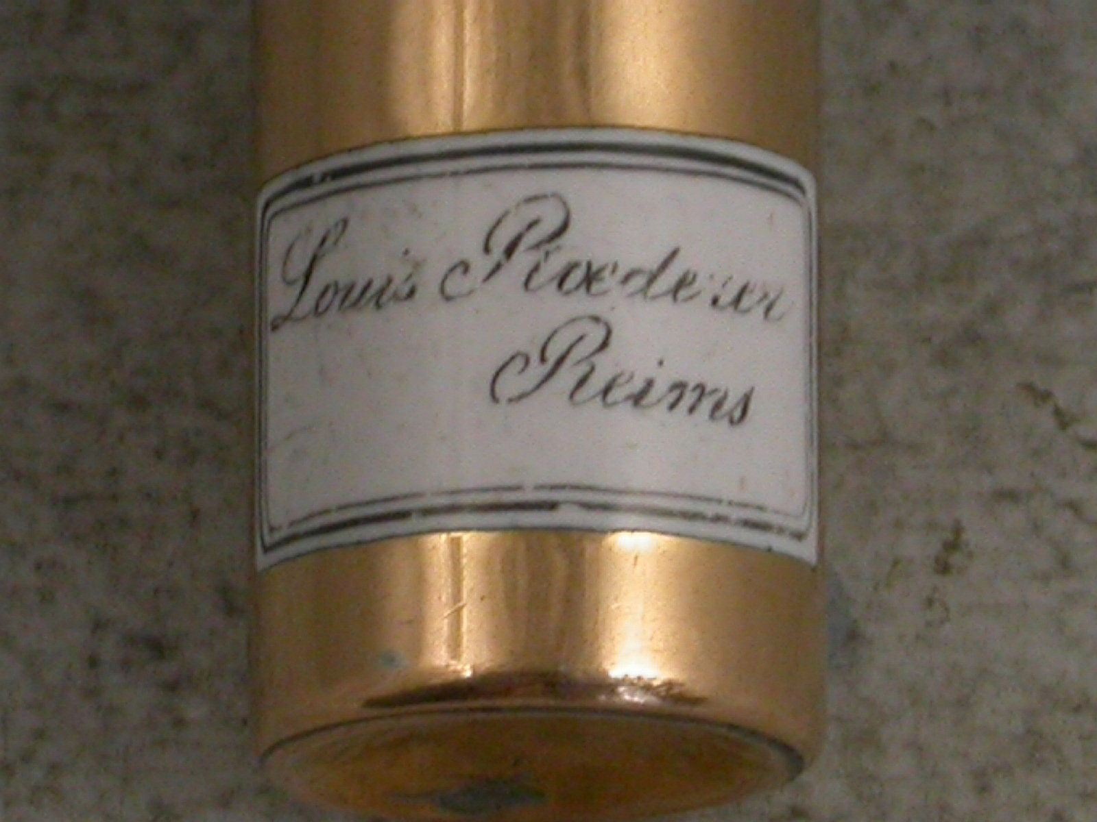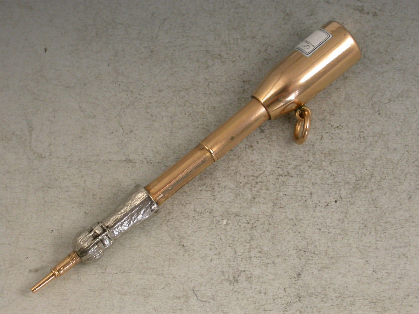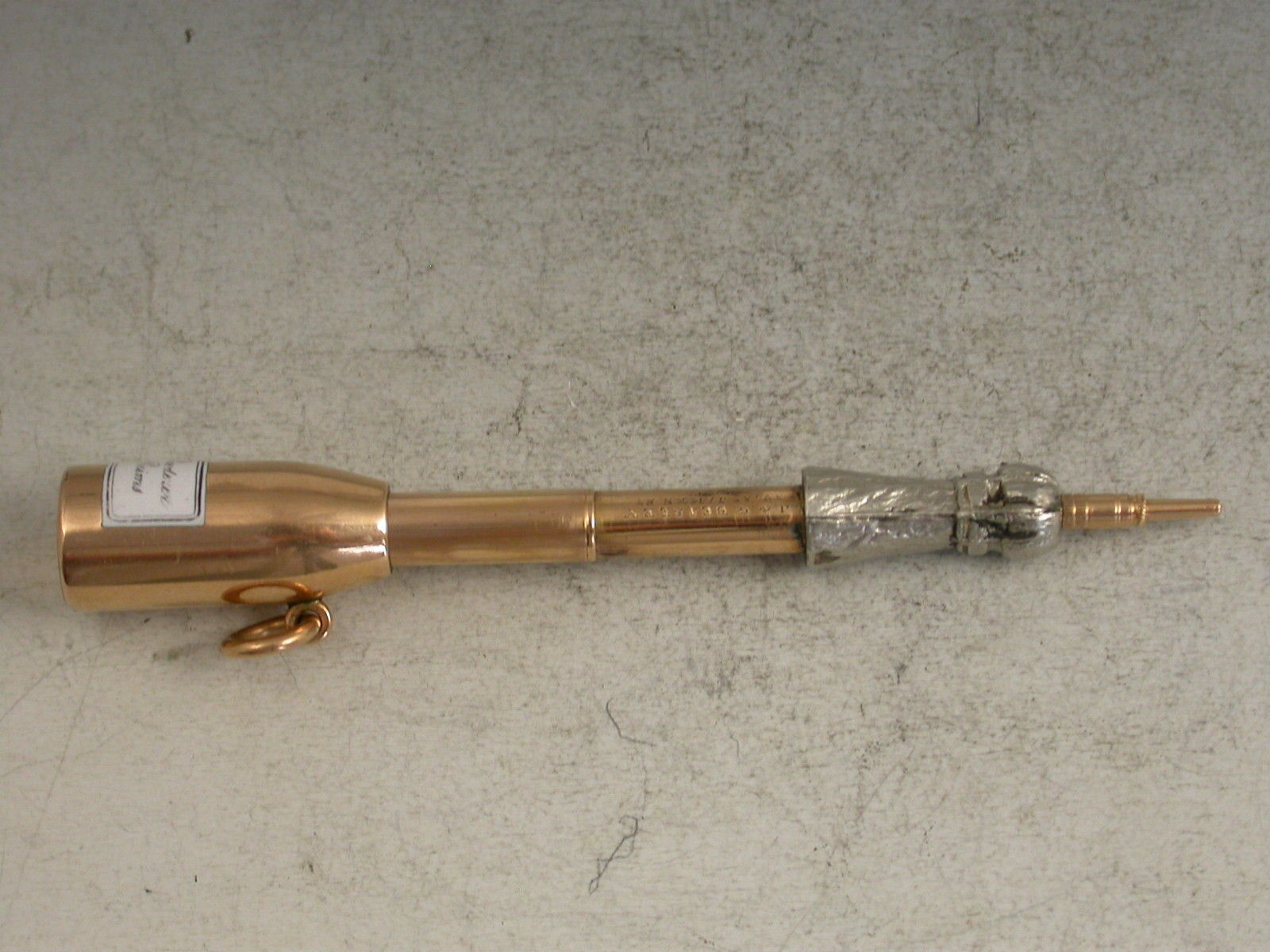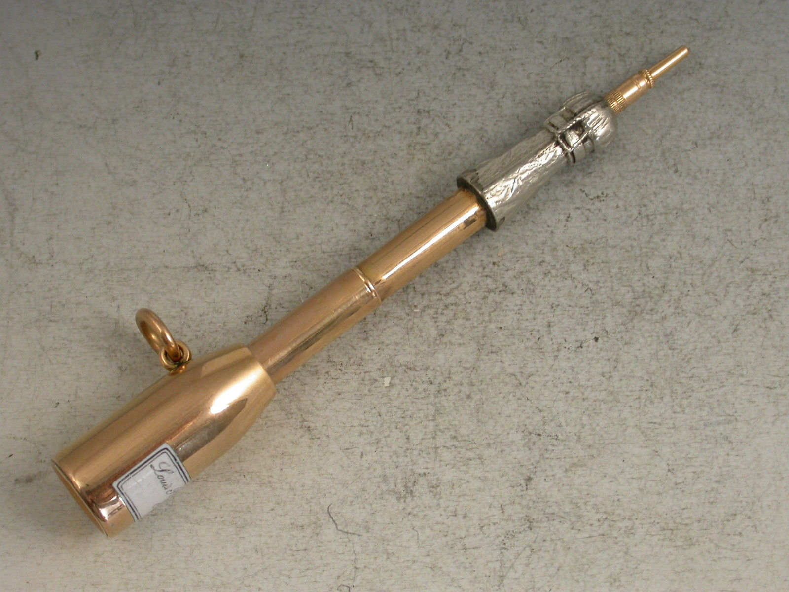 An extremely rare Victorian 18 carat gold, silver and enamel novelty telescopic Propelling Pencil modelled as a Champagne Bottle, with white enamel label for Louis Roederer, Reims. Attached gold suspension ring. The barrel stamped with the retailer's mark of J & G Beasley, 34 St James's Street, 18 Ct.
