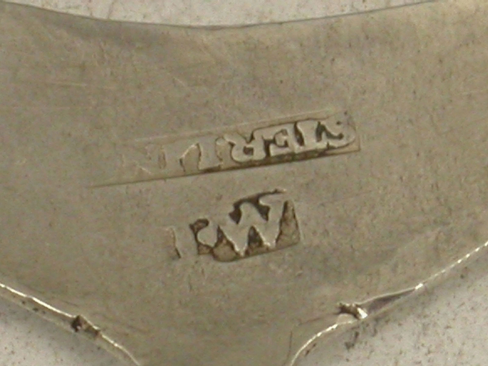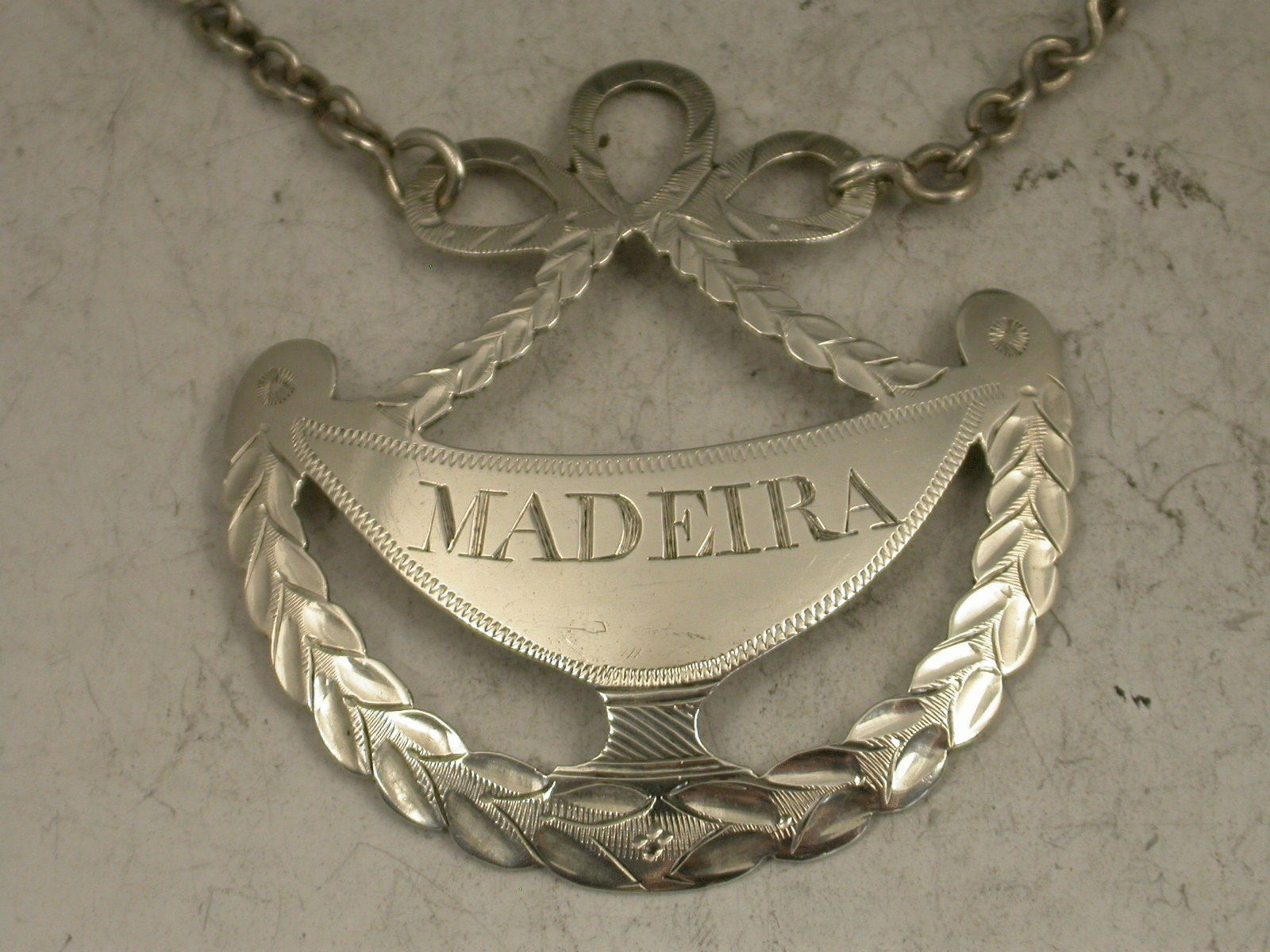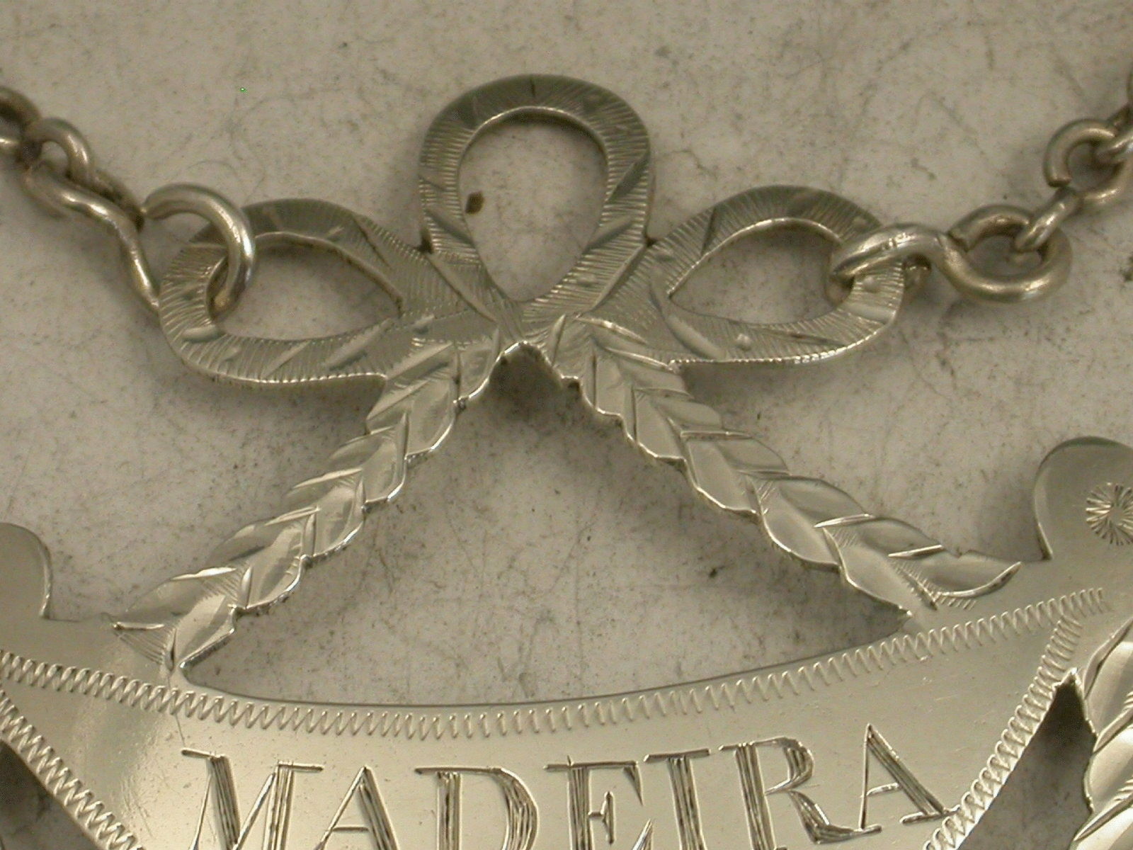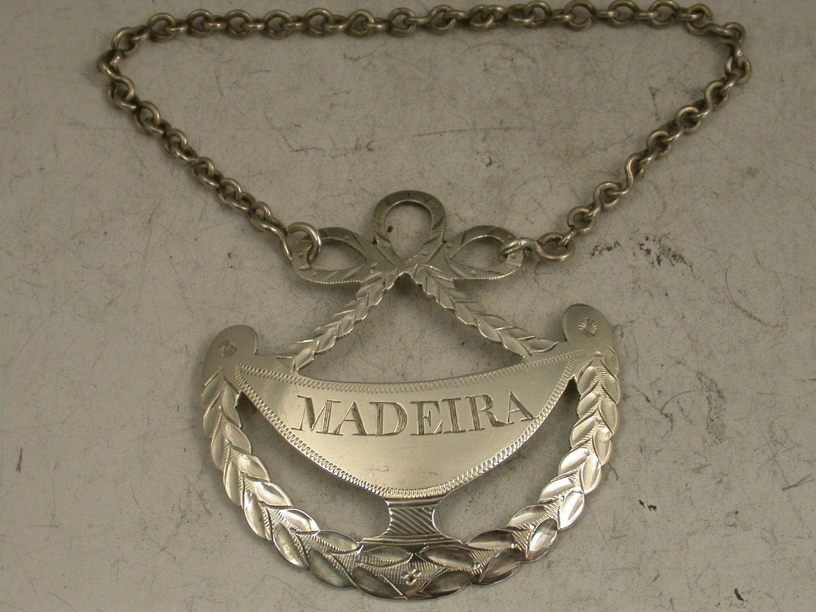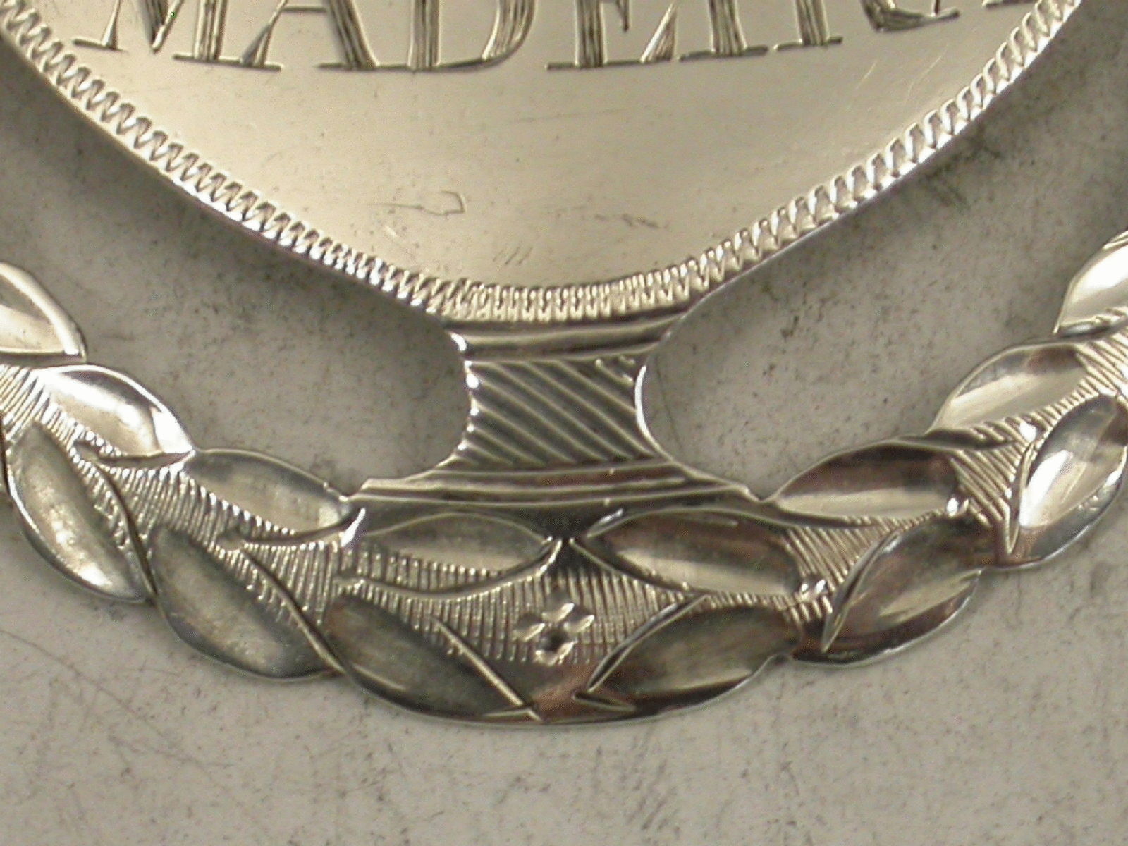 An extremely fine and rare 18th century Irish Provincial silver Wine Label of neo-classical 'Goblet and Festoon' form, incised for Madeira, with bright-cut and prick dot engraved decoration.