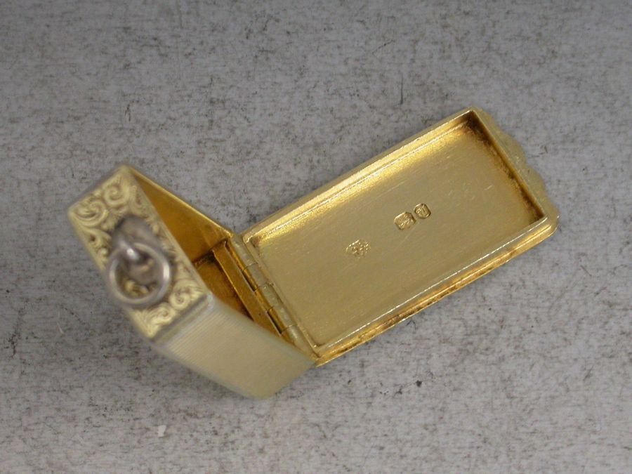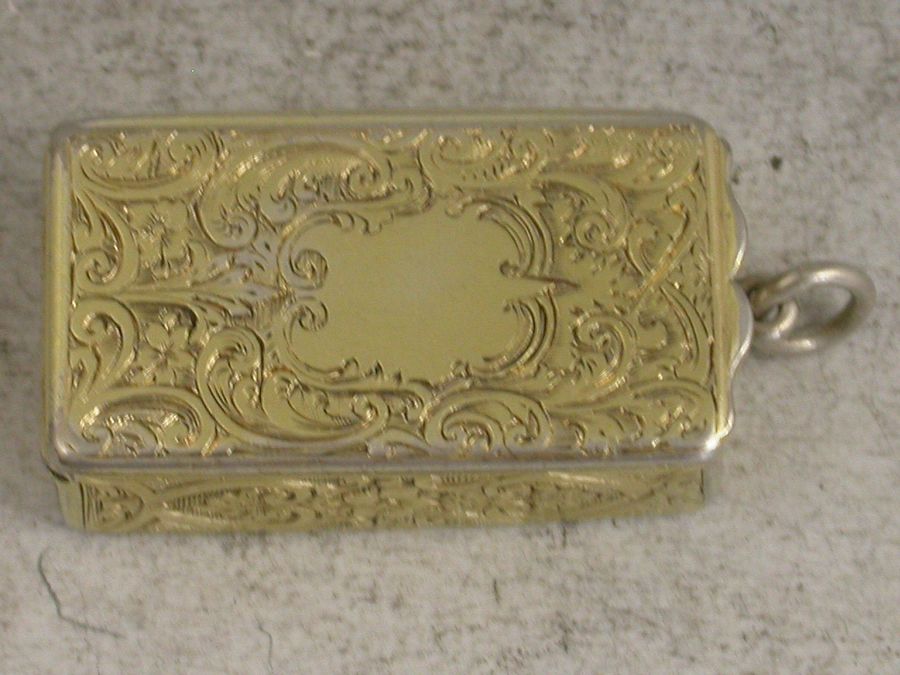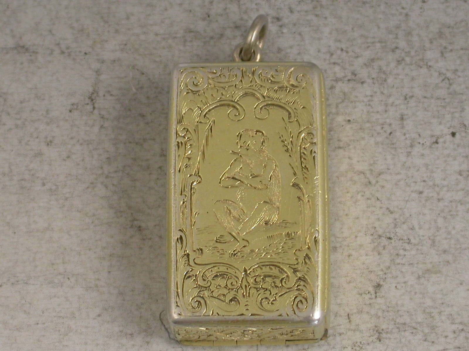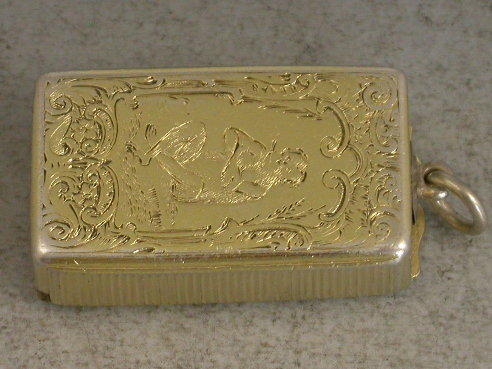 A rare and early Victorian silver gilt Vesta Case of rectangular form with hinged cover and attached suspension ring, the base and sides engraved with foliate scroll decoration and a vacant cartouche, the cover engraved with a seated monkey smoking a cigarette.