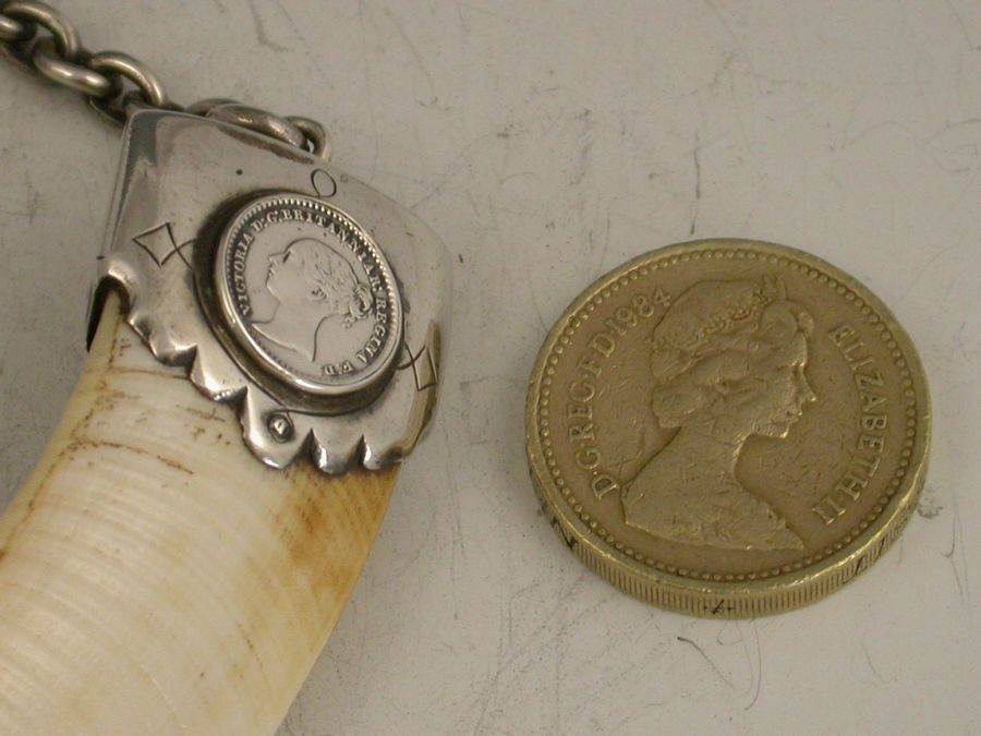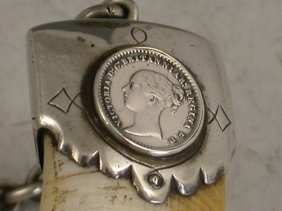 A rare antique English silver Wine Label formed from a large boars tusk, the hallmarked silver mounts set with a Victorian silver sixpence, the tusk engraved and niello filled for Brandy.