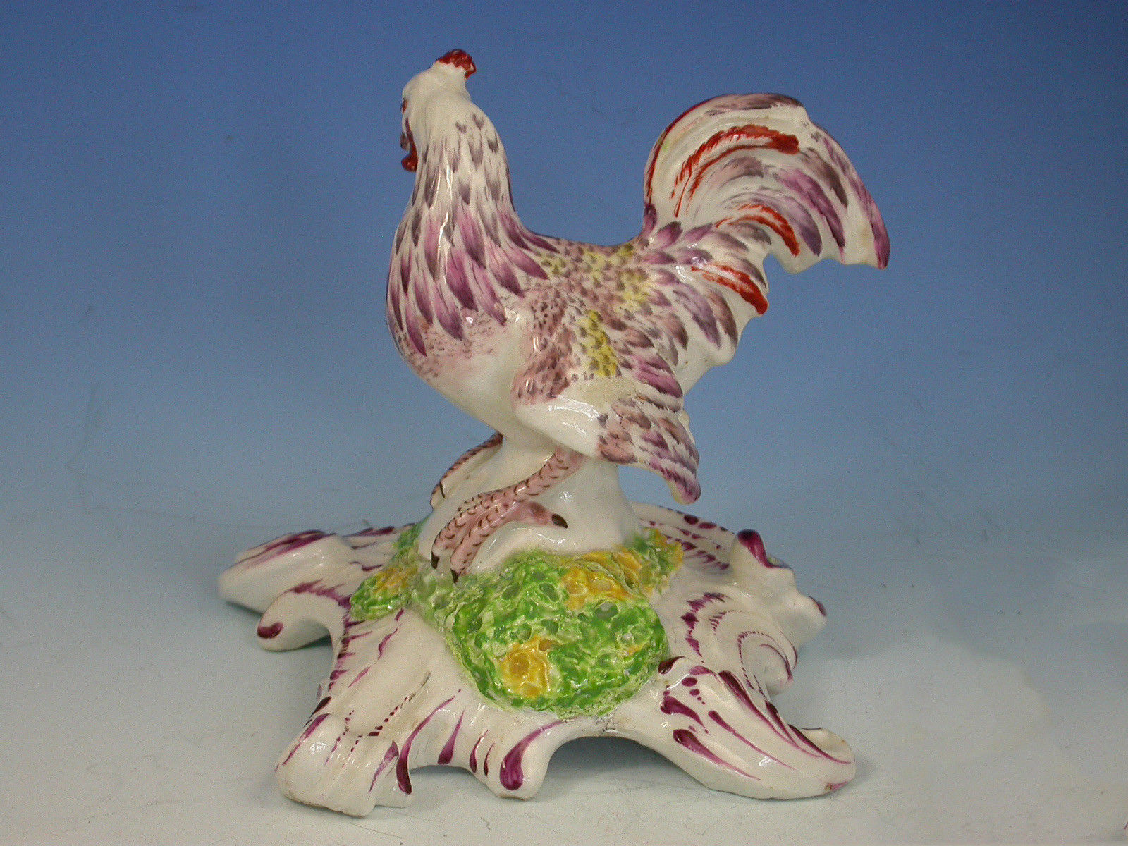 An extremely rare Bow model of a Cockerel on a quatre foil scroll moulded base, painted in polychrome enamels in puce iron red and yellow.