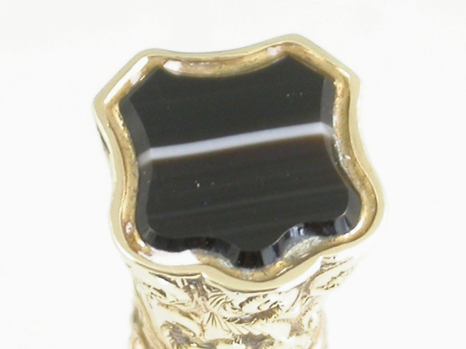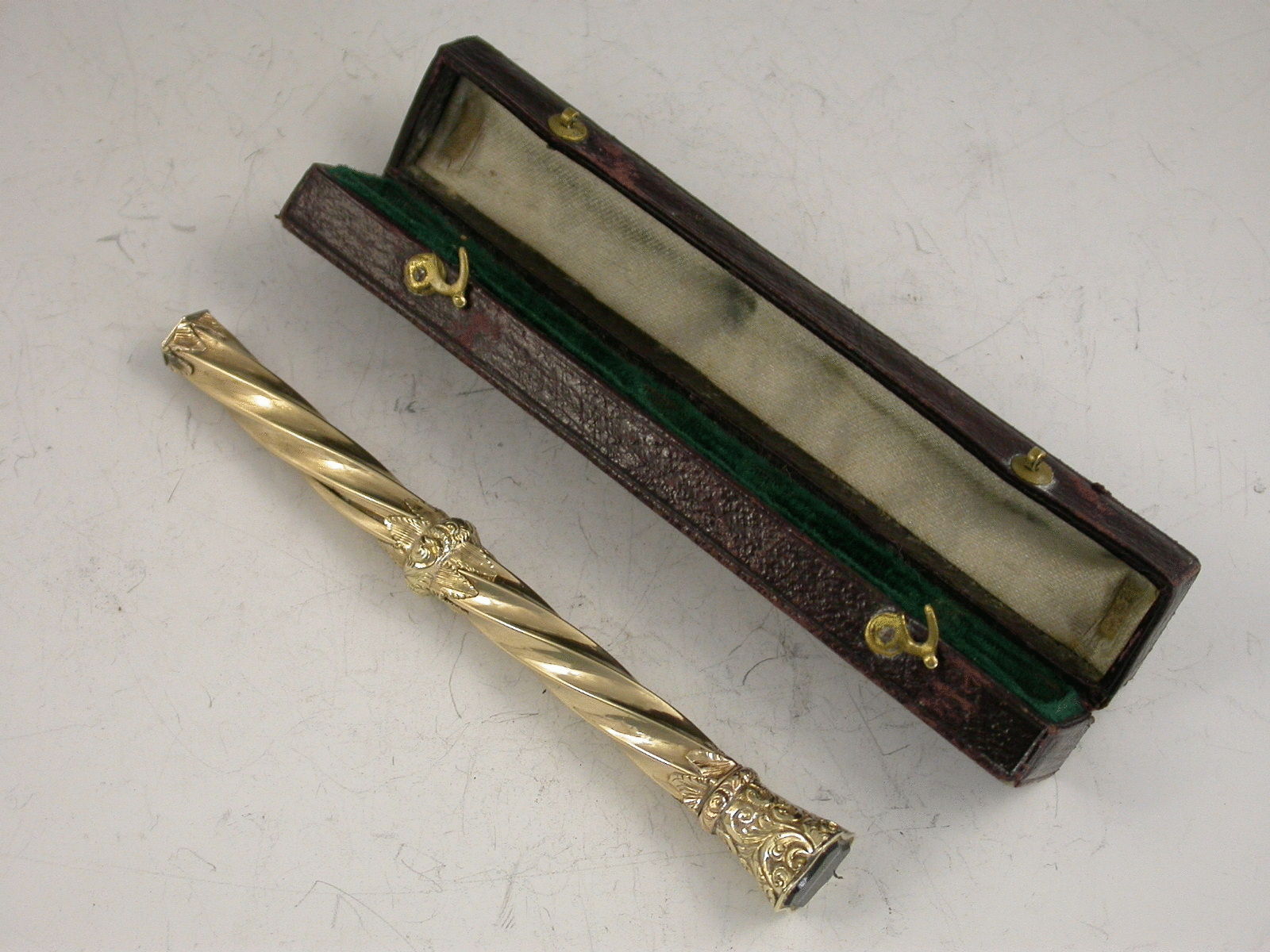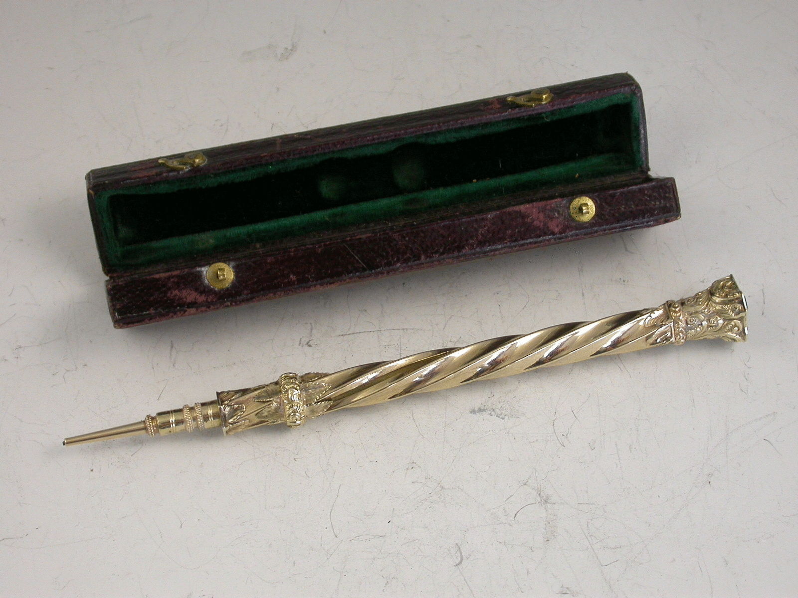 An extremely fine Victorian 9 carat gold slider Pencil with very unusual spiral fluted body and mechanism, raised foliate scroll and acanthus leaf decoration to the slider ring and screw off end cap, set with stripped black agate seal stone. The screw off end cap reveals multi compartment lead reservoir. The sliding mechanism travels around the spiral body to propel the pencil.
