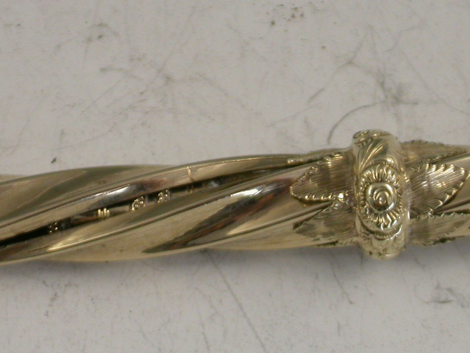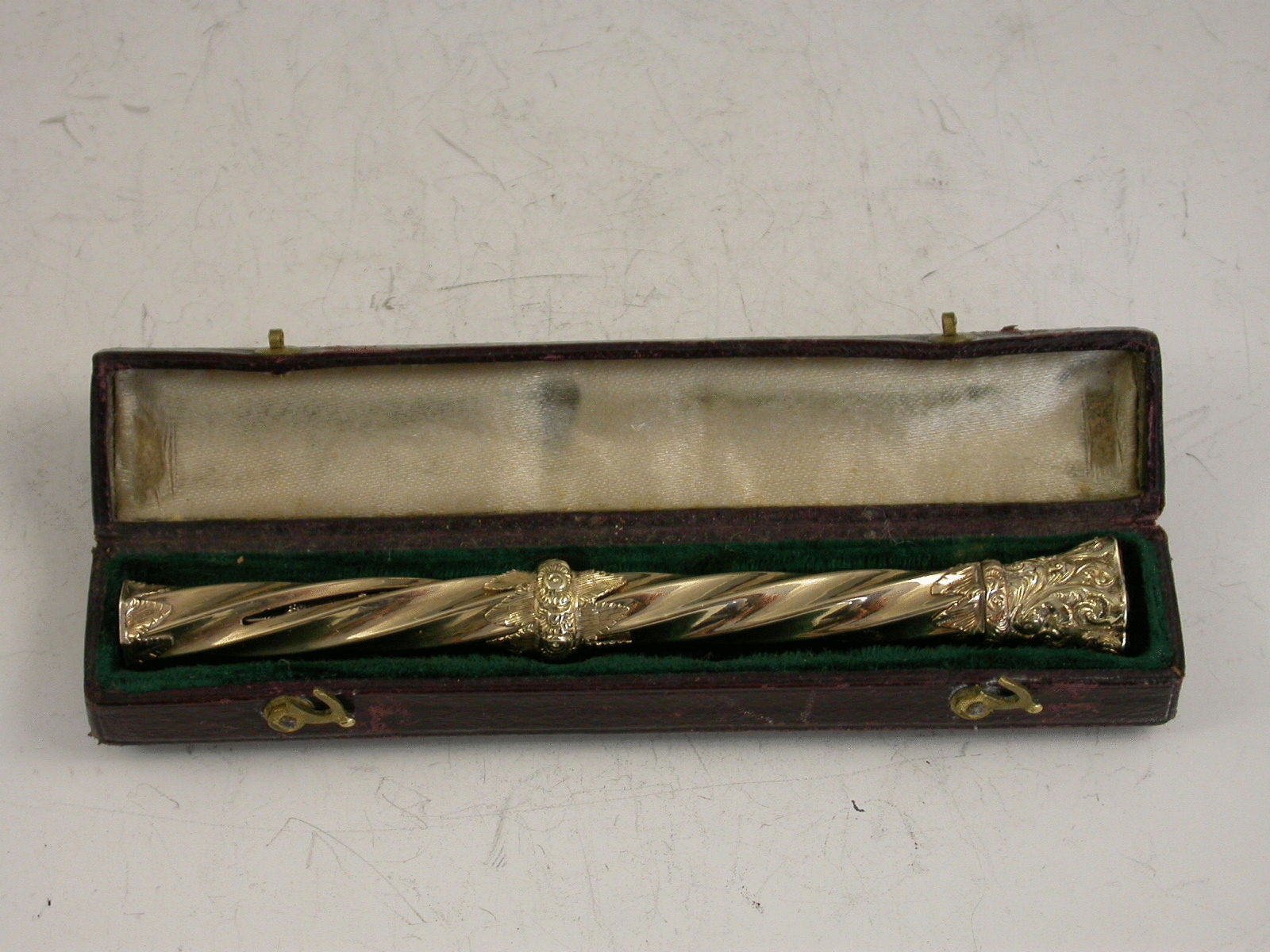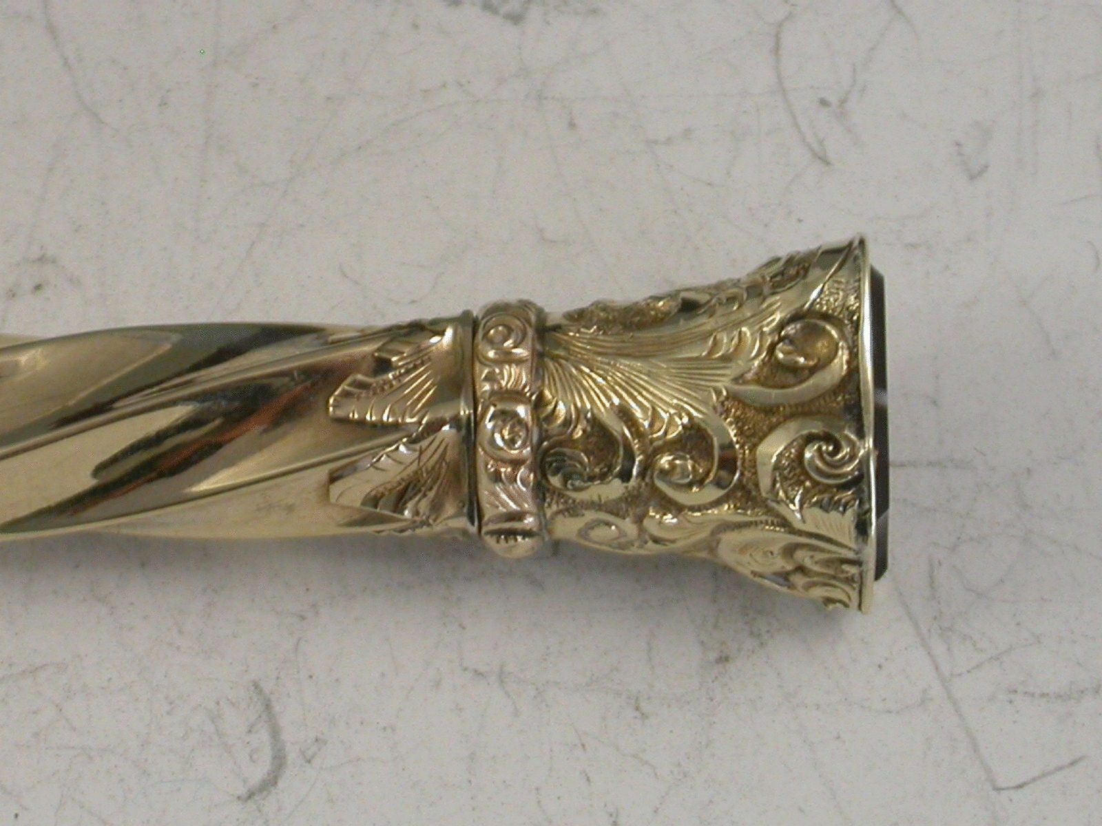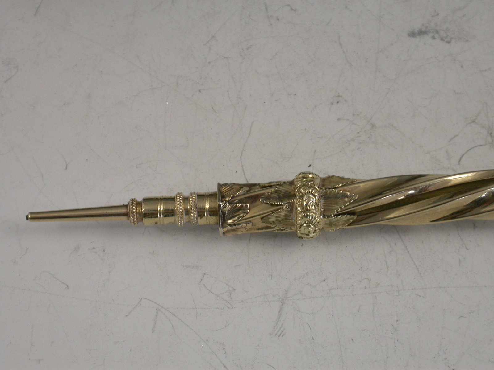 An extremely fine Victorian 9 carat gold slider Pencil with very unusual spiral fluted body and mechanism, raised foliate scroll and acanthus leaf decoration to the slider ring and screw off end cap, set with stripped black agate seal stone. The screw off end cap reveals multi compartment lead reservoir. The sliding mechanism travels around the spiral body to propel the pencil.