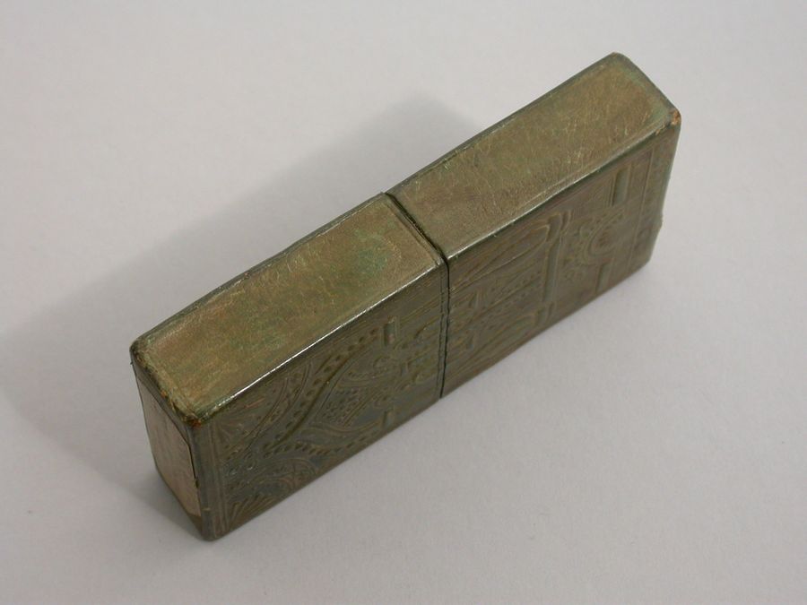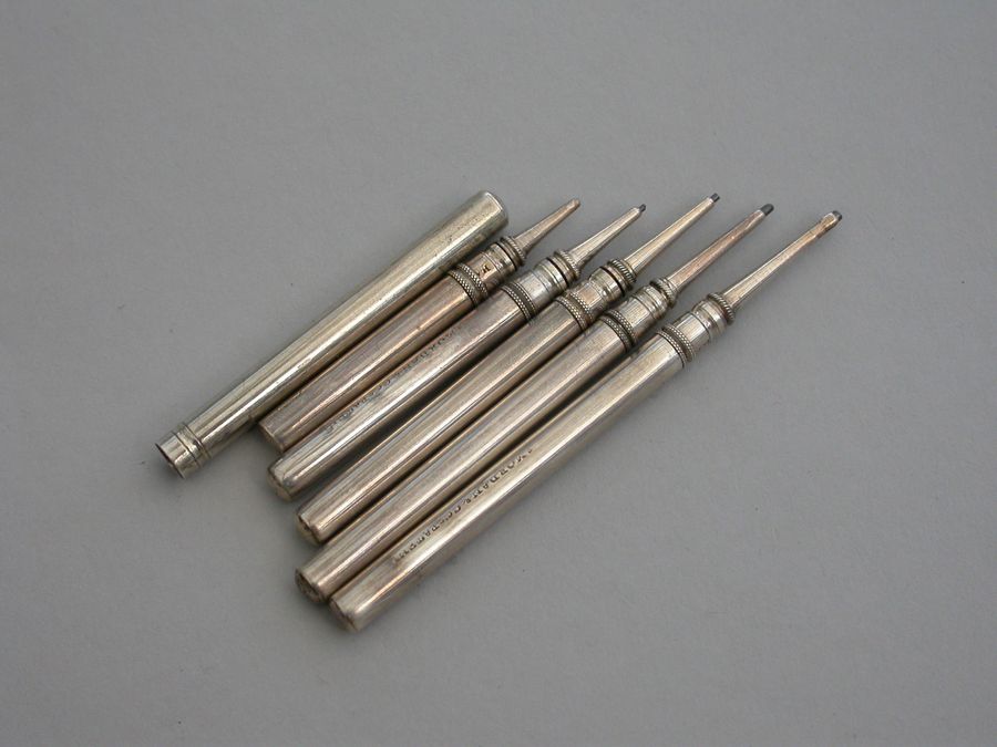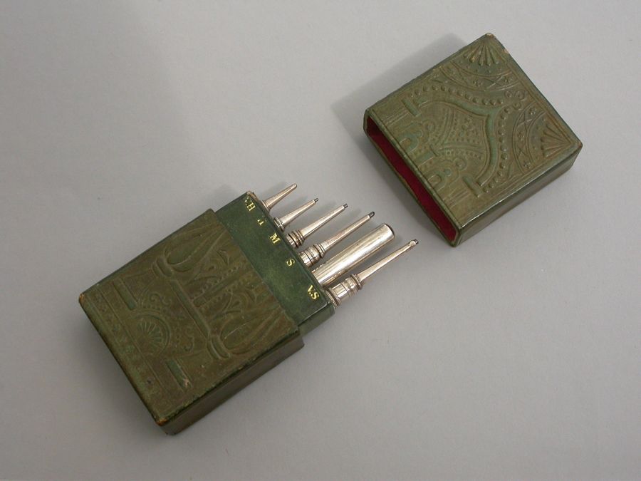A rare and fine quality cased set of five George IV silver Artists Propelling Pencils plus an extension tube to increase the length of the pencil in the hand. The five graduated pencils with nozzles to accept different sized leads. The tooled green leather case with pink silk paper lining and gilt labelled recesses for VH, H, M, S and VS leads (very hard, hard, medium, soft and very soft). The green leather case with raised architectural decoration including pillars and alcoves. The lid of the leather case with applied paper Mordan & Co's Patent Trade label.