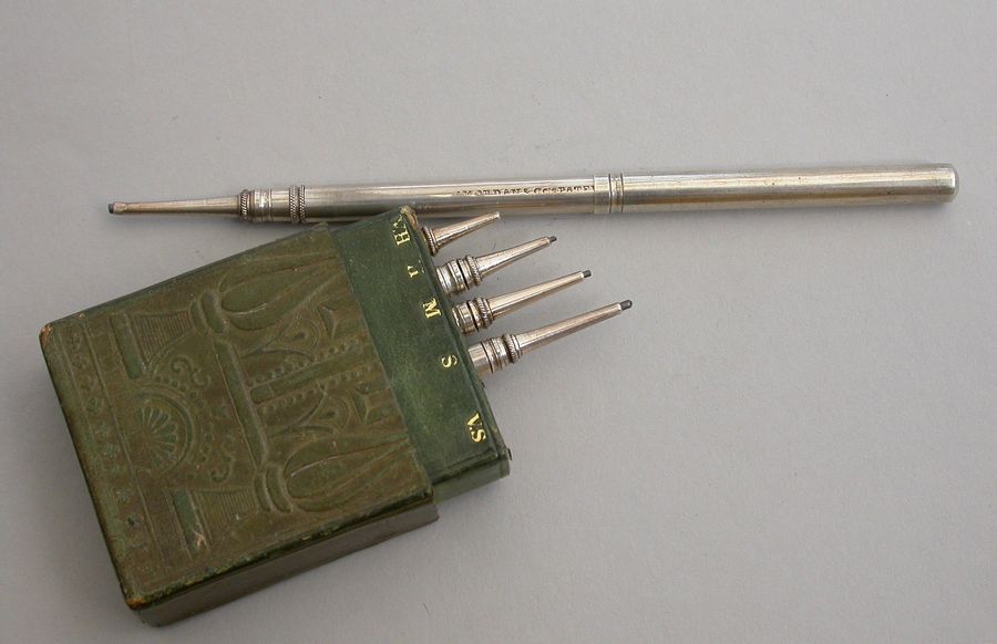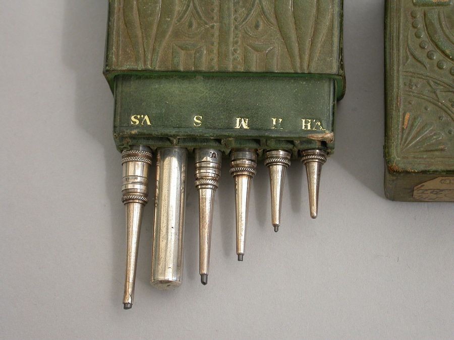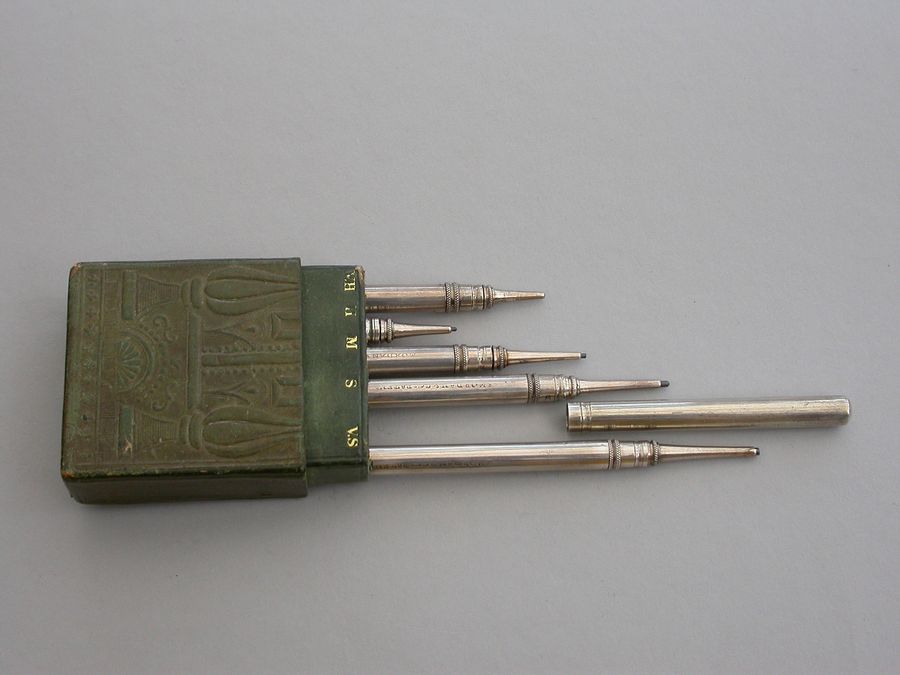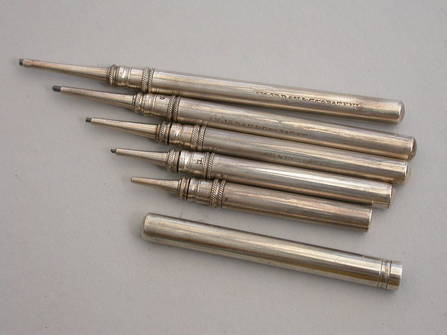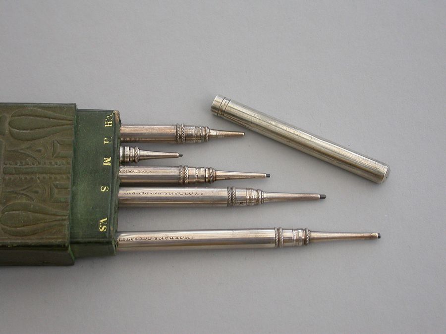Another Mordan advert from 1831 describes a set as ""For a Lady's Taille, a Magazine of Patent Pencils containing five distinct qualities of lead prepared for all the purposes of fine outlining and shading in pencil drawing"".