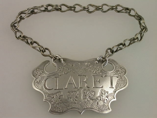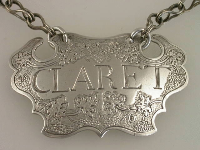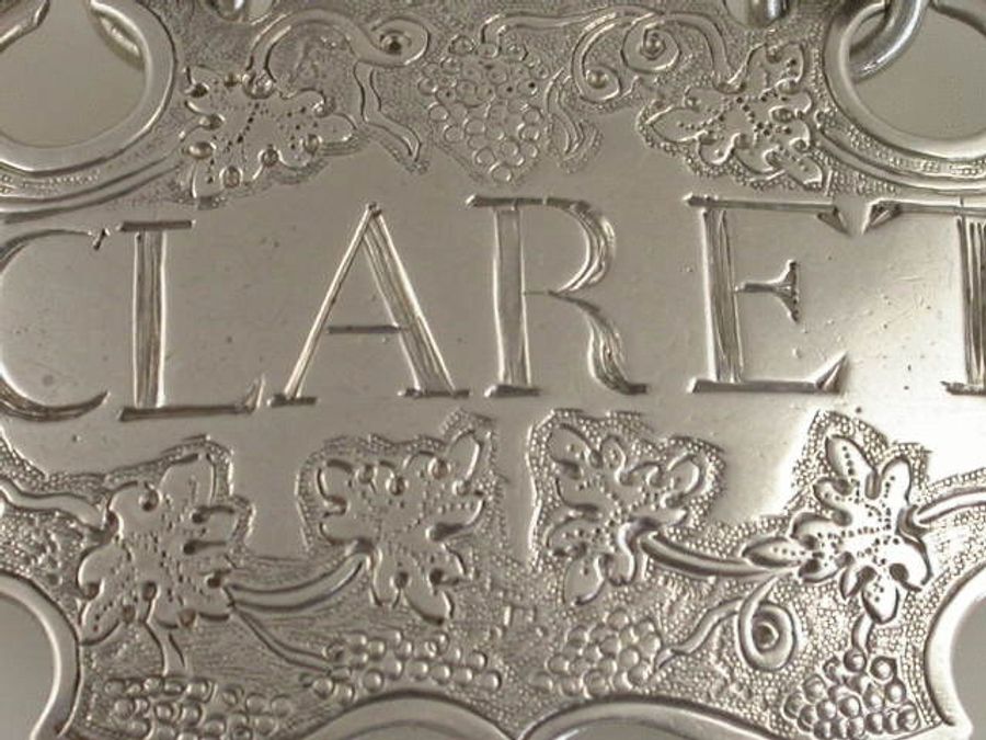 One of the only known pair of 18th century Channel Islands silver Wine Labels, of engraved escutcheon form, decorated with vine leaves, grapes and tendrils on a matt background, incised for Claret.