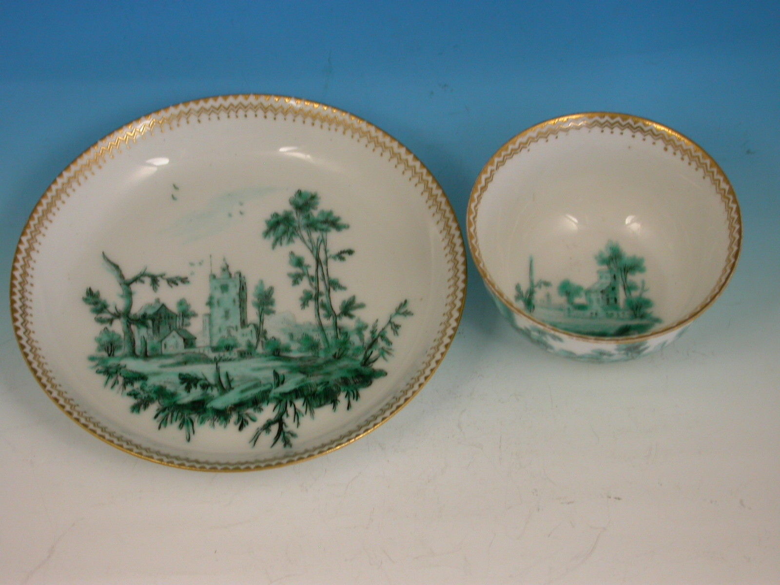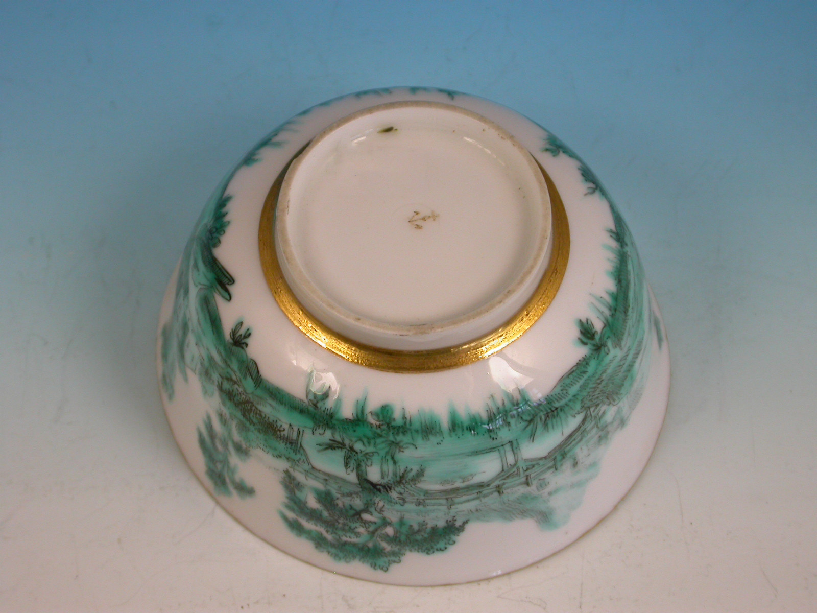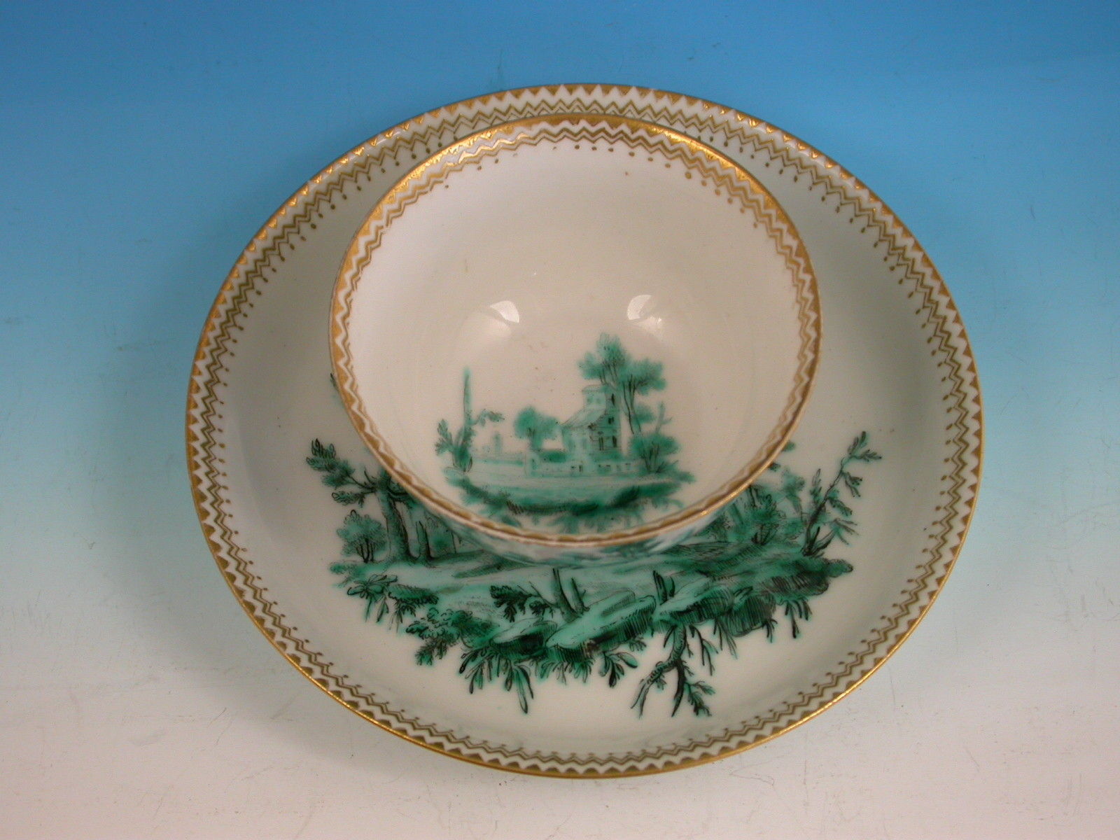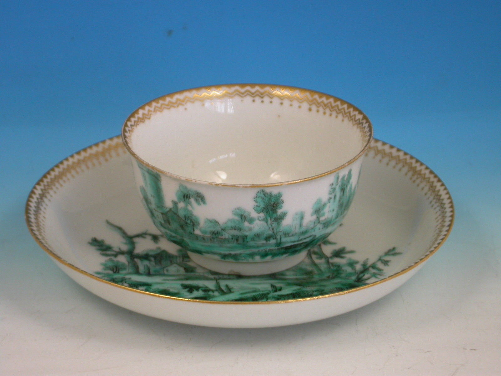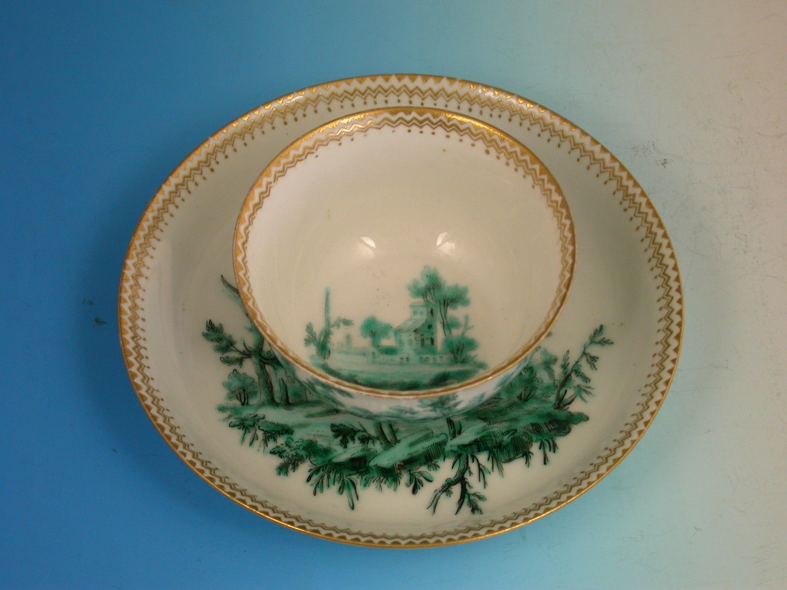 An extremely fine Chelsea gold anchor Tea Bowl and Saucer, painted with green landscape decoration.