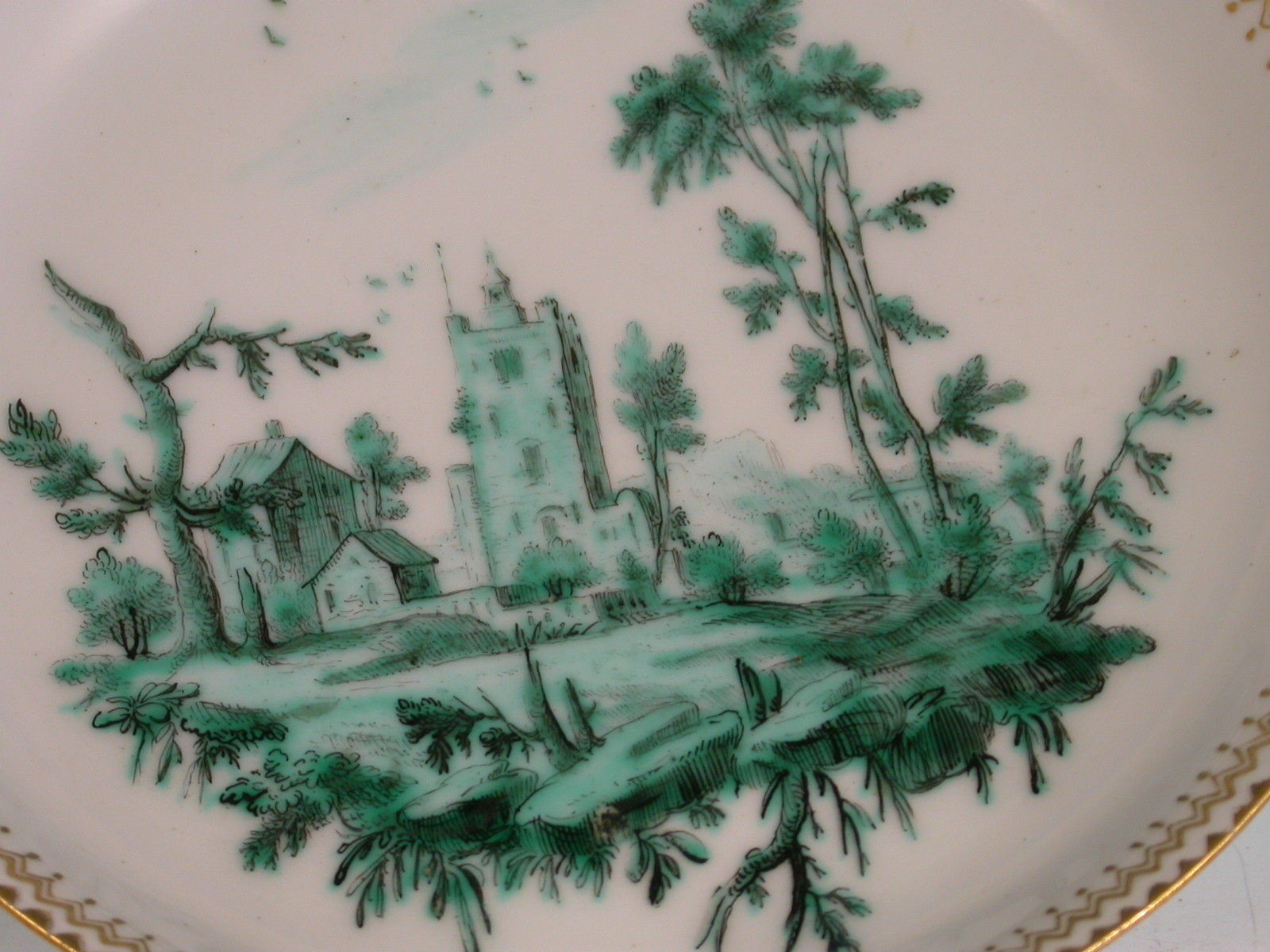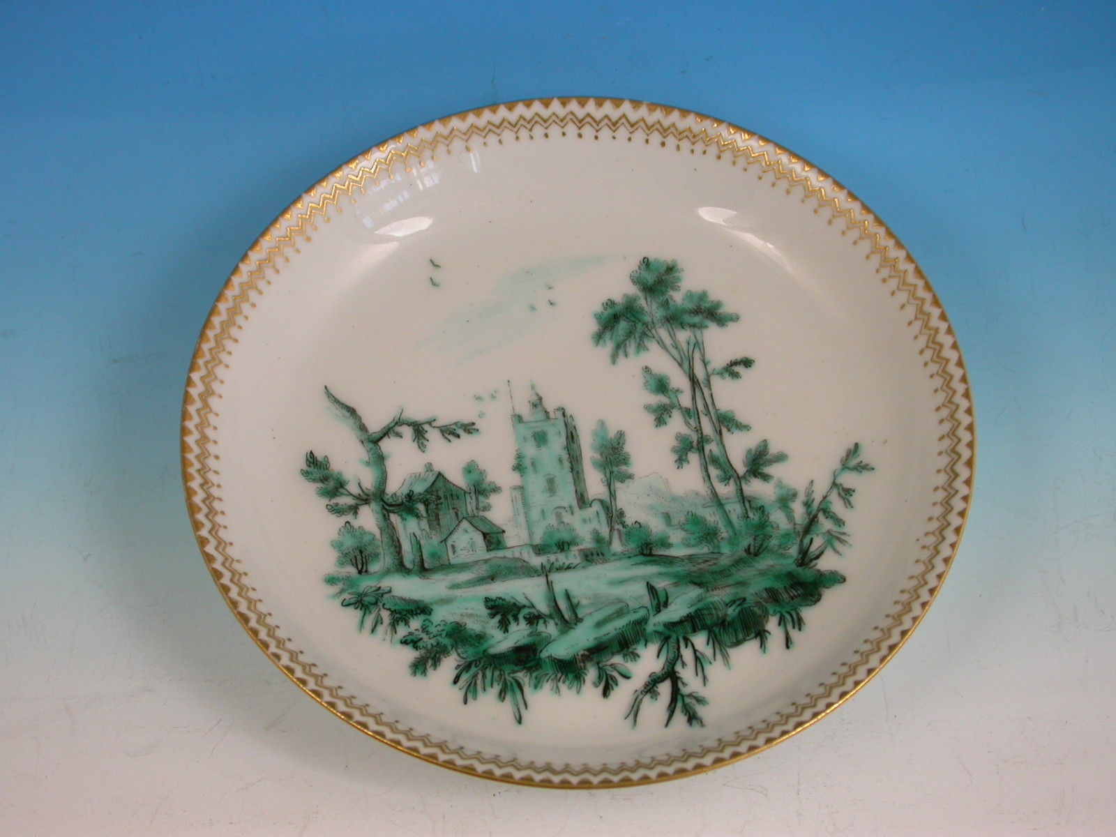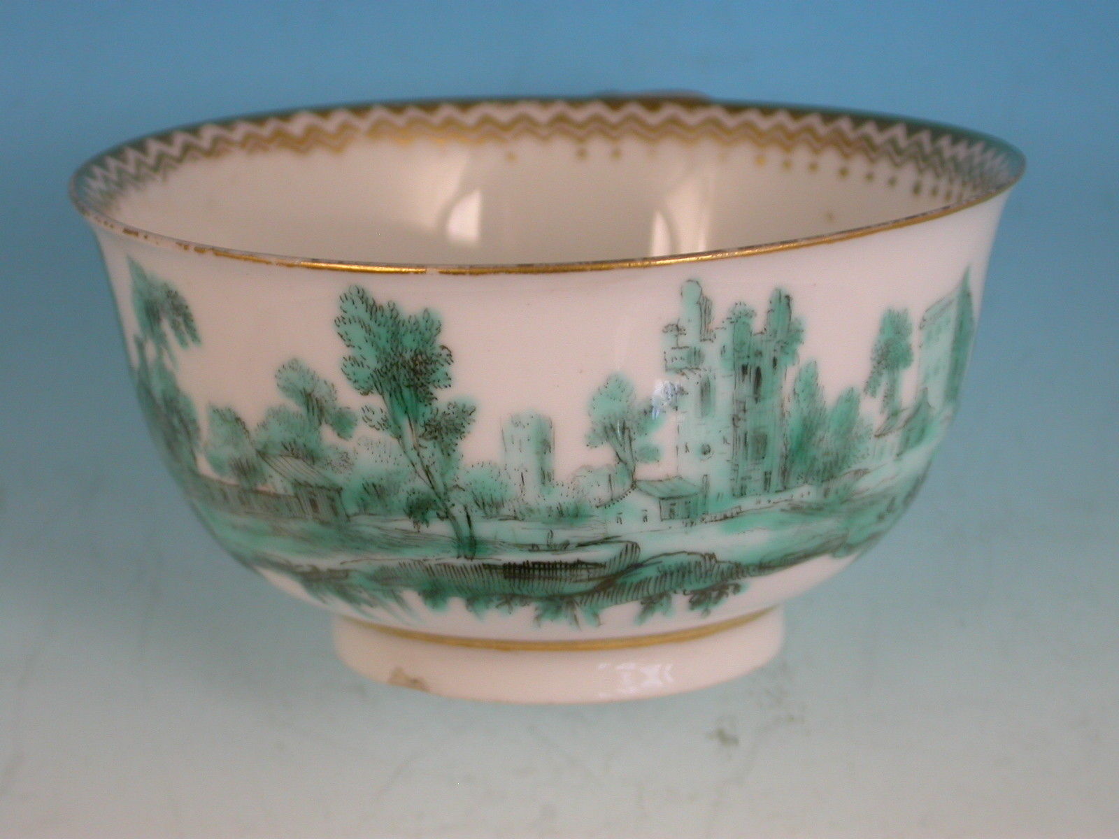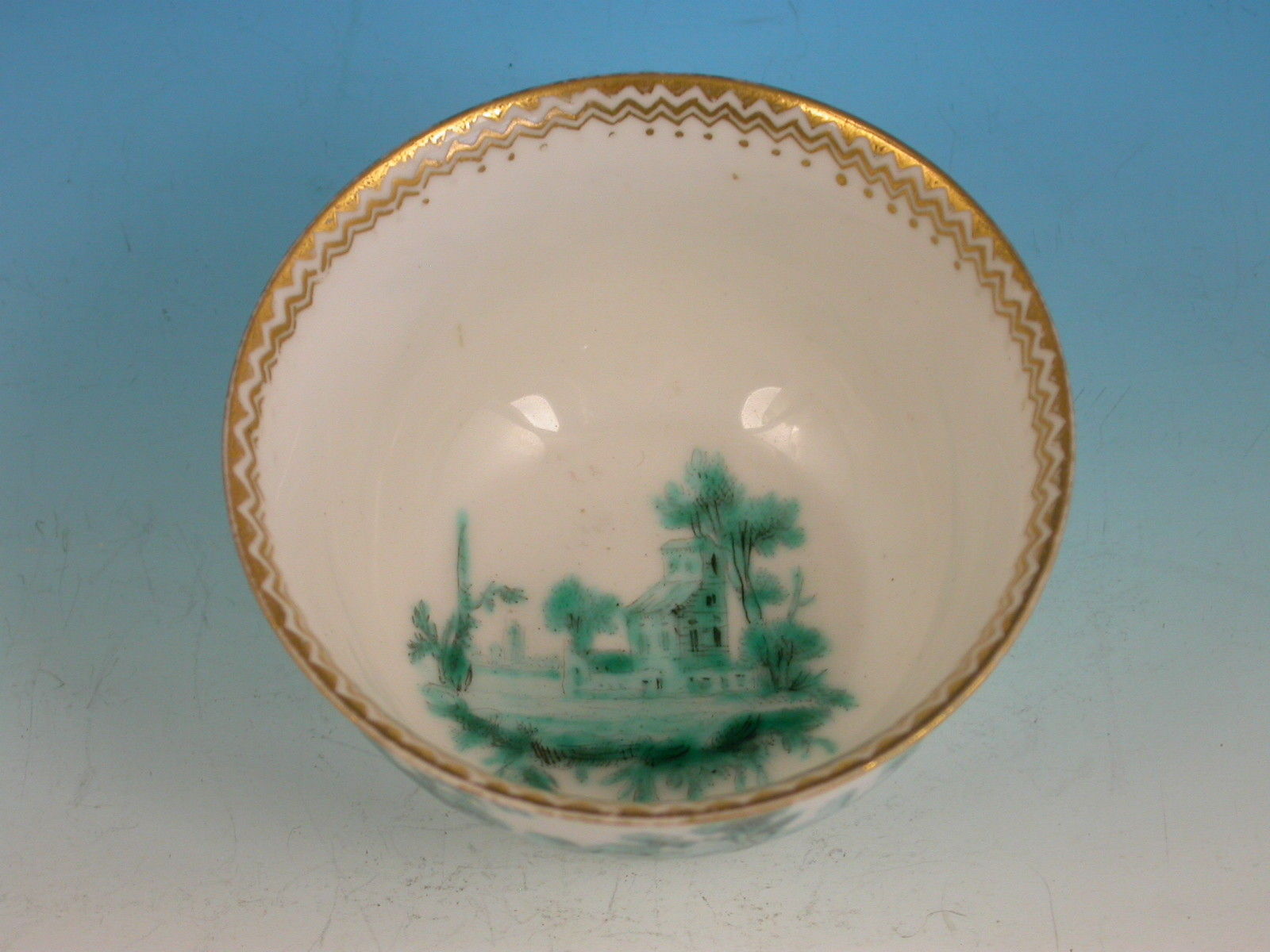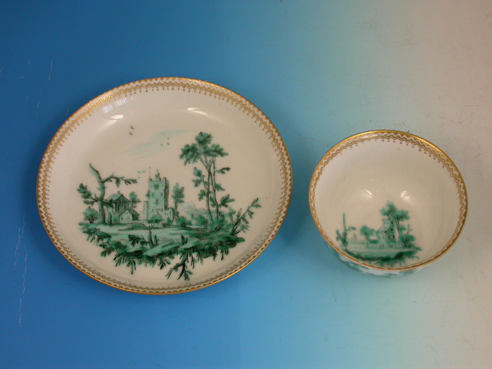 An extremely fine Chelsea gold anchor Tea Bowl and Saucer, painted with green landscape decoration.