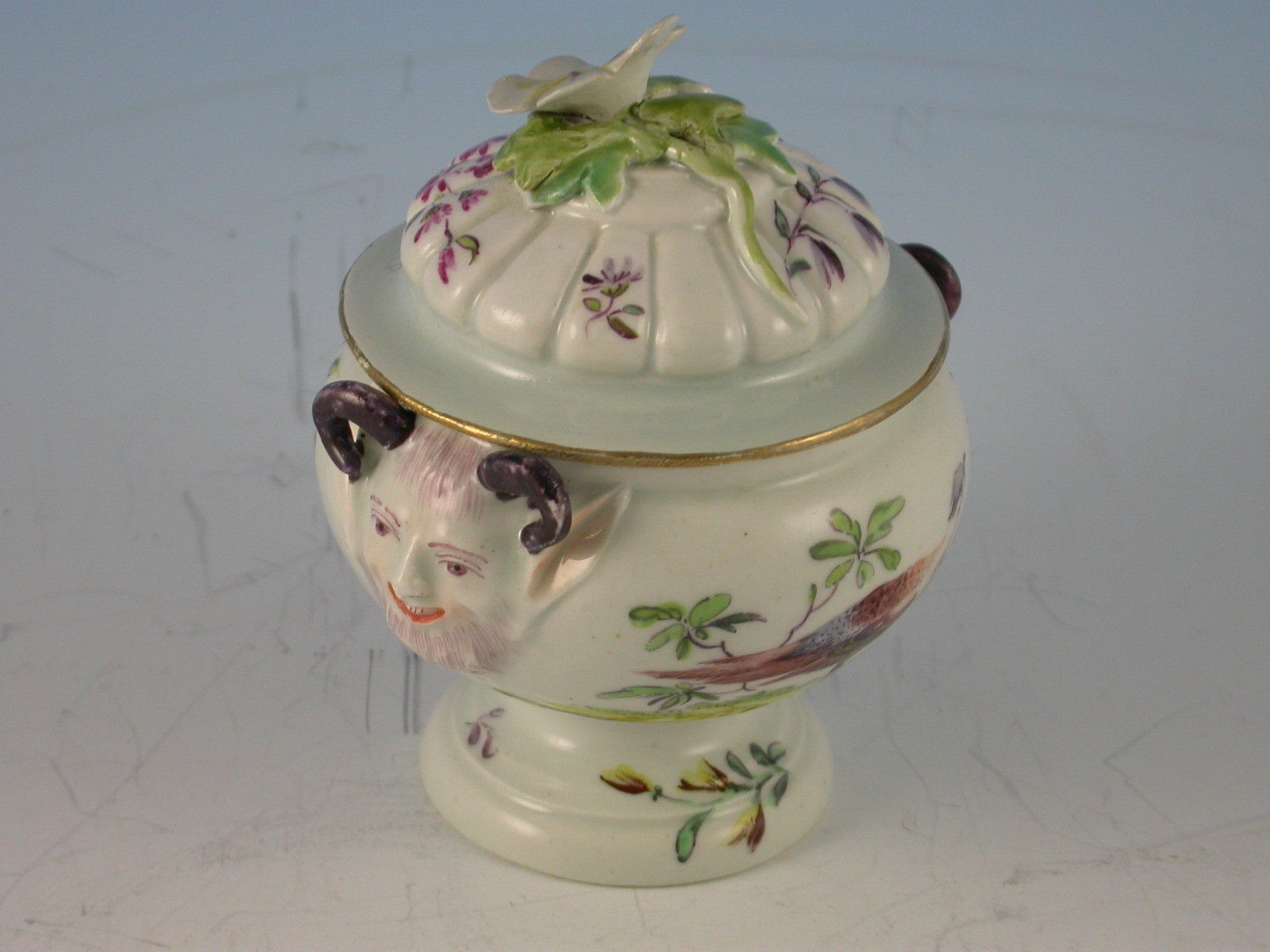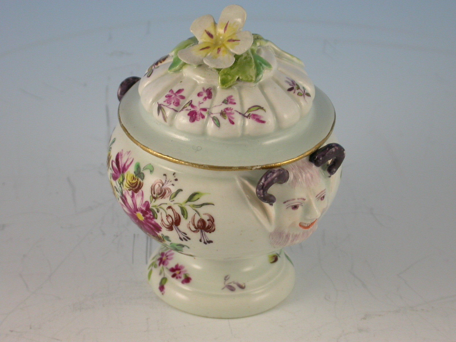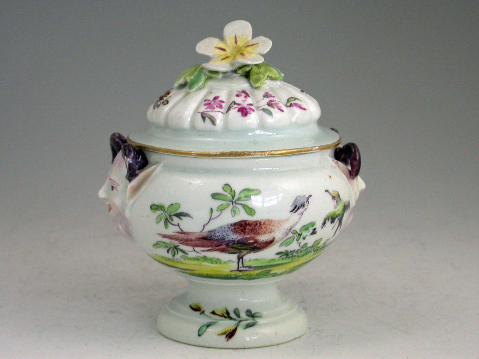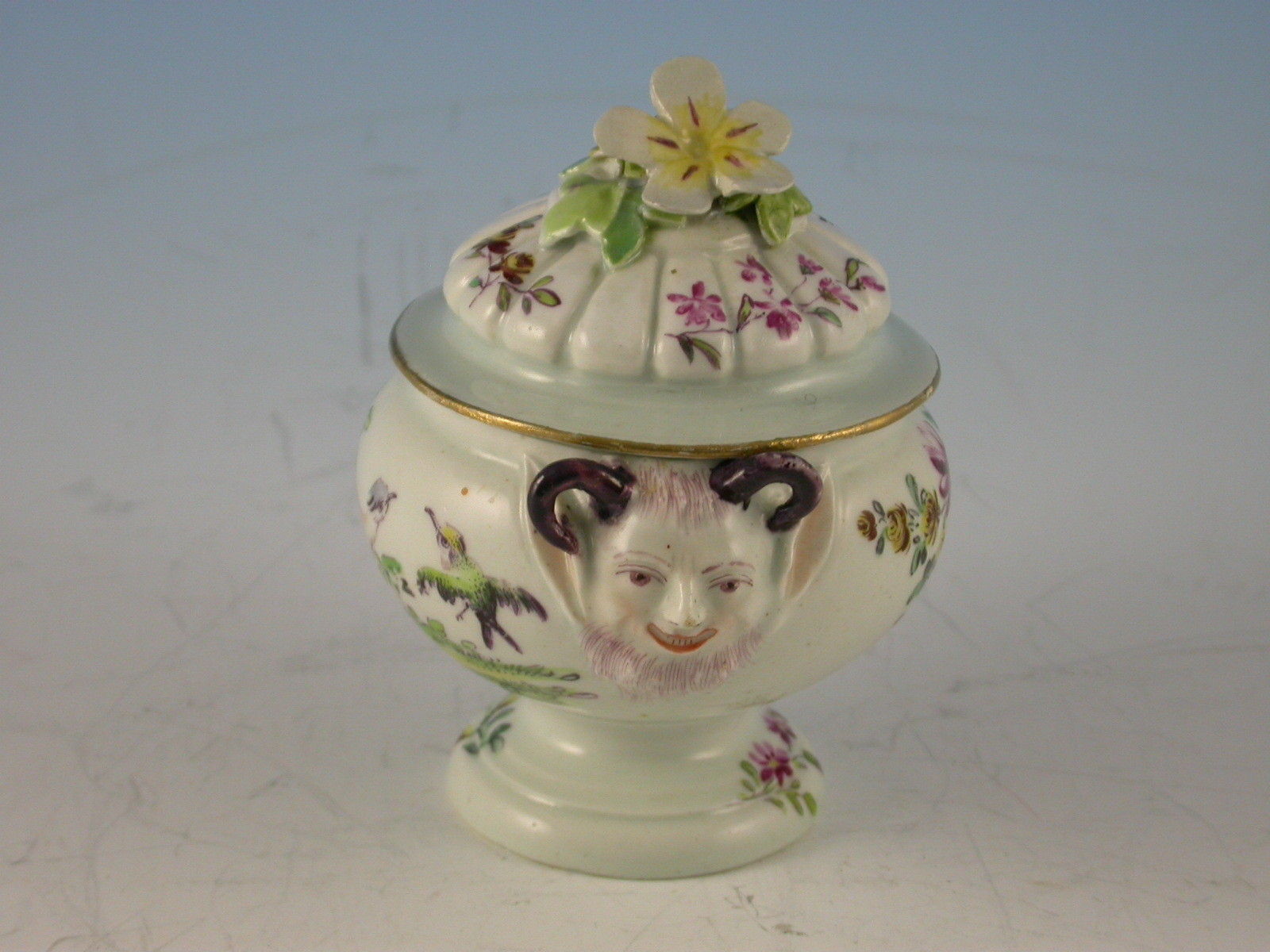 A very rare Derby Salt Pot and Cover with 'U' shaped masked handles, the cover with a flower finial, painted with birds and flowers.