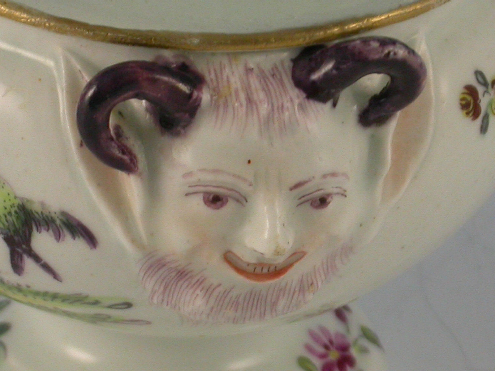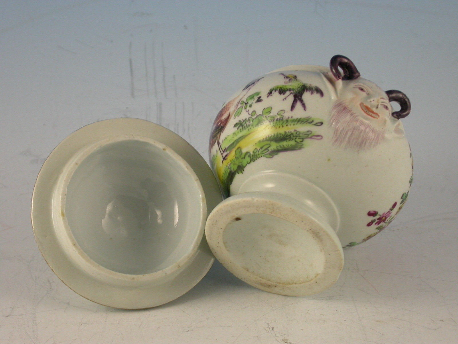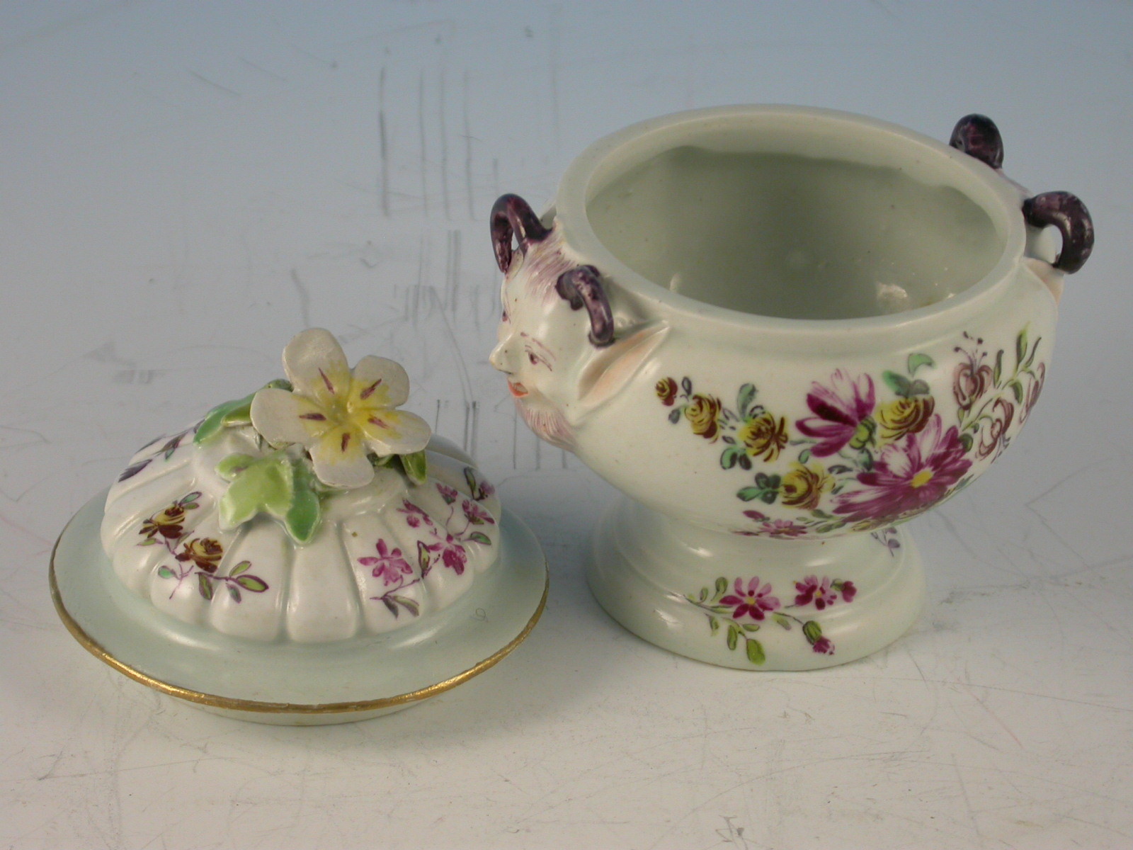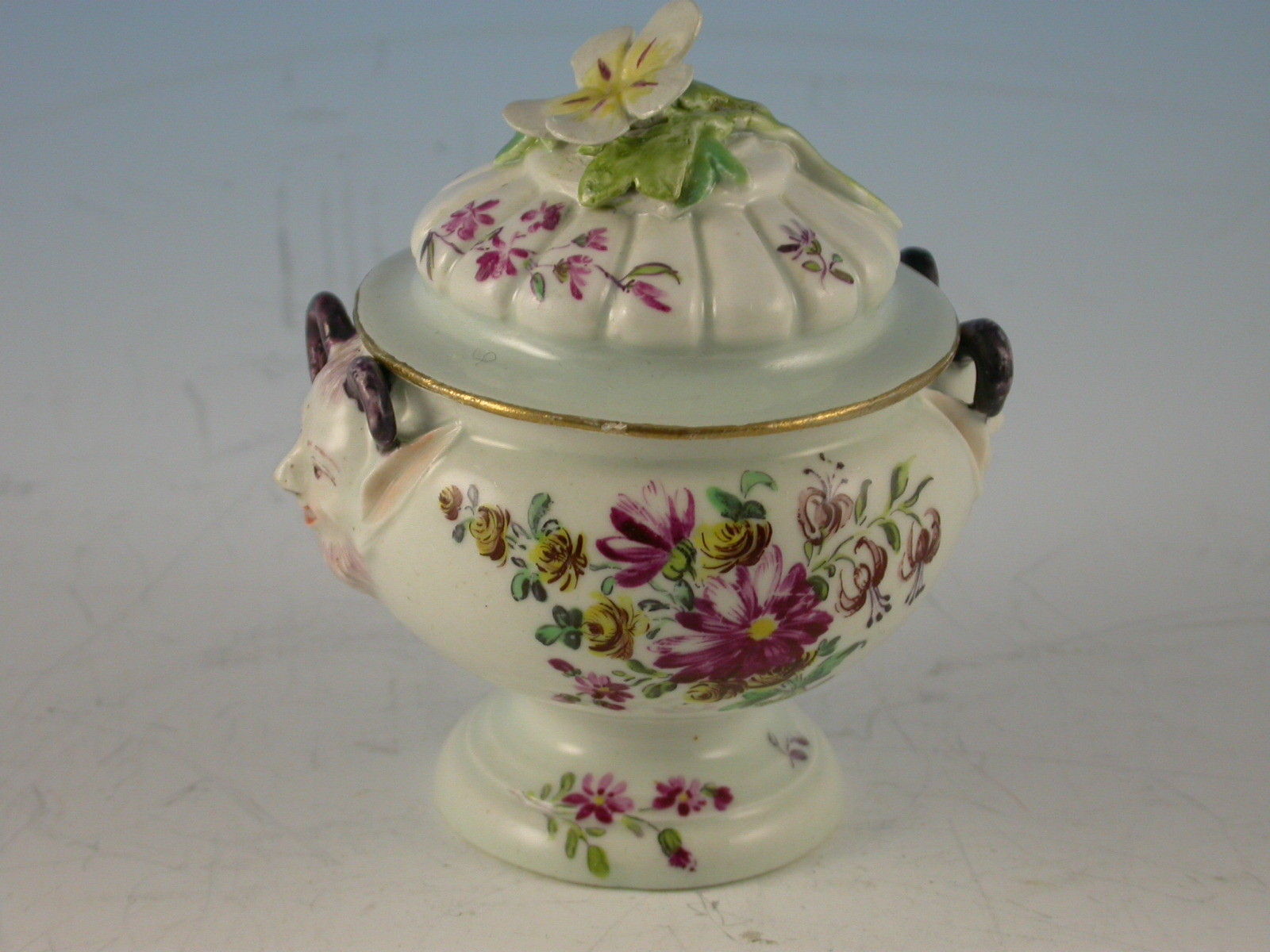 A very rare Derby Salt Pot and Cover with 'U' shaped masked handles, the cover with a flower finial, painted with birds and flowers.
