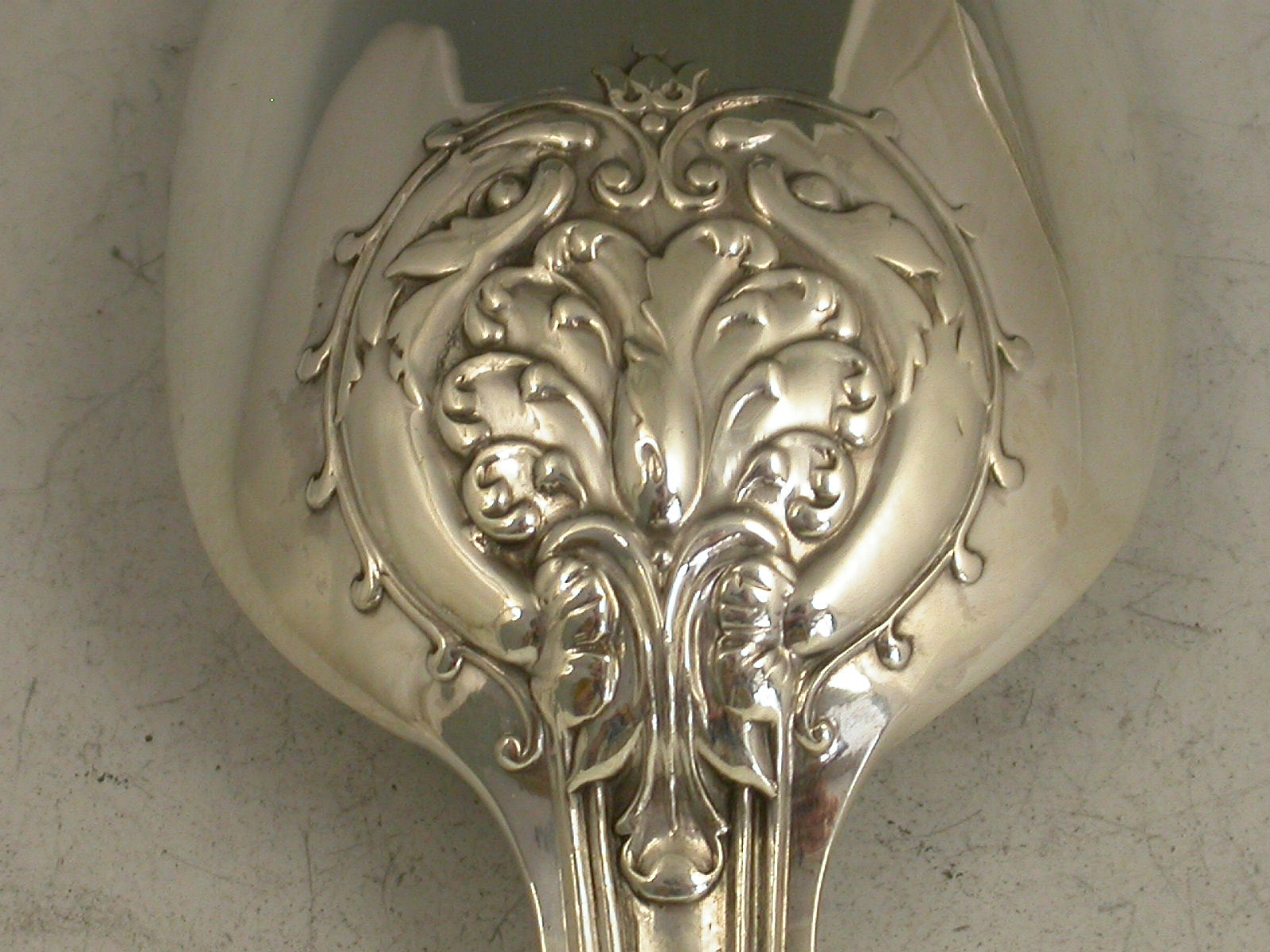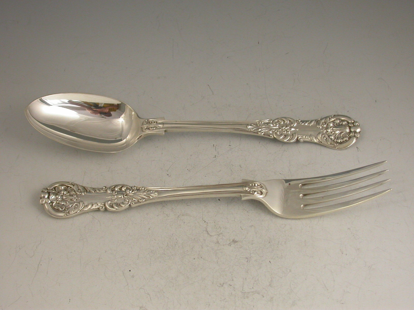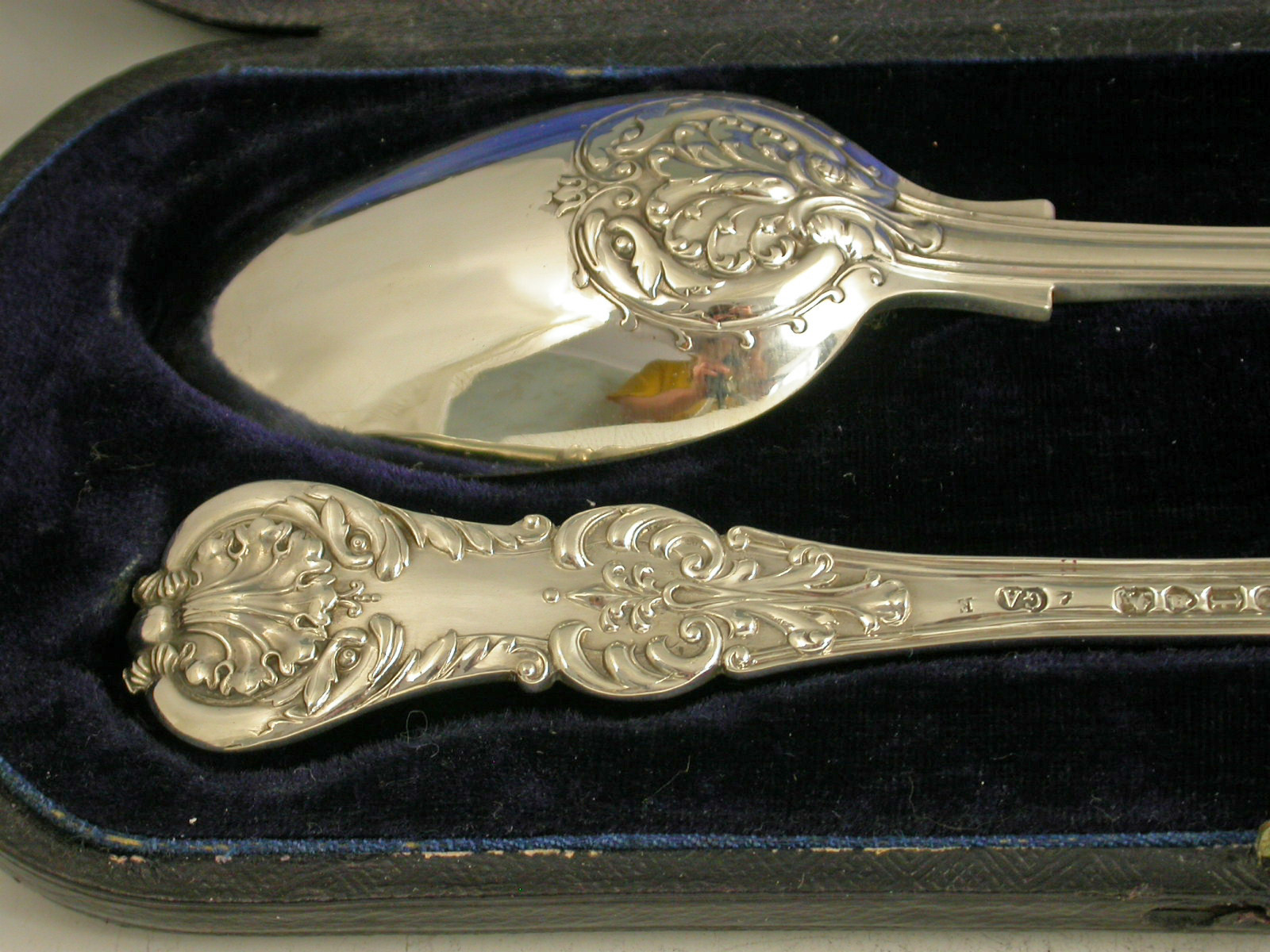 A rare Victorian cased silver Christening Spoon and Fork in a Chawner & Co pattern known as 'Dolphin', a variant of the Kings shape with two Dolphins either side of the husk type shells both front and back and on the heel of the bowl.