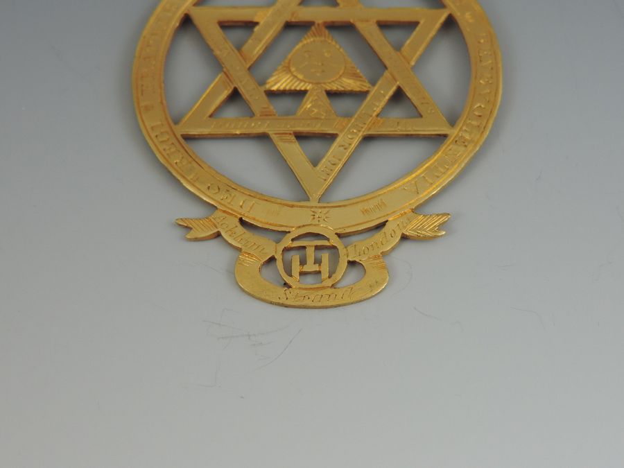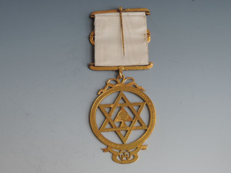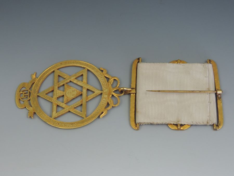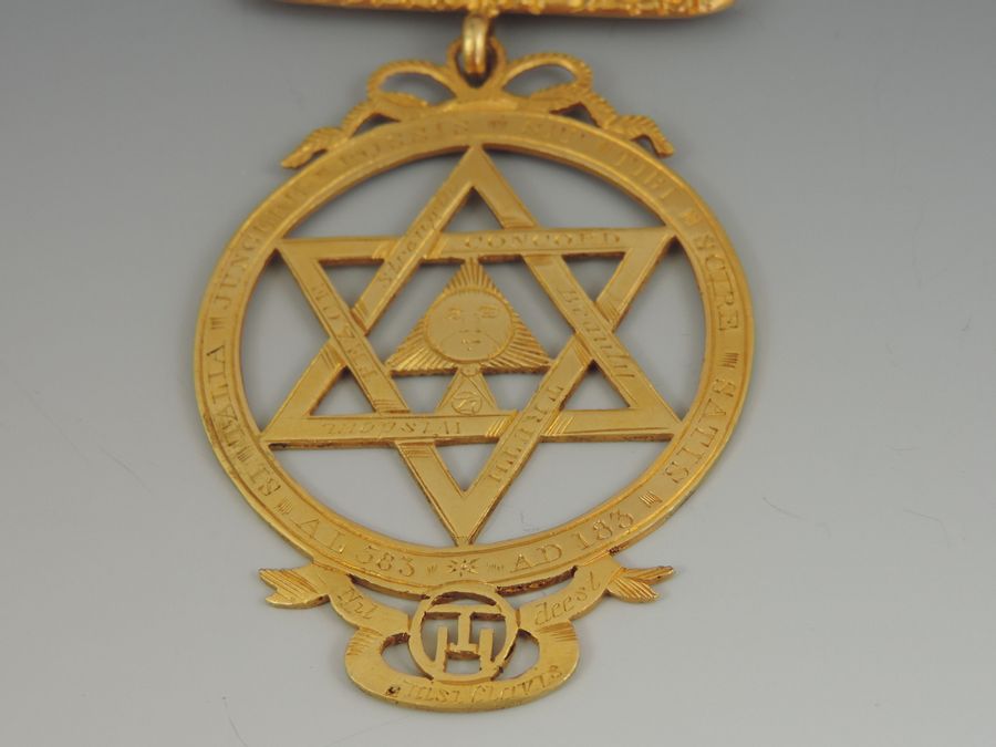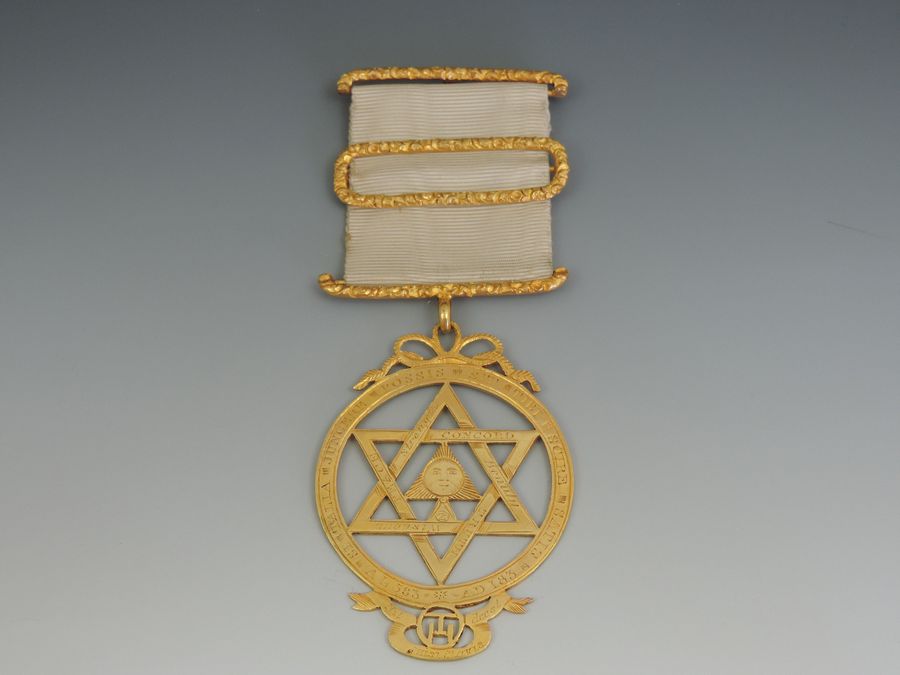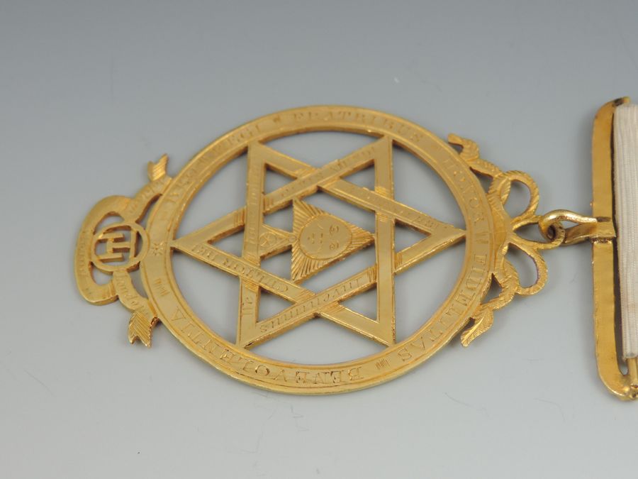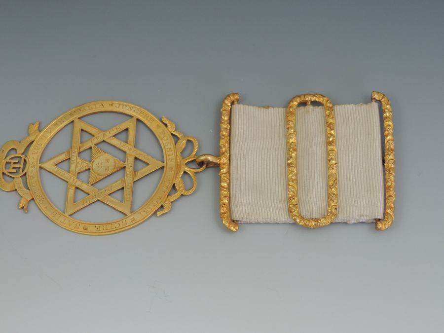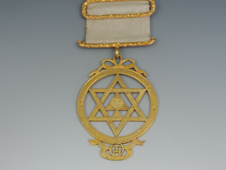 An extremely rare early 19th century Masonic gold Royal Arch Chapter Jewel, of typical ""Thomas Harper form"", pierced with Masonic symbols and complete with original ribbon and pin.