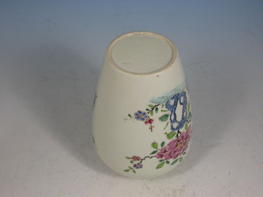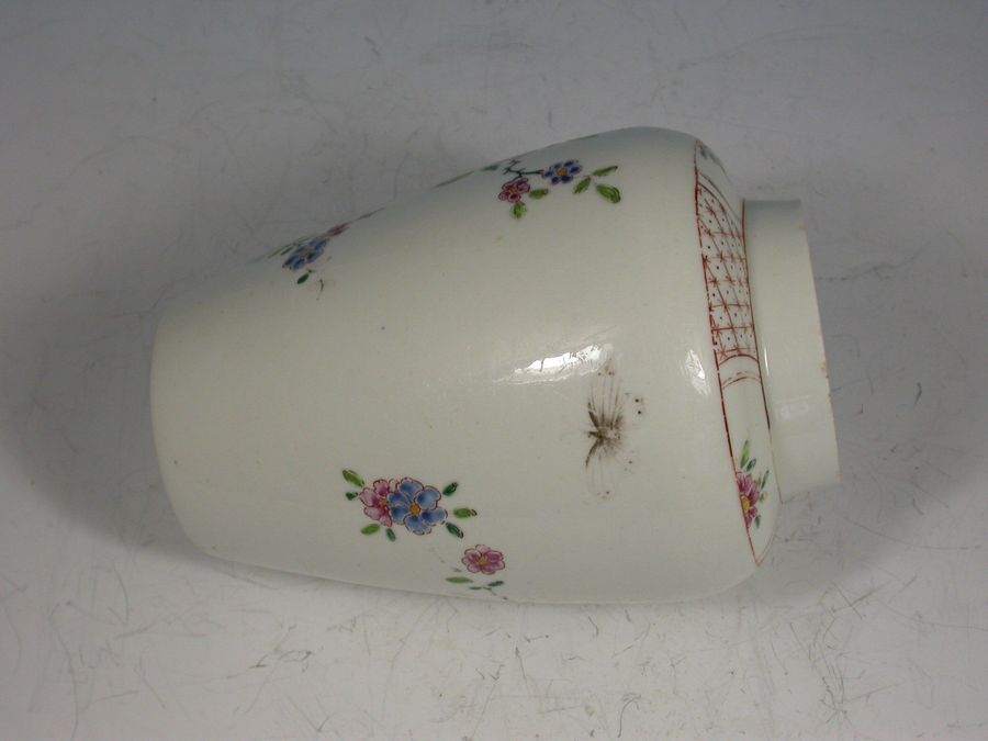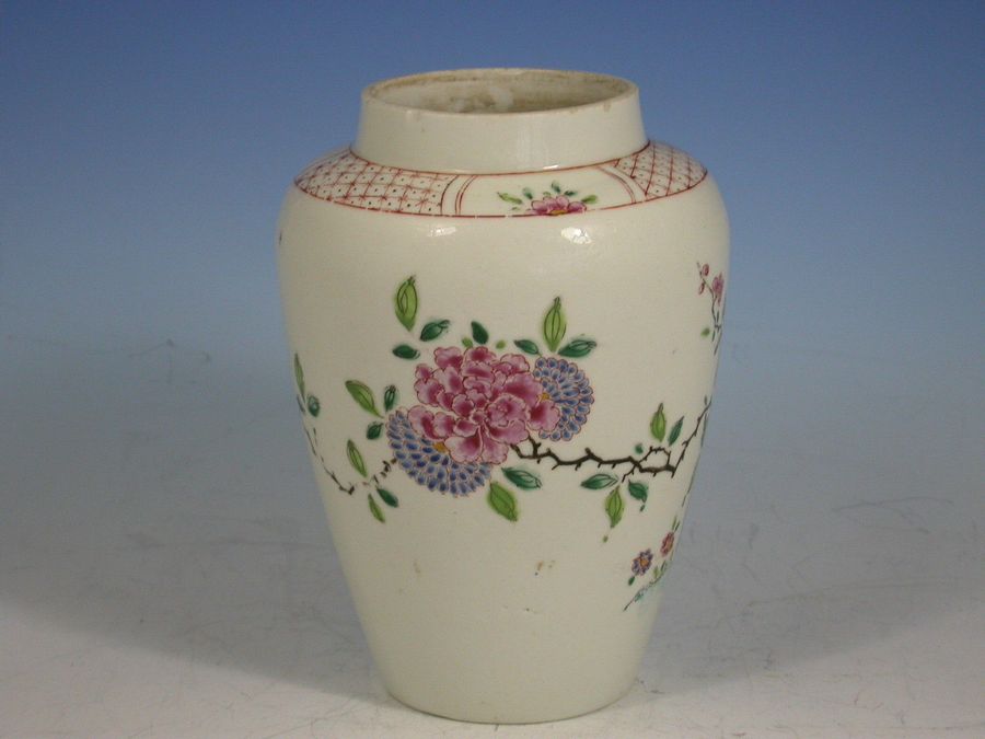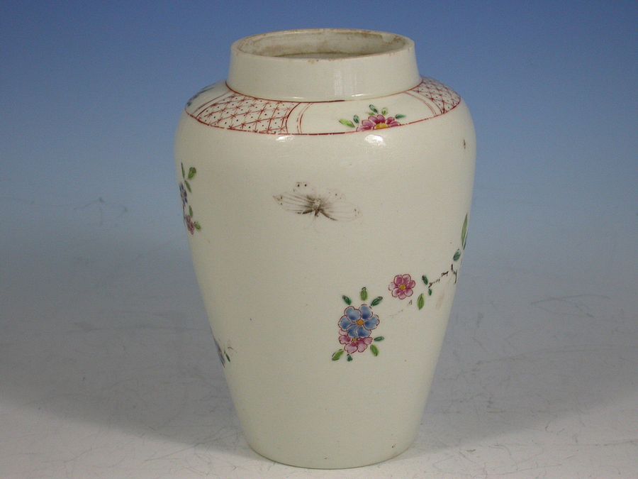 A fine and rare early Bow ovoid shaped Vase of tapering form, painted in famille rose style with scattered insects, a segmented band around the border of cross-hatched panels and blossom sprays.