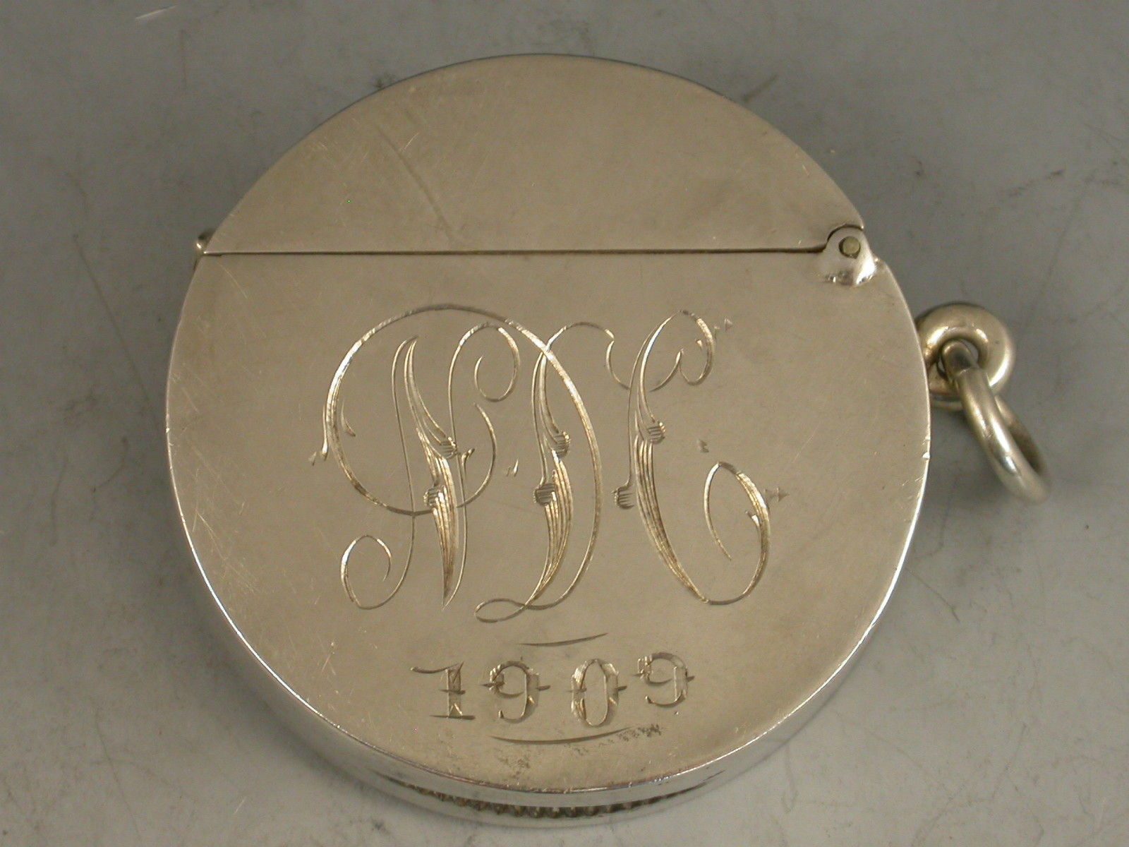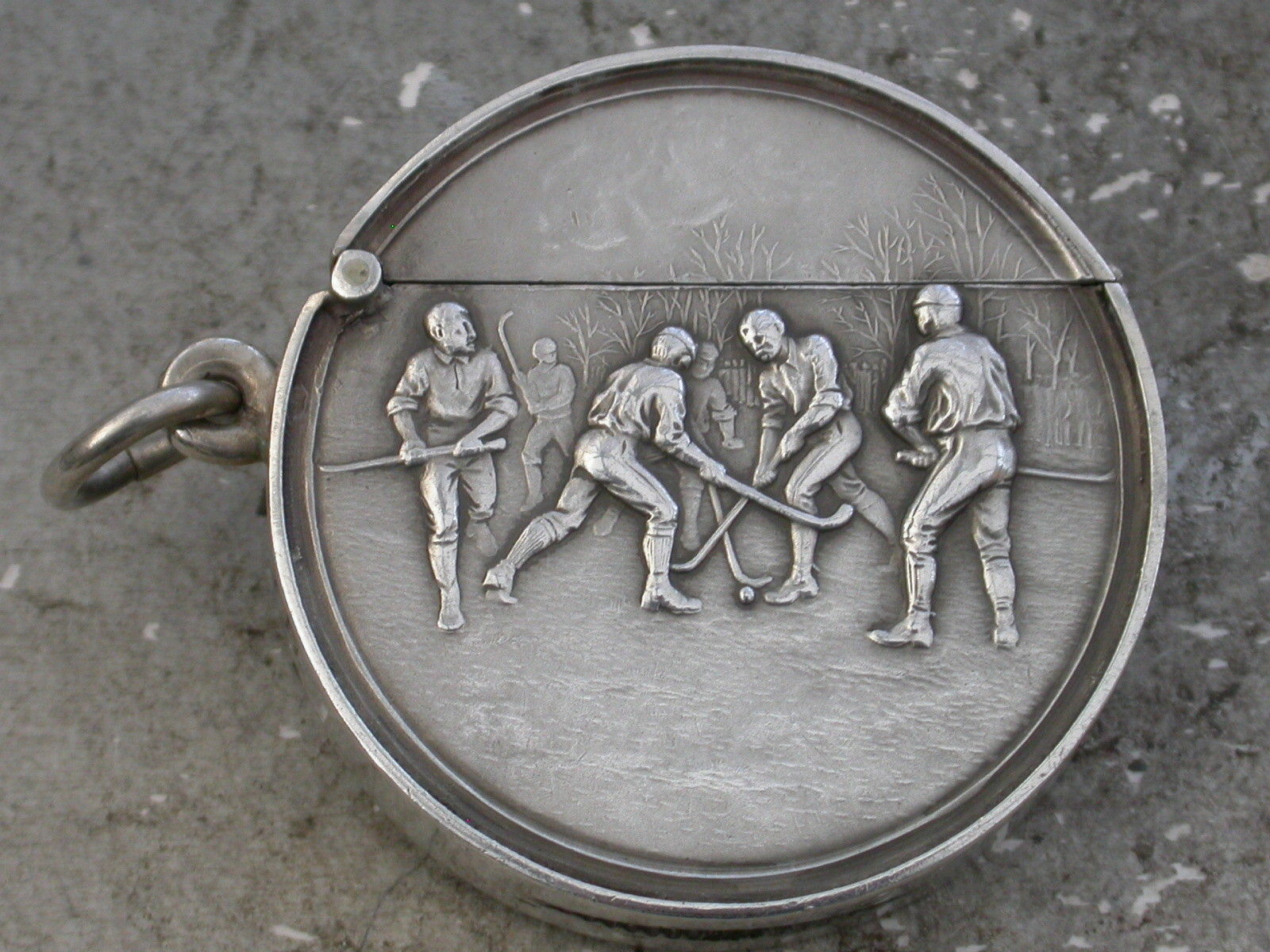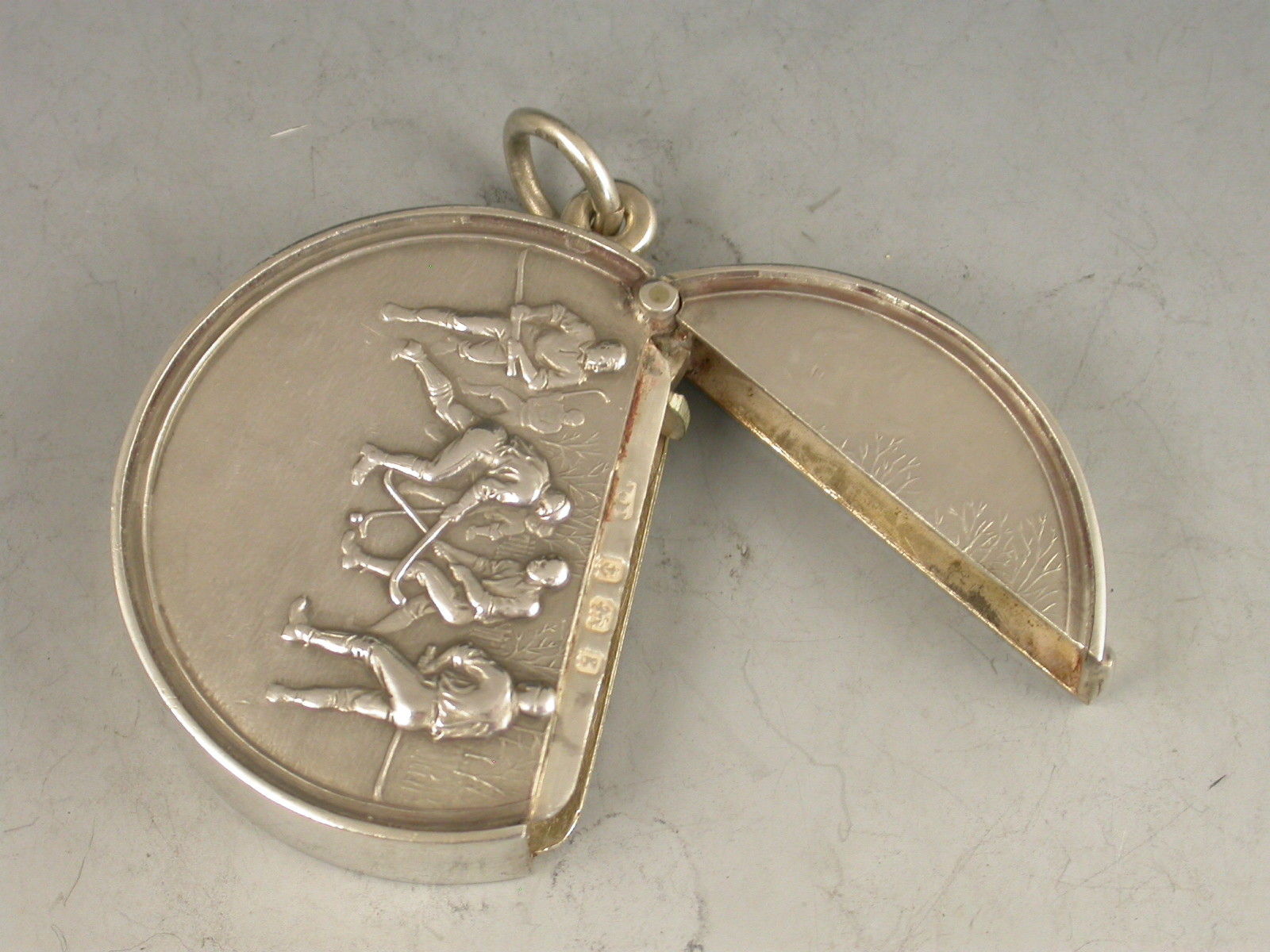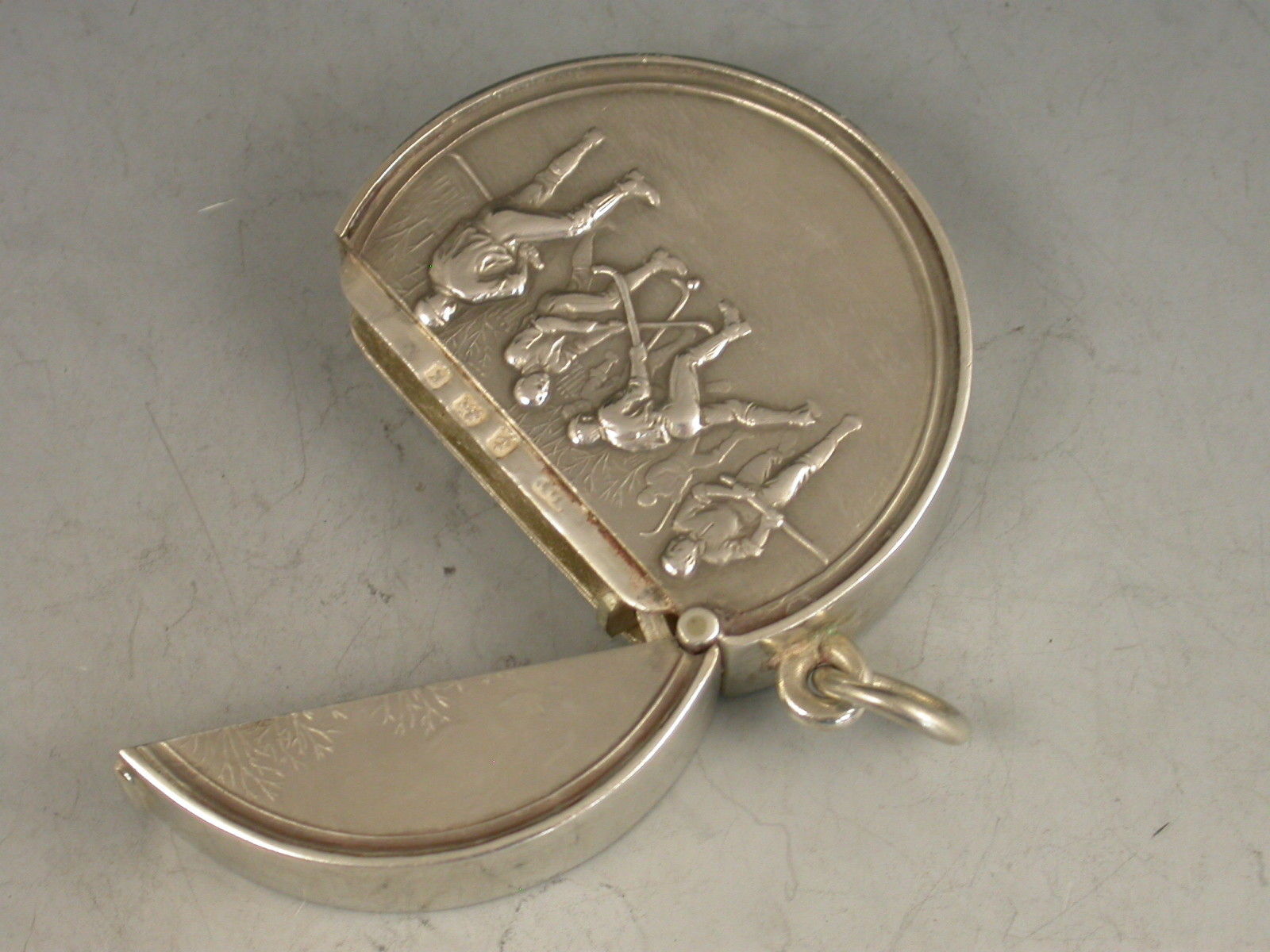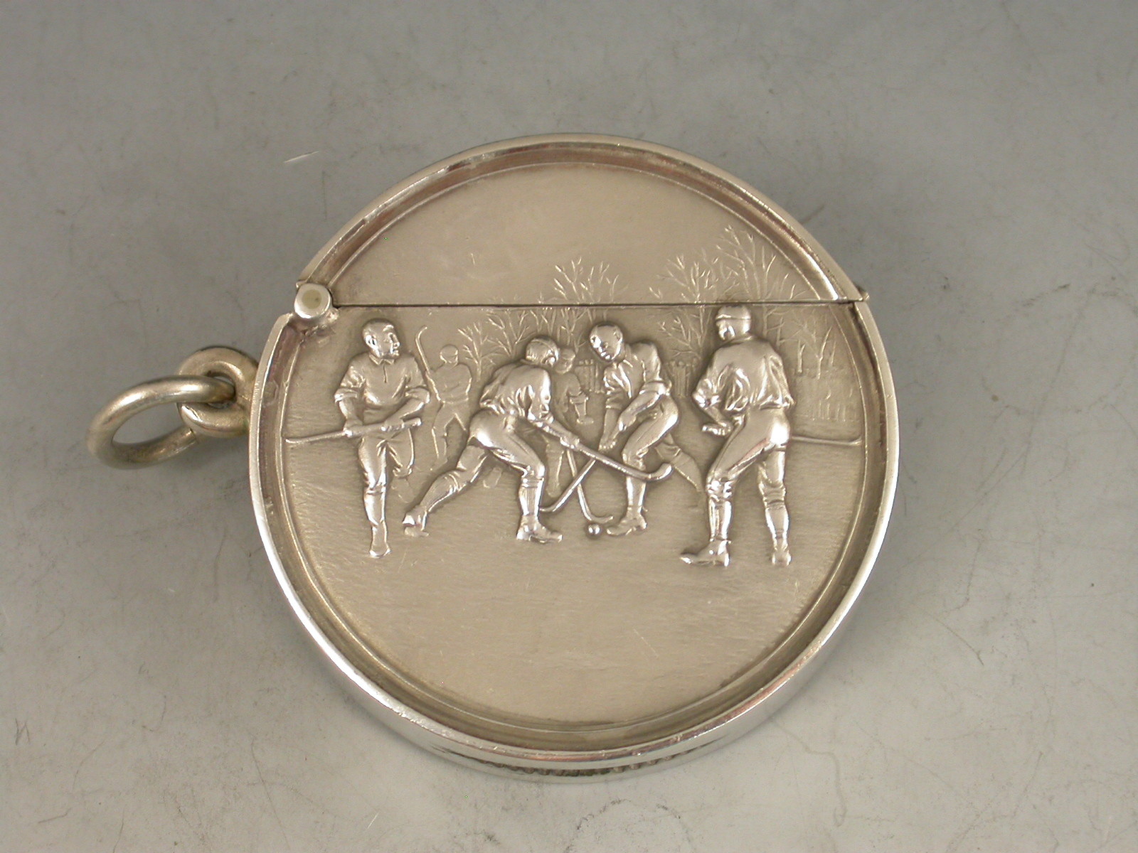 A rare early 20th century silver Vesta Case of circular form with hinged flip-top lid and attached suspension ring. The face chased and engraved with a scene depicting hockey players (a rare subject). The reverse engraved with contemporary initials and dated 1909.