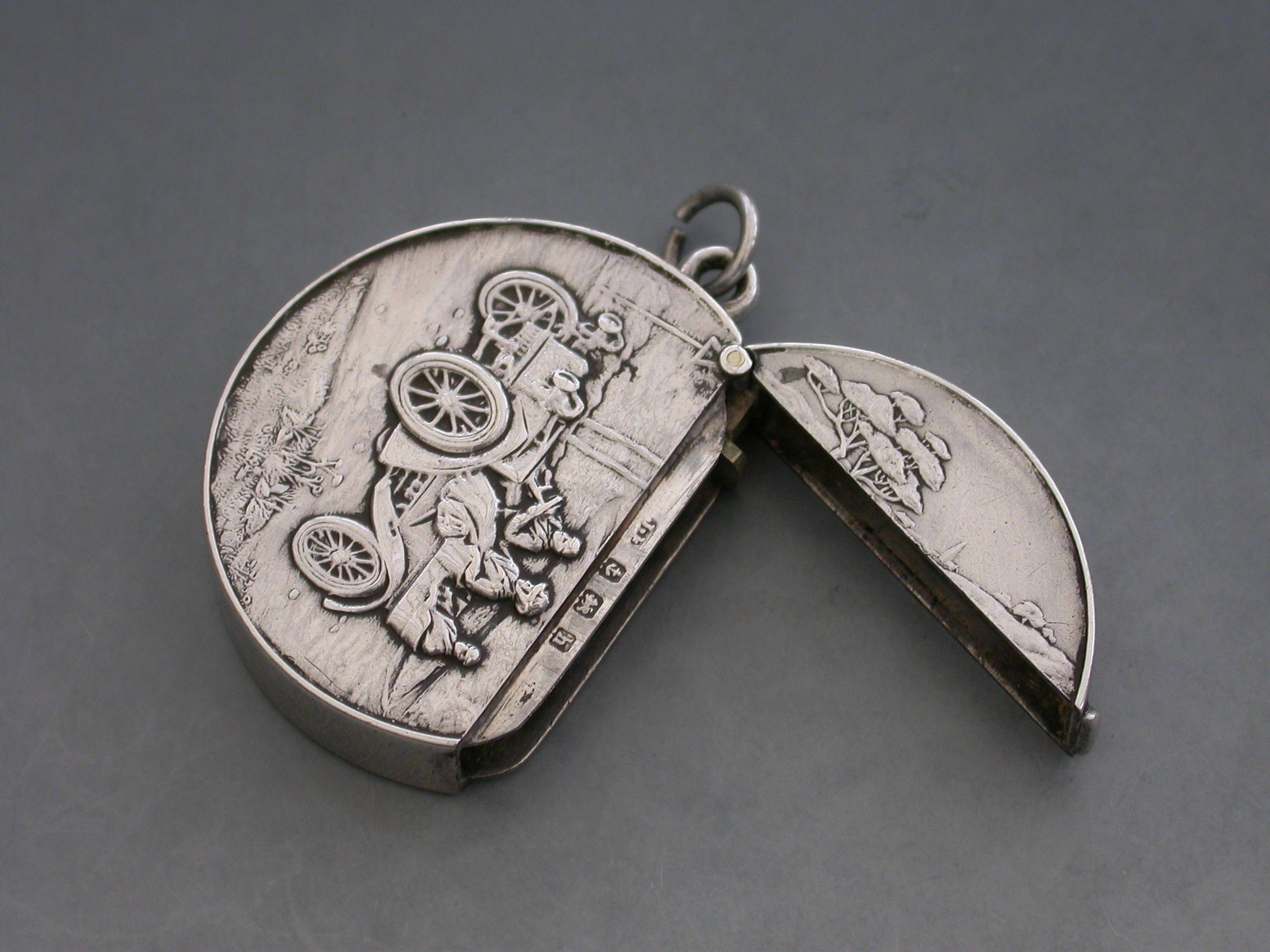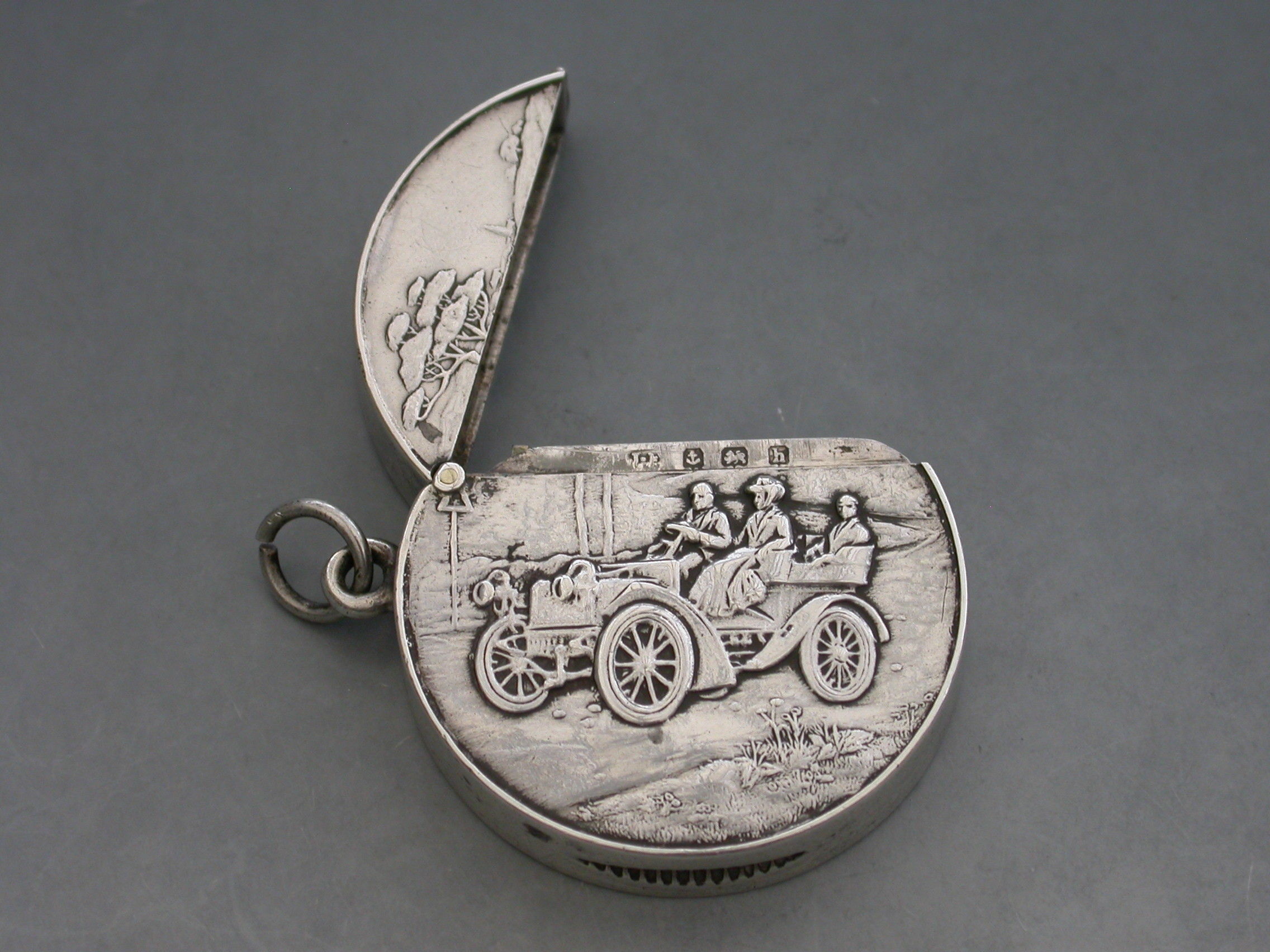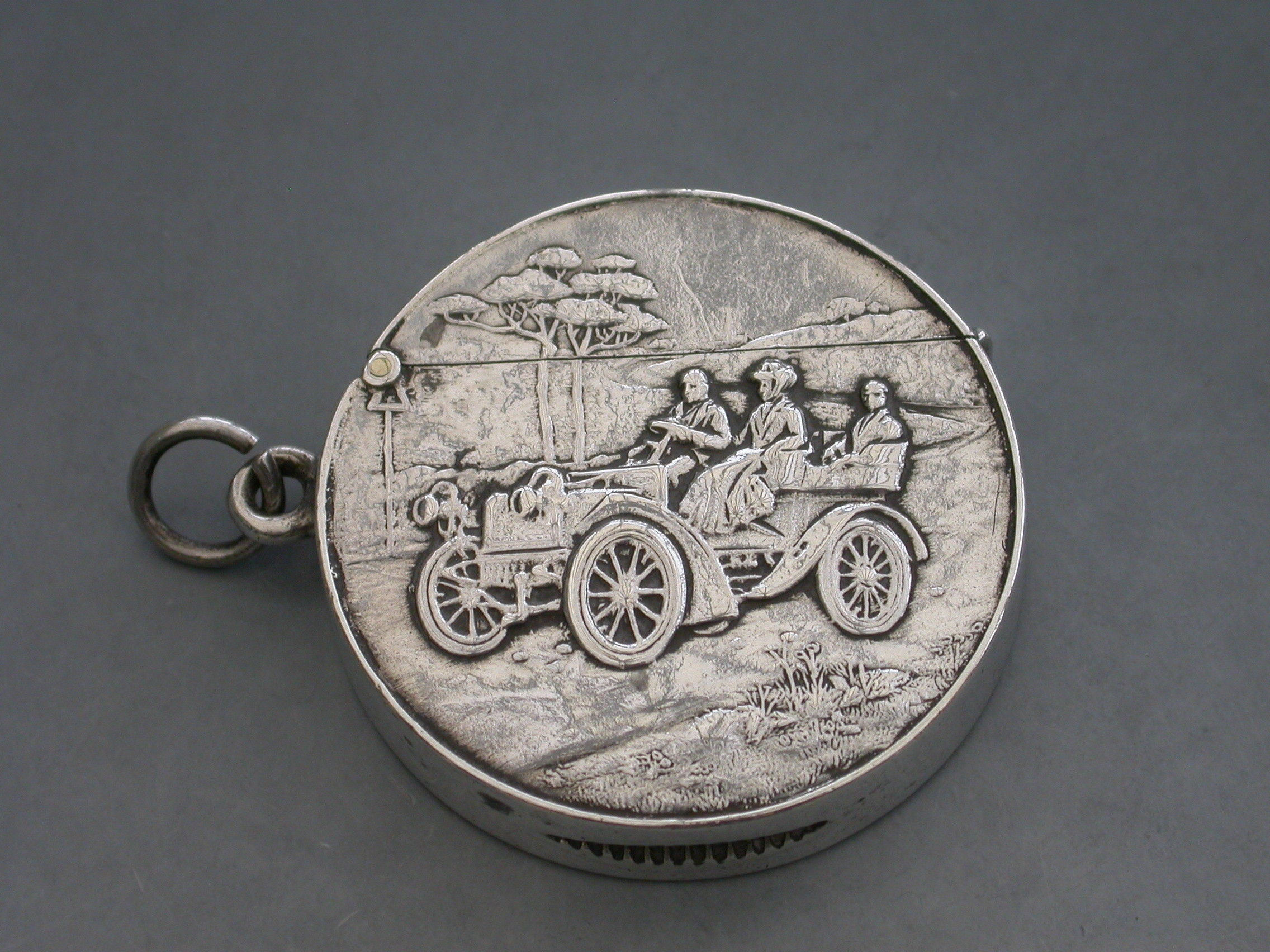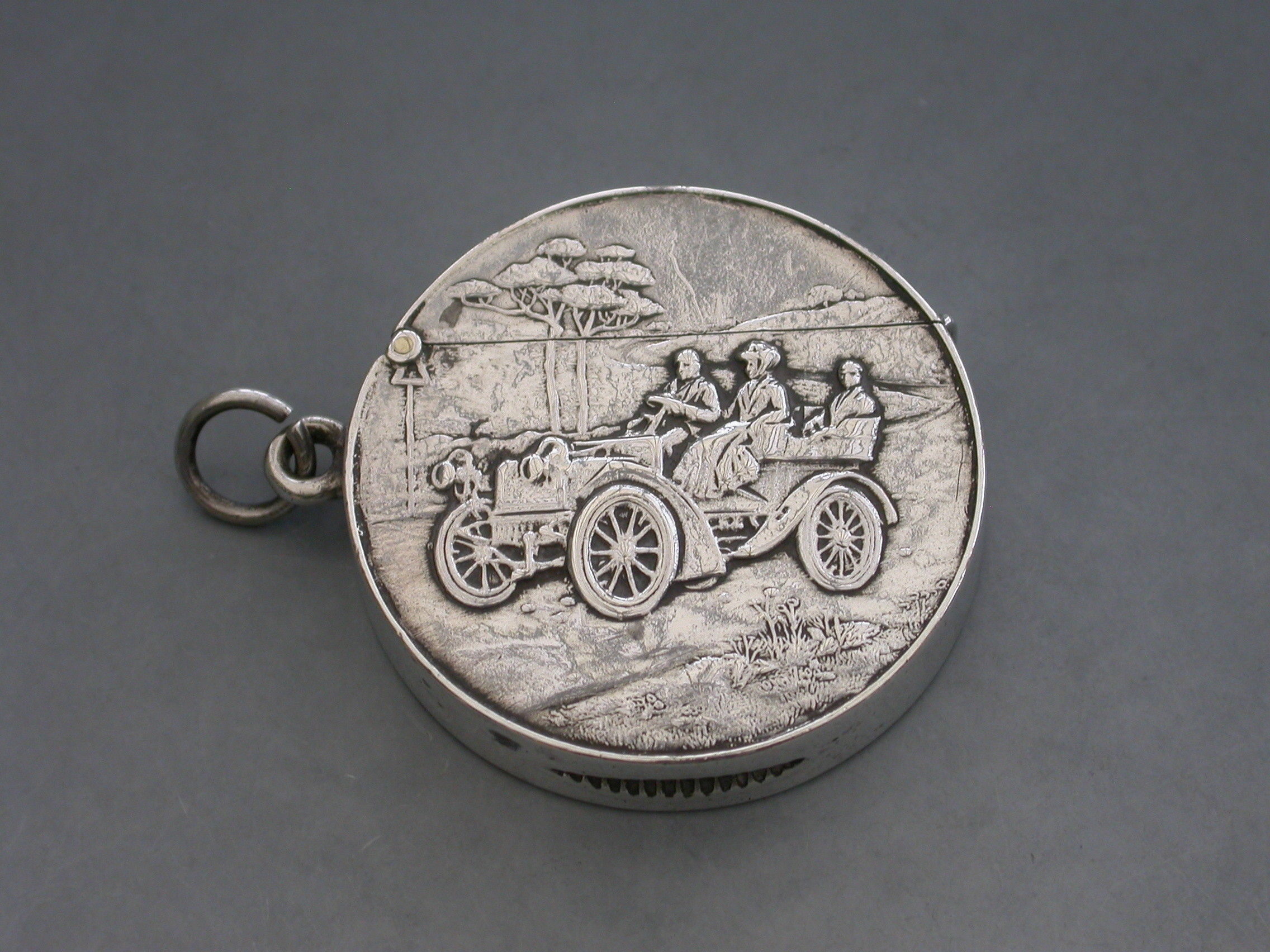 A rare Edwardian circular silver Vesta Case with hinged flip-top lid, the face chased and engraved with a vintage car in a landscape scene. Attached suspension ring.