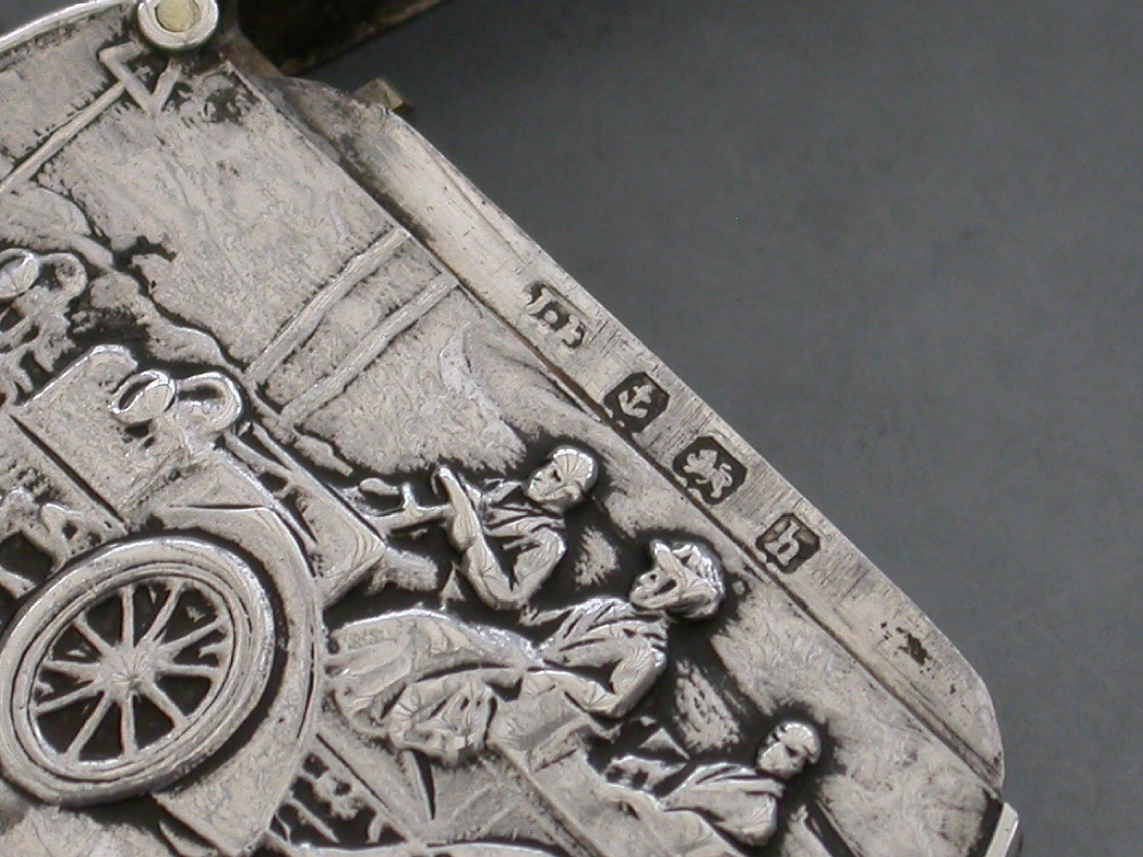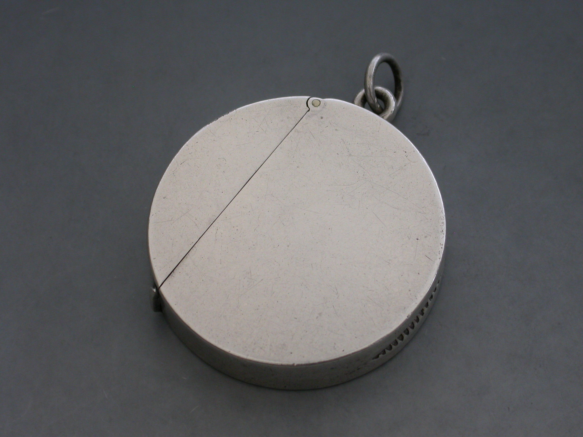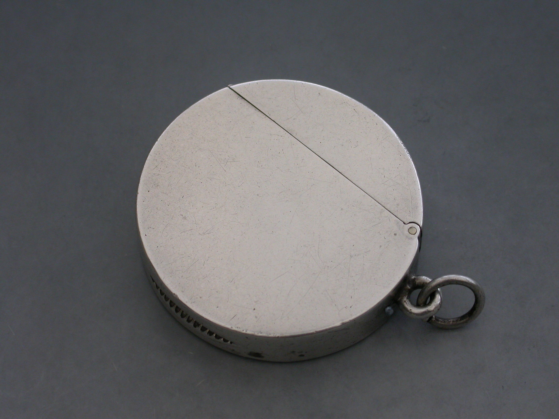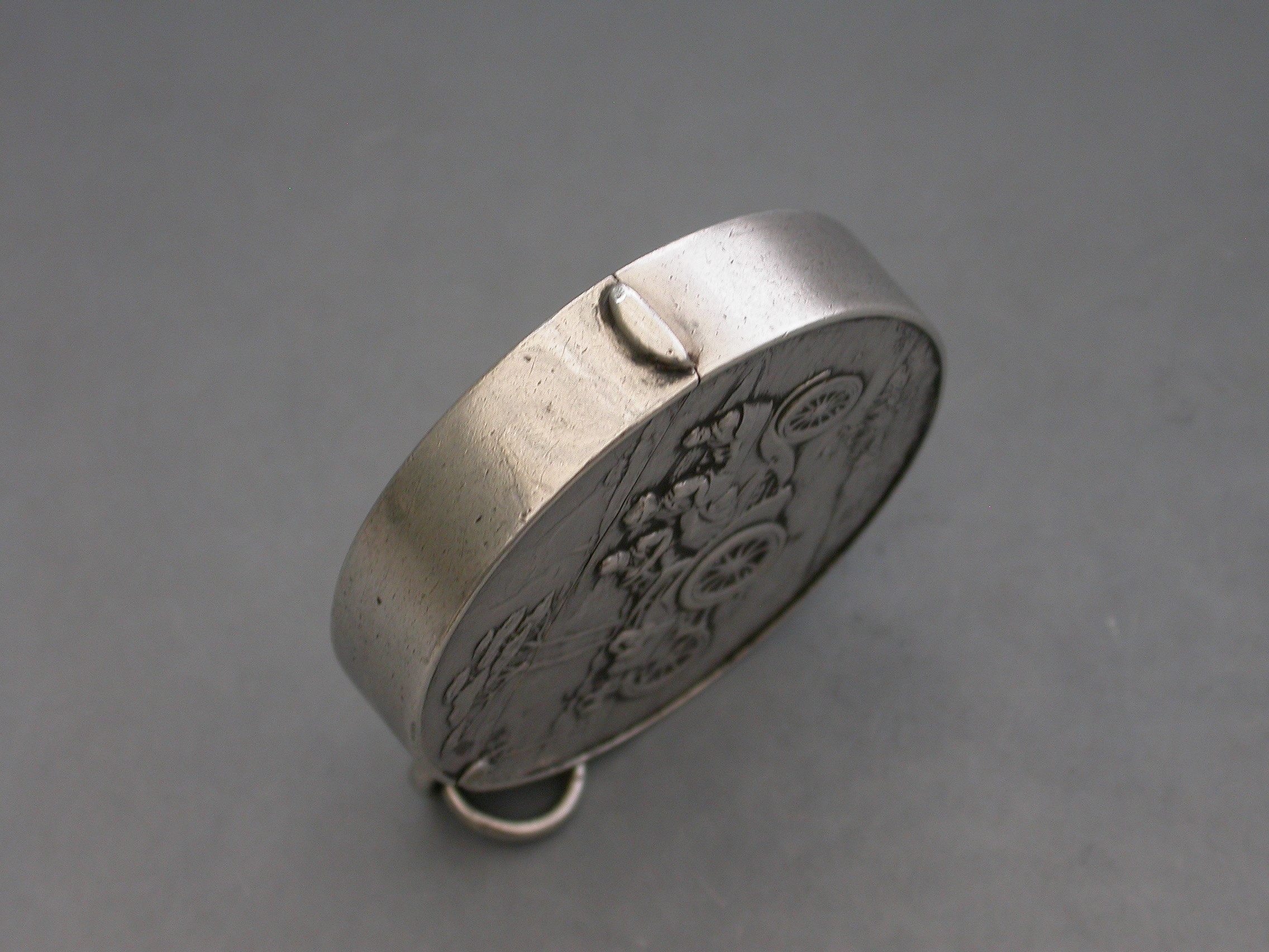 A rare Edwardian circular silver Vesta Case with hinged flip-top lid, the face chased and engraved with a vintage car in a landscape scene. Attached suspension ring.
