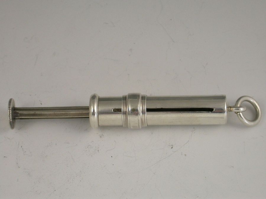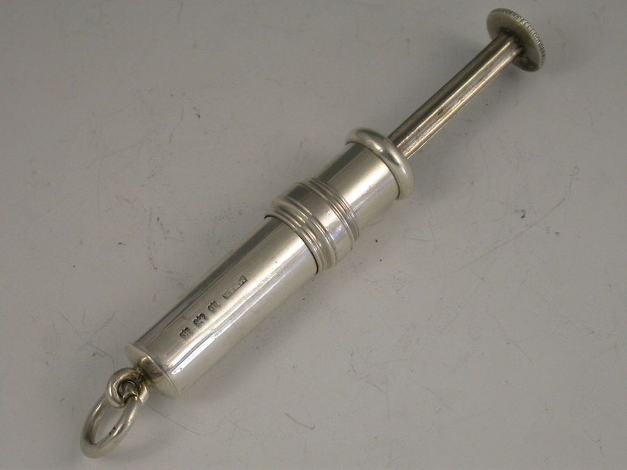 A rare Edwardian English silver Pocket Stamp Roll Dispenser with slide out central spindle to retain the stamps which are then dispensed through the slot on the side. Attached suspension ring. Unusual in hallmarked English silver this form is more usually found in American Sterling.