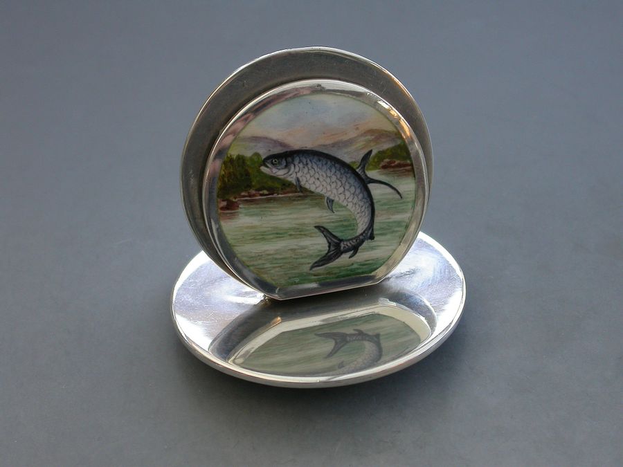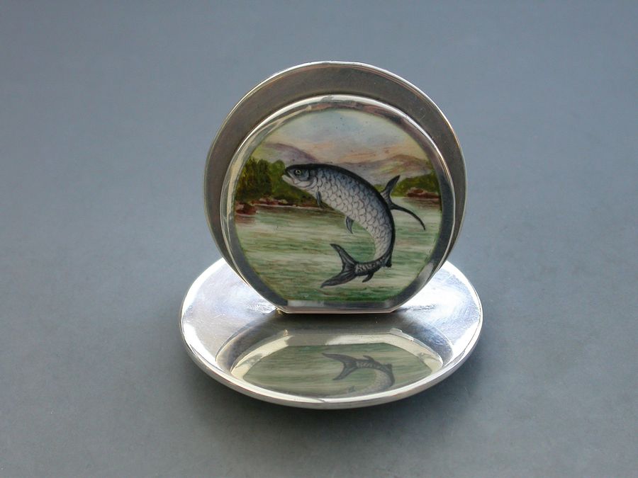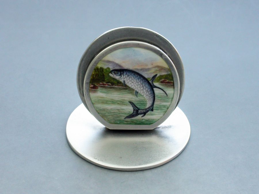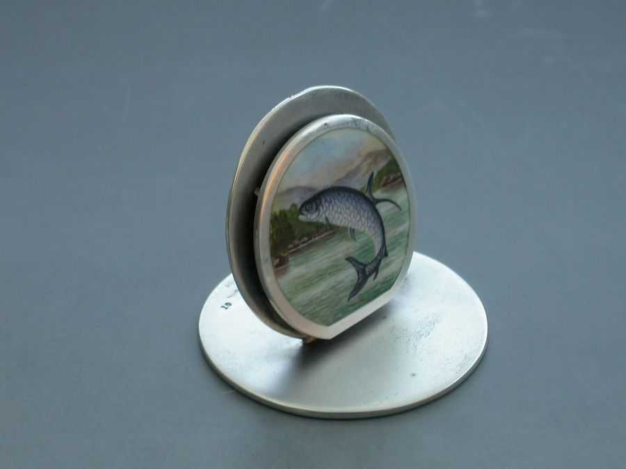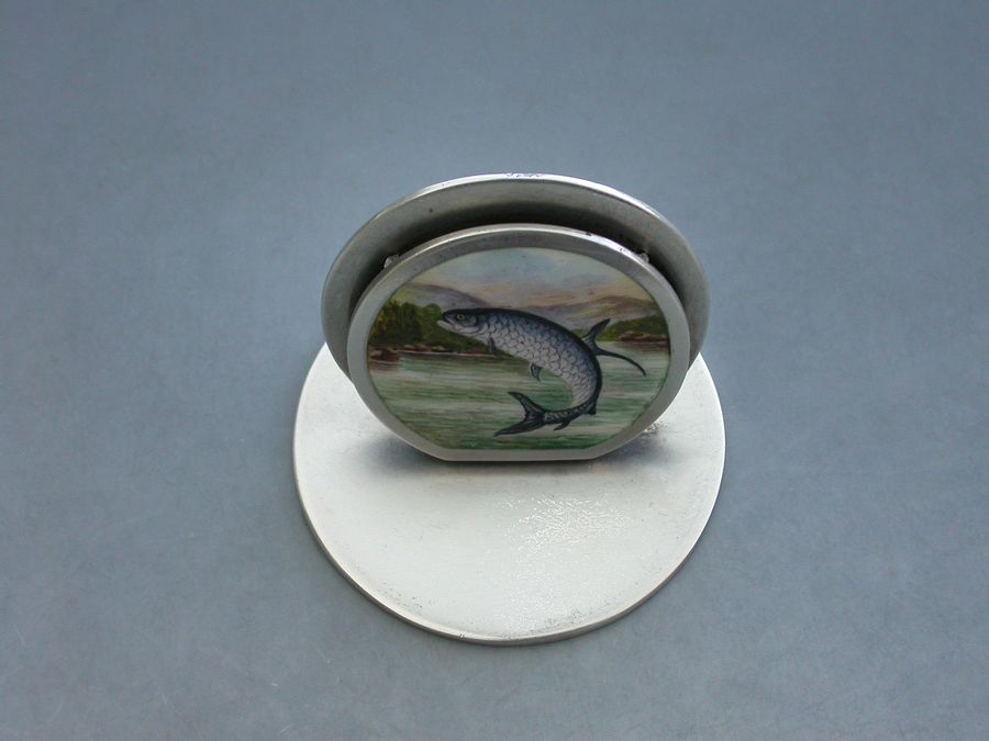 A fine and extremely rare Edwardian silver and enamel Menu Holder of double-disc form on a circular base, the sprung circular front panel finely enamelled with a leaping Tarpon in a landscape scene.