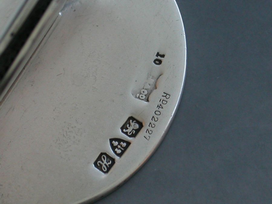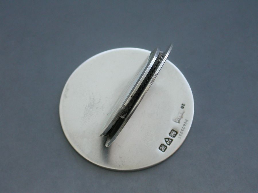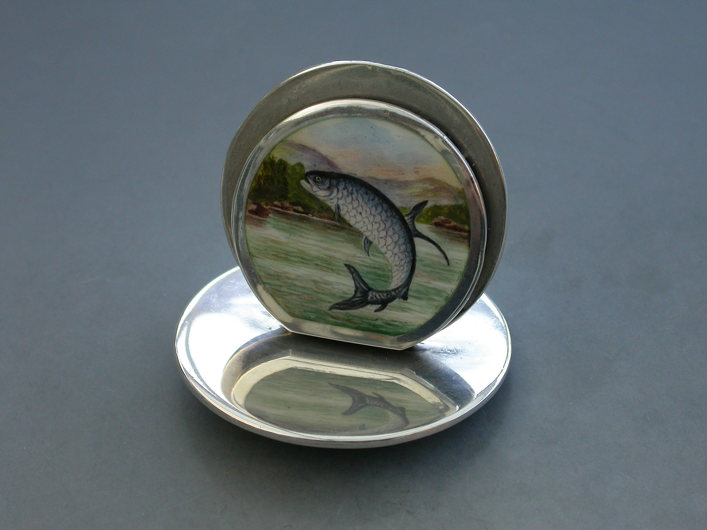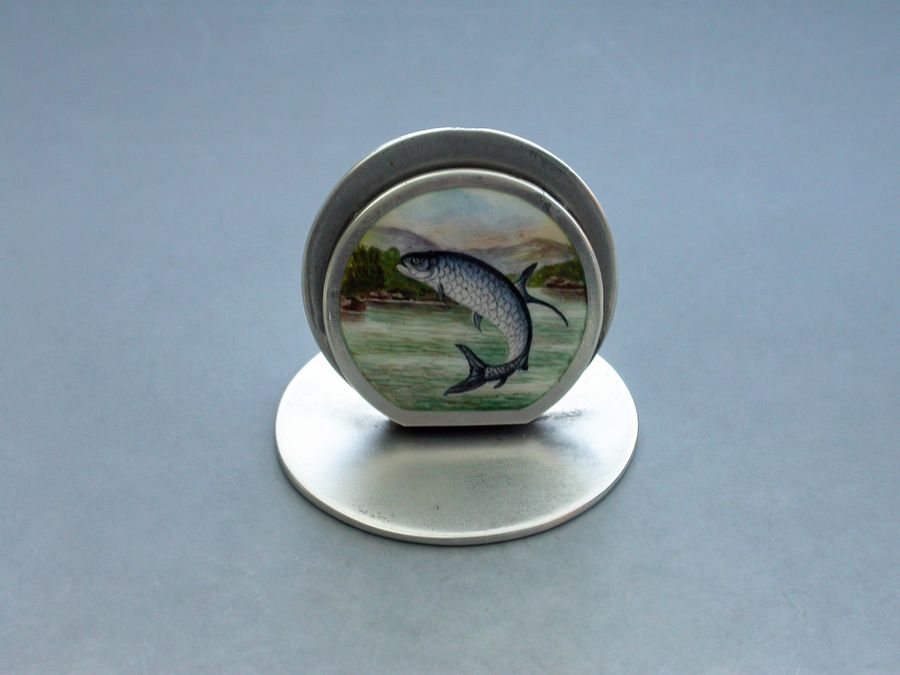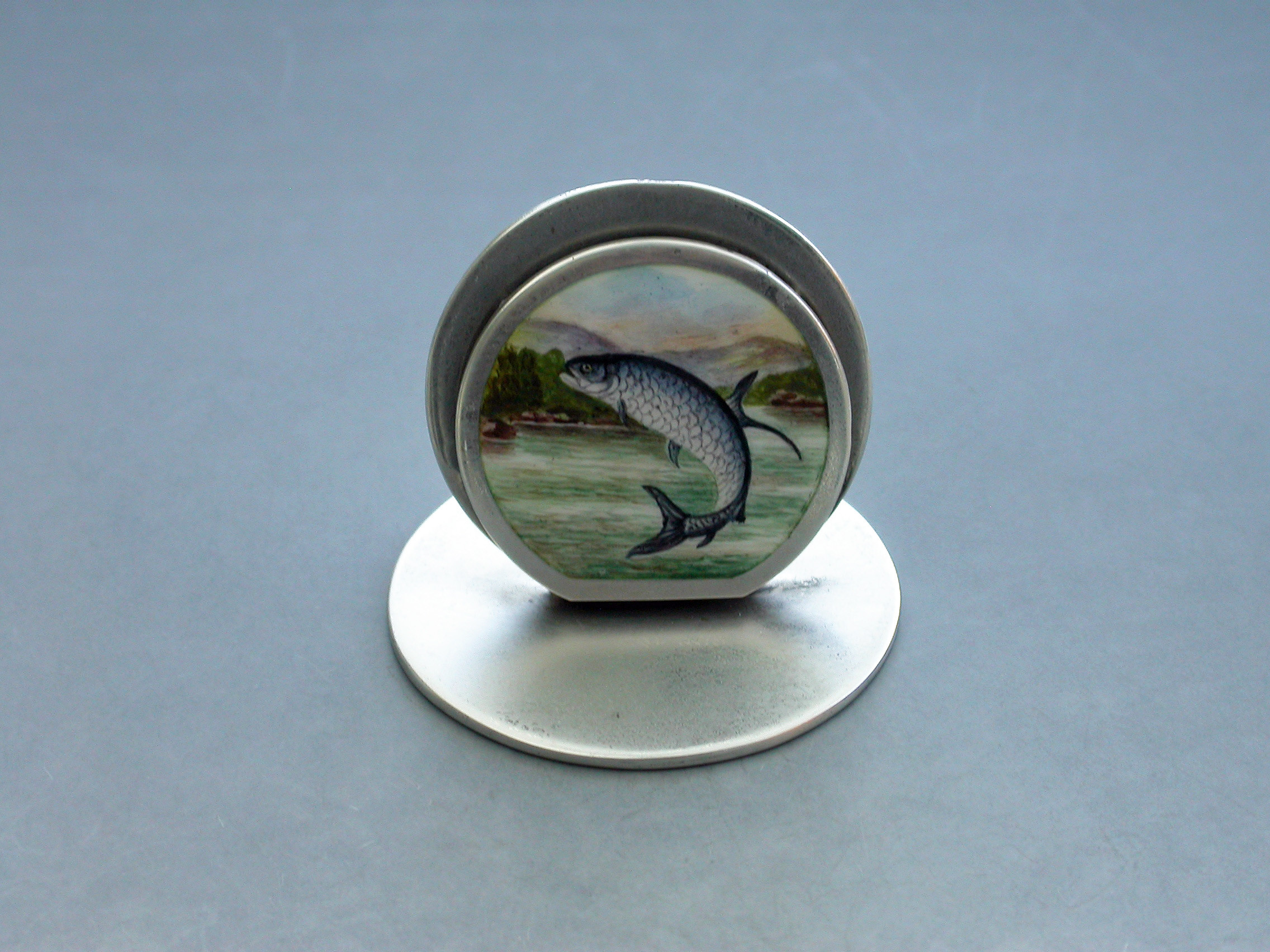 A fine and extremely rare Edwardian silver and enamel Menu Holder of double-disc form on a circular base, the sprung circular front panel finely enamelled with a leaping Tarpon in a landscape scene.