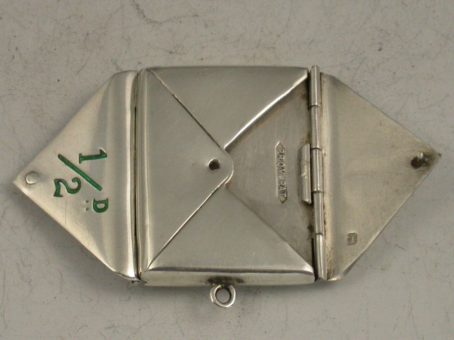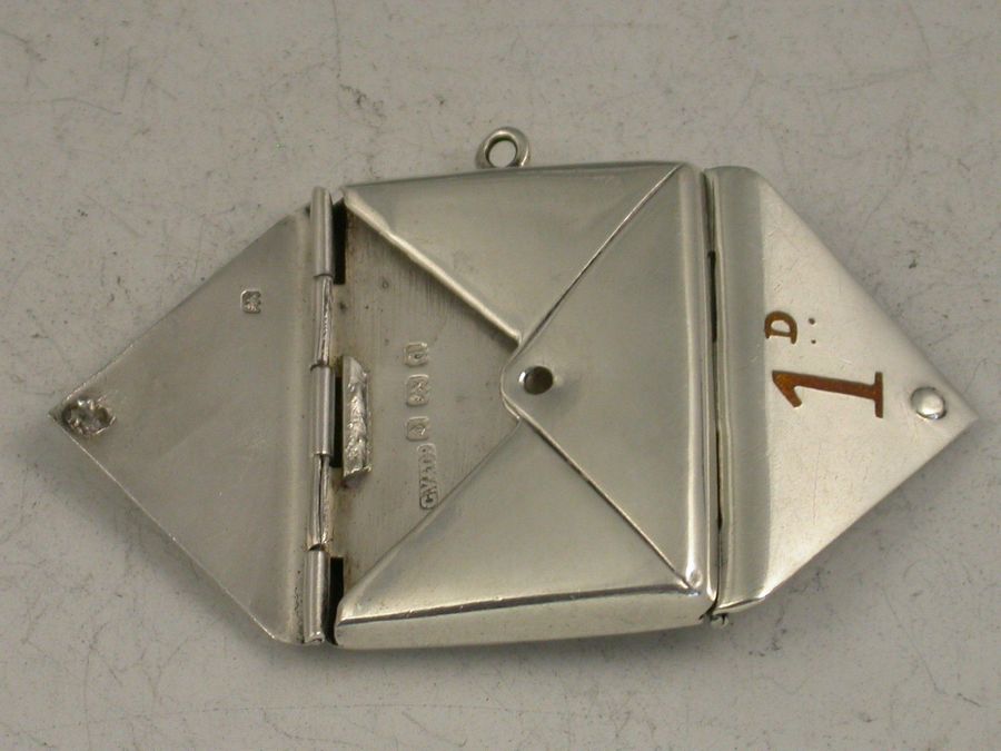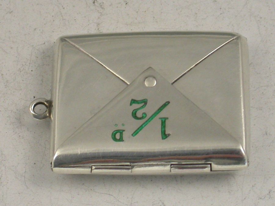 An extremely rare Edwerdian silver double Stamp Case of back to back envelope form, one side with red enamel 1d, the other with green enamel 1/2d.