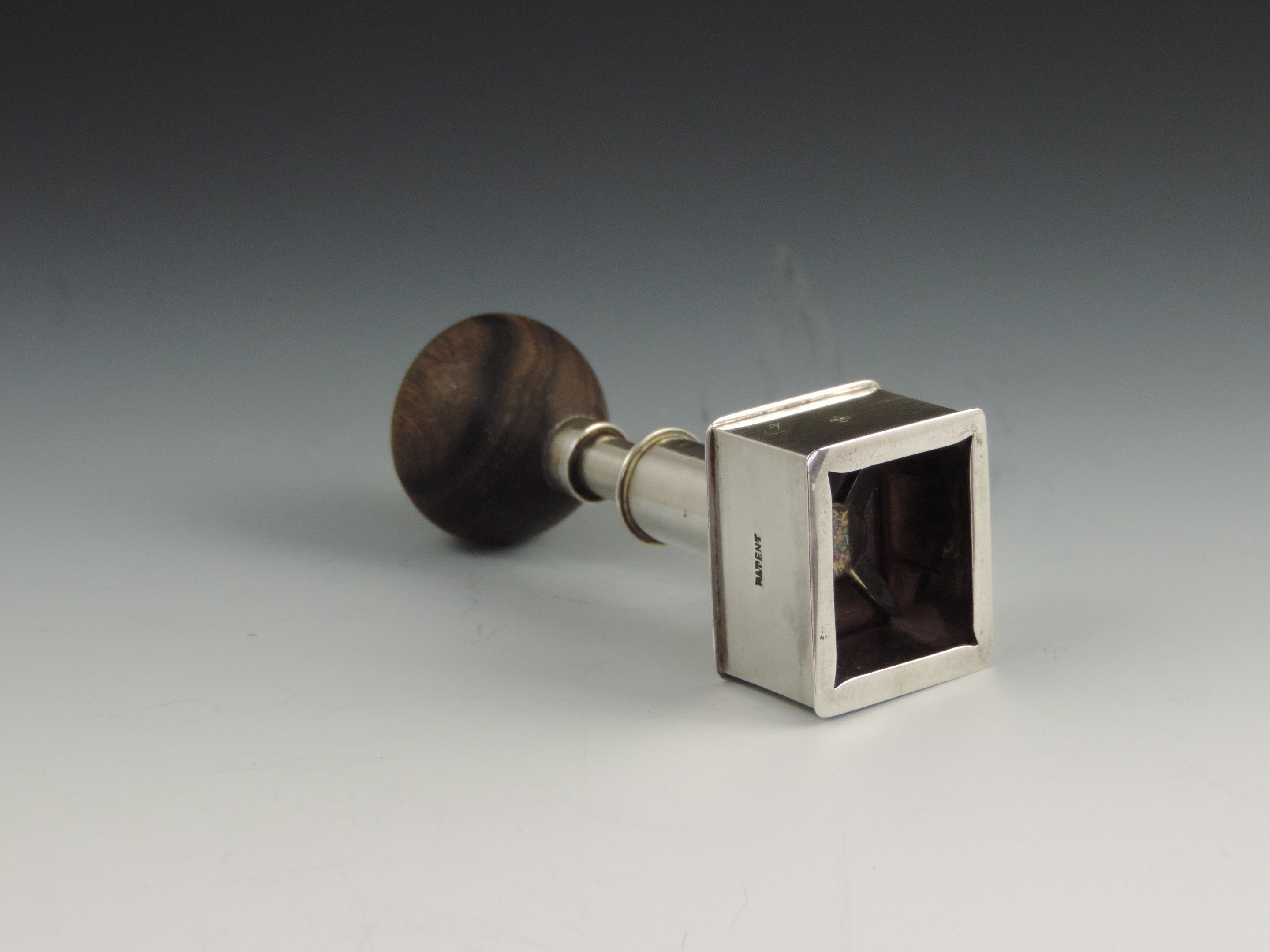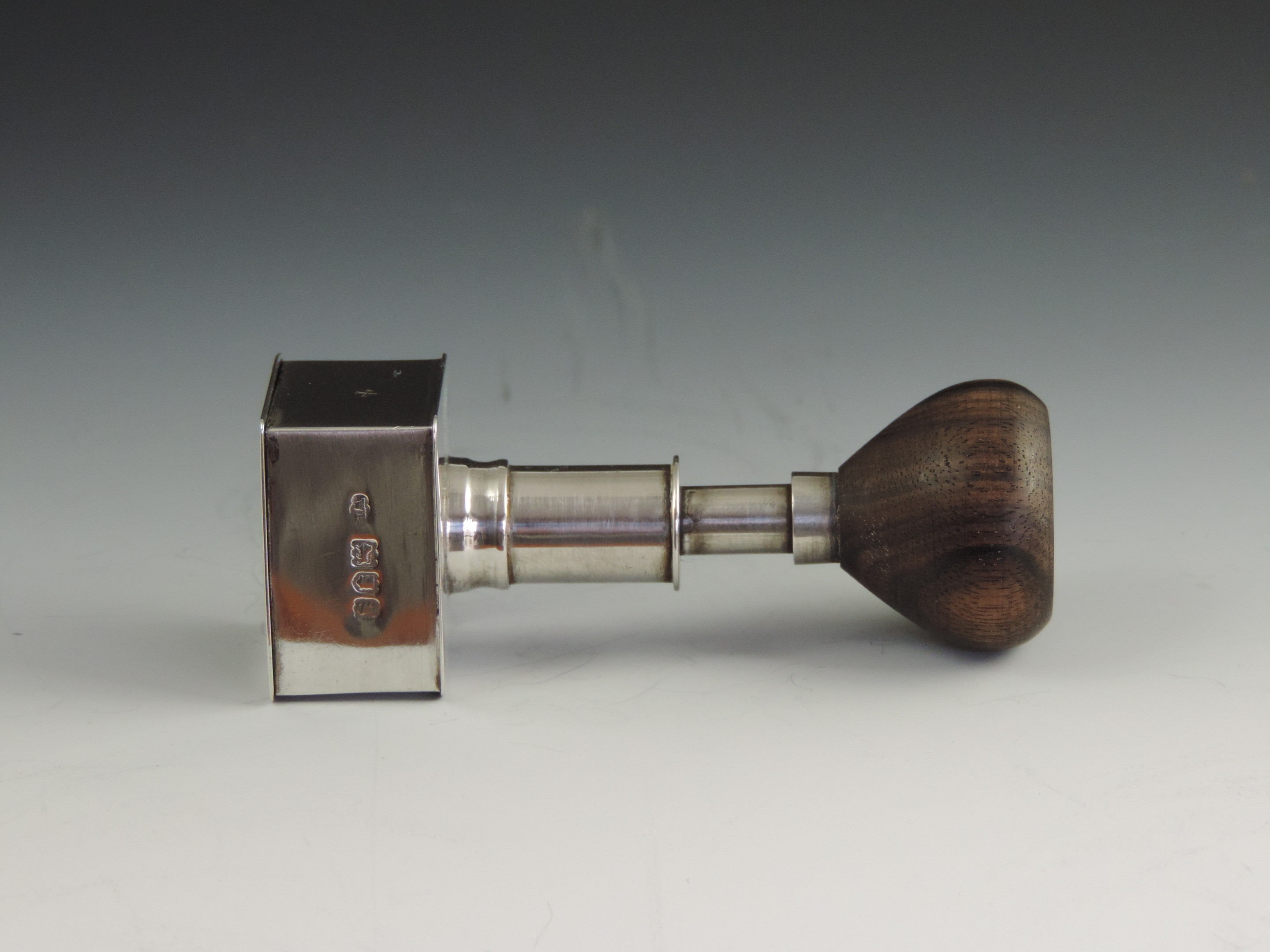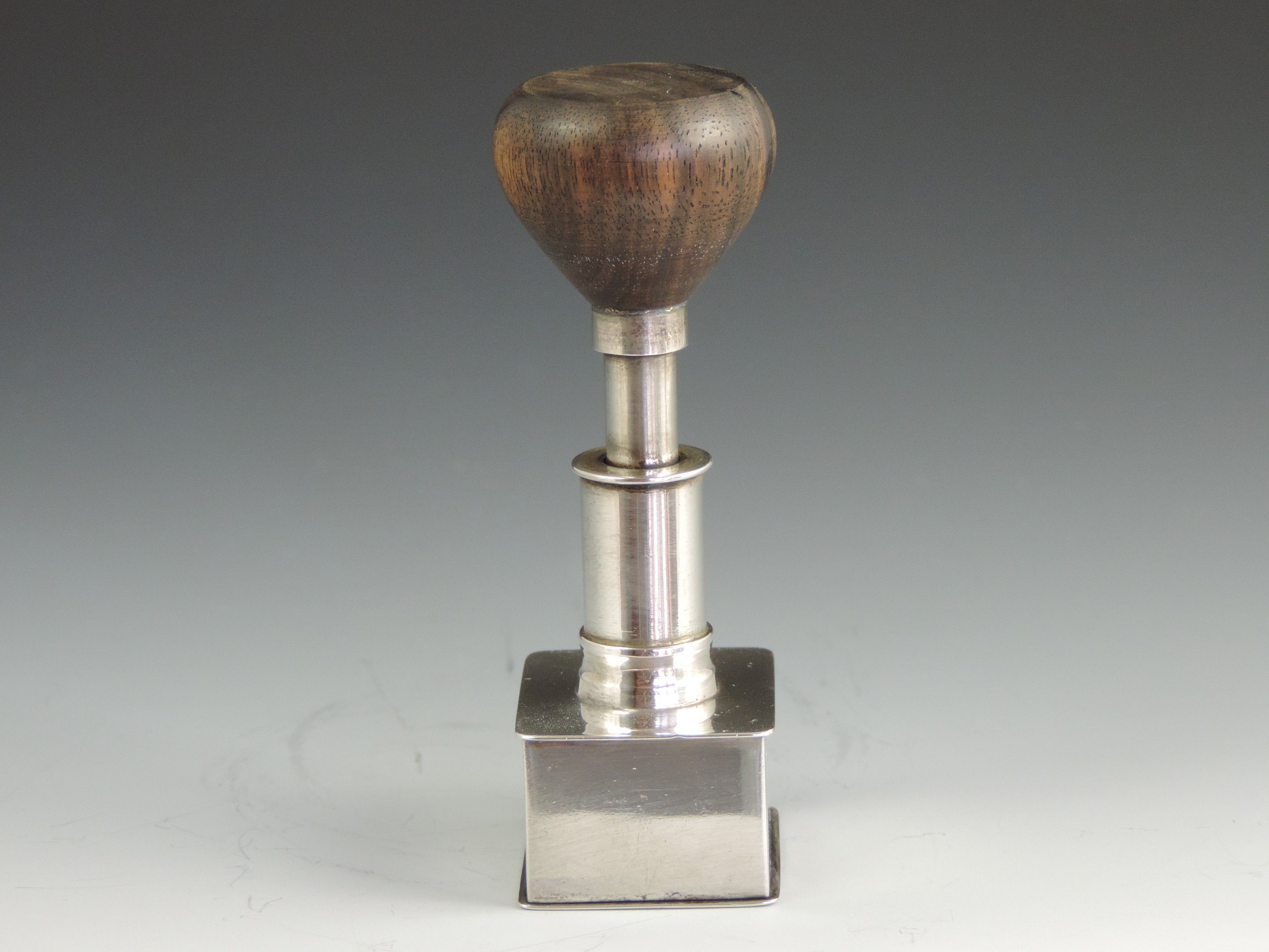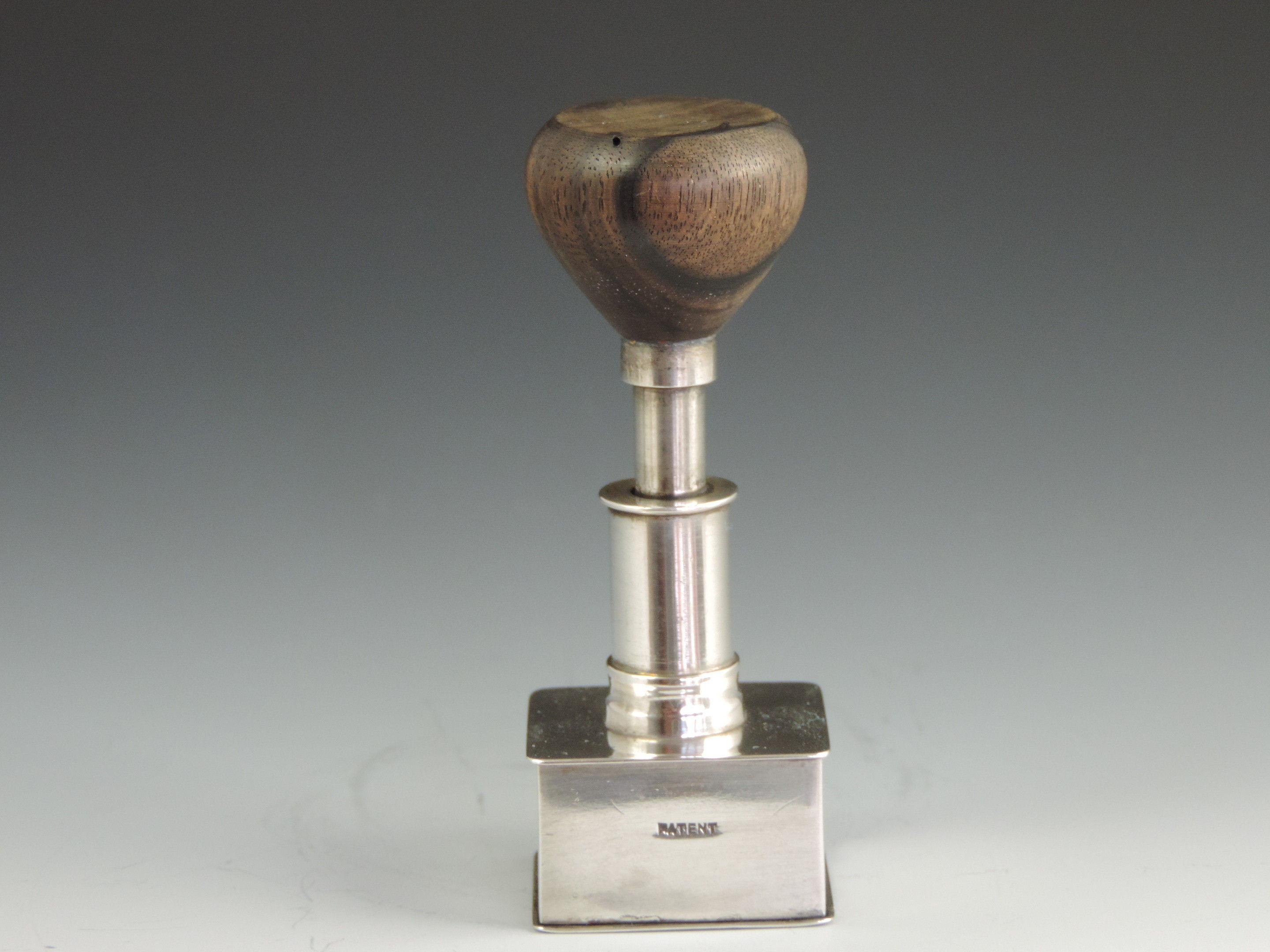A rare Edwardian silver Patent Stamp Dispenser or a ""Device for Carrying and Affixing Stamps"". The sprung silver plunger with turned wooden handle. The Patent applied for by Benjamin F Lantz on August 5th 1890.