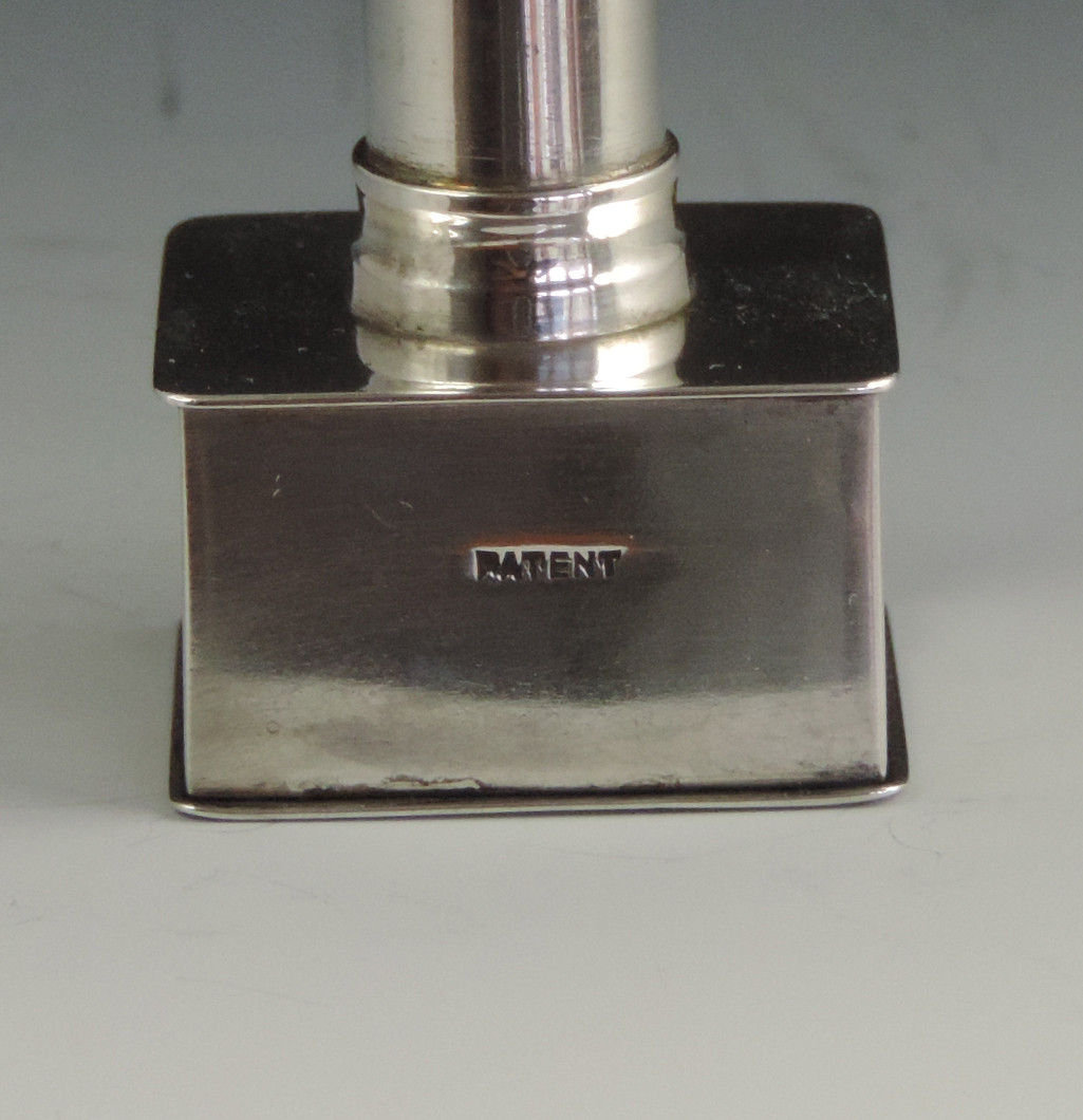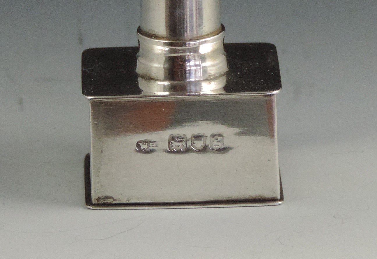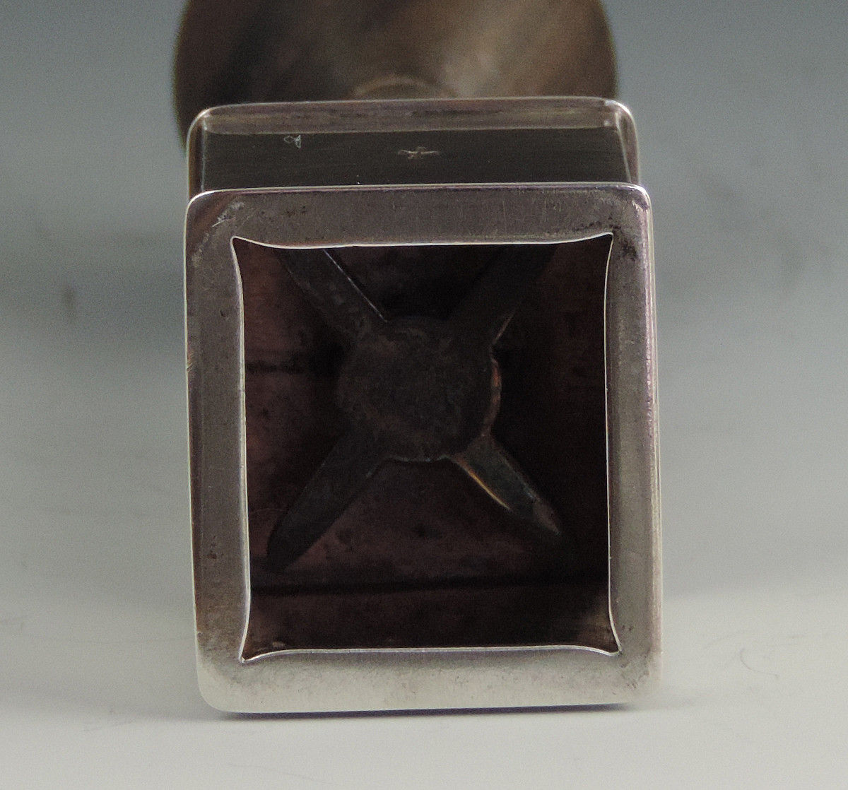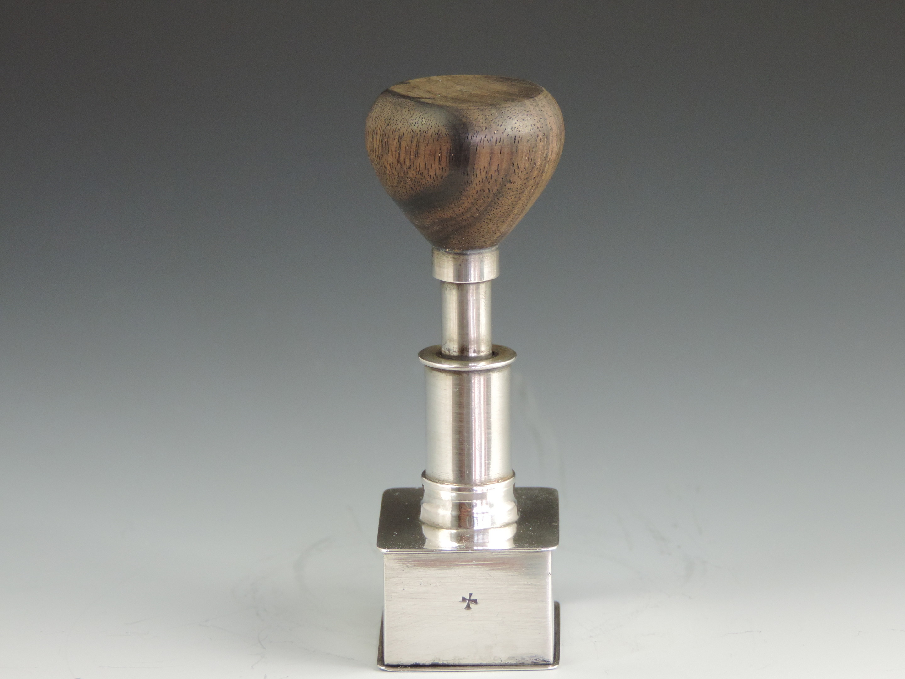 A rare Edwardian silver Patent Stamp Dispenser or a ""Device for Carrying and Affixing Stamps"". The sprung silver plunger with turned wooden handle. The Patent applied for by Benjamin F Lantz on August 5th 1890.