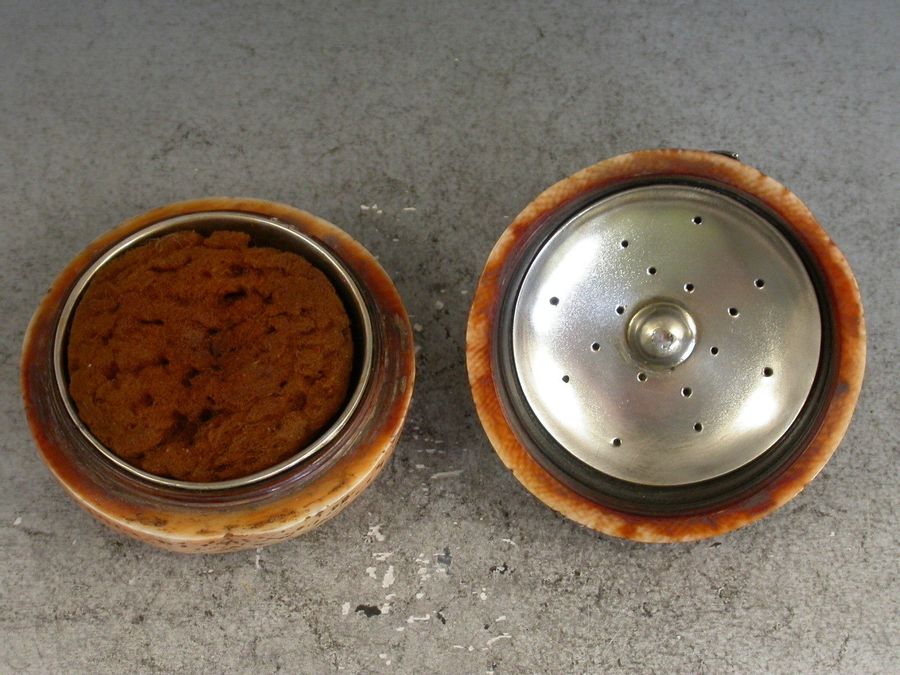 A fine quality Edwardian silver mounted Vinaigrette / Pomander of naturalistic form, made from an organic material, possibly ivory, in the form of a compressed orange or satsuma. The pierced screw off cover with three silver leaves and a suspension ring opening to reveal the silver gilt interior complete with original sponge.