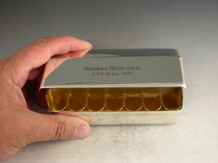 A very unusual Edwardian silver Box of rounded rectangular form with two compartments with sprung closure and a central swiveling cover, each compartment with gilded interior divided into seven sections (14 in total), with wire guard rings.