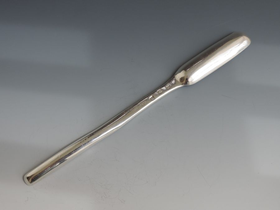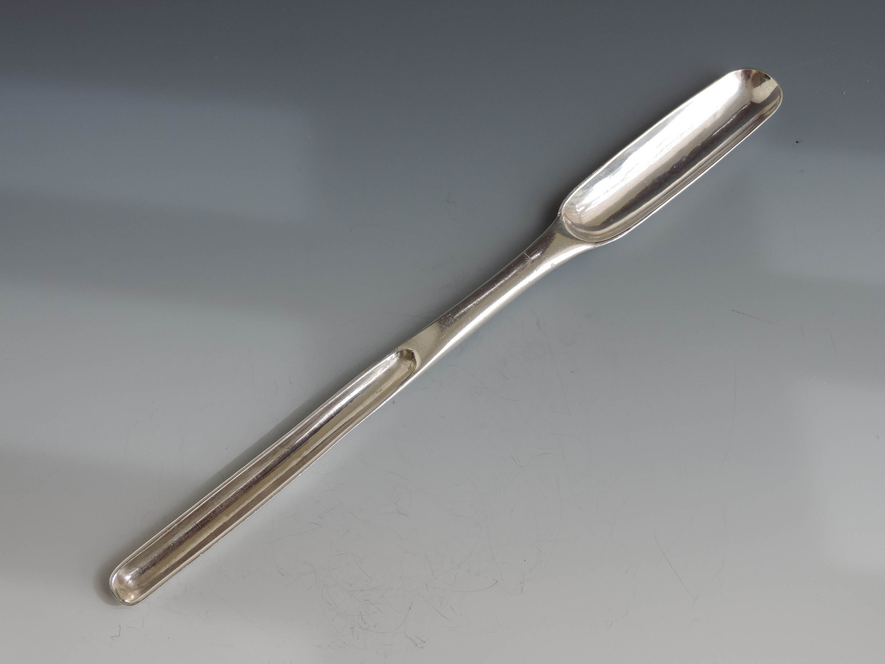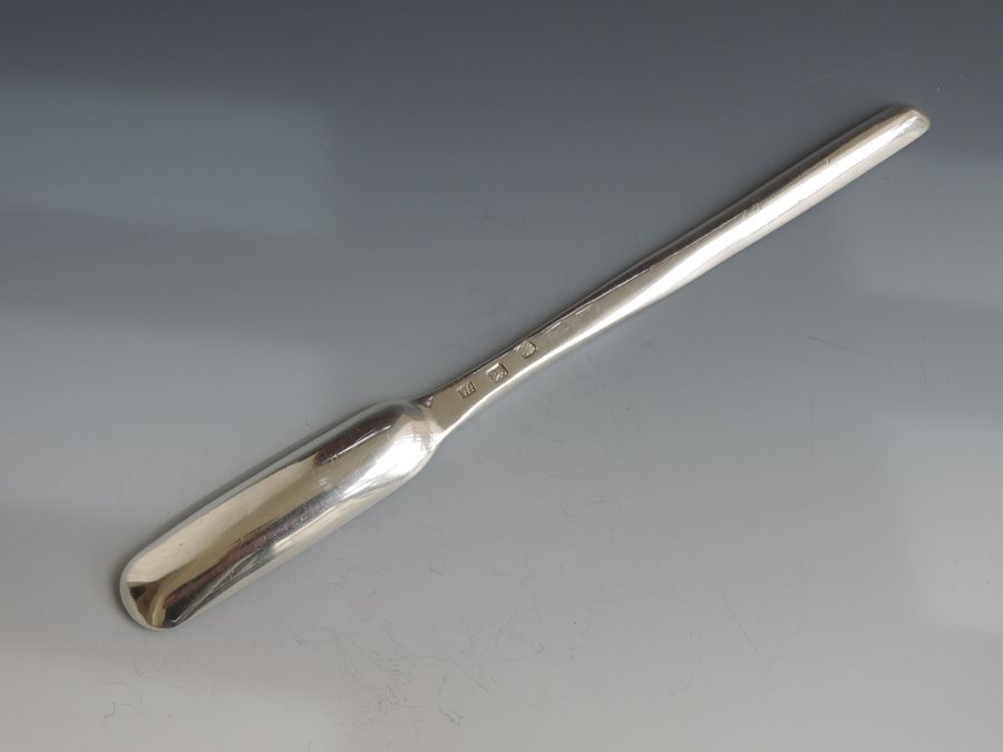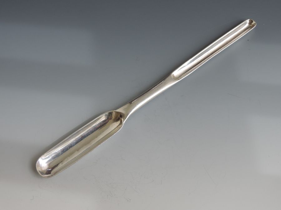 An extremely rare George II Provincial silver Marrow Scoop of standard form with two bowls and of a heavy gauge.
