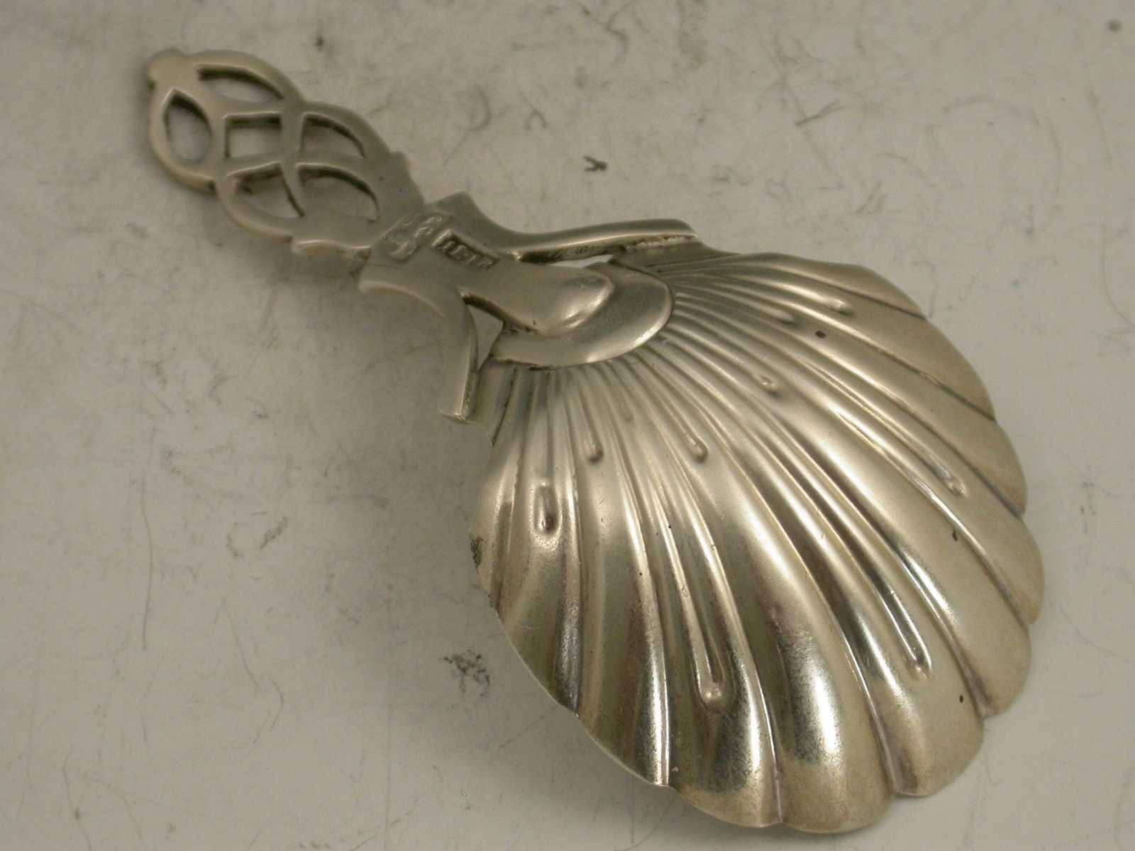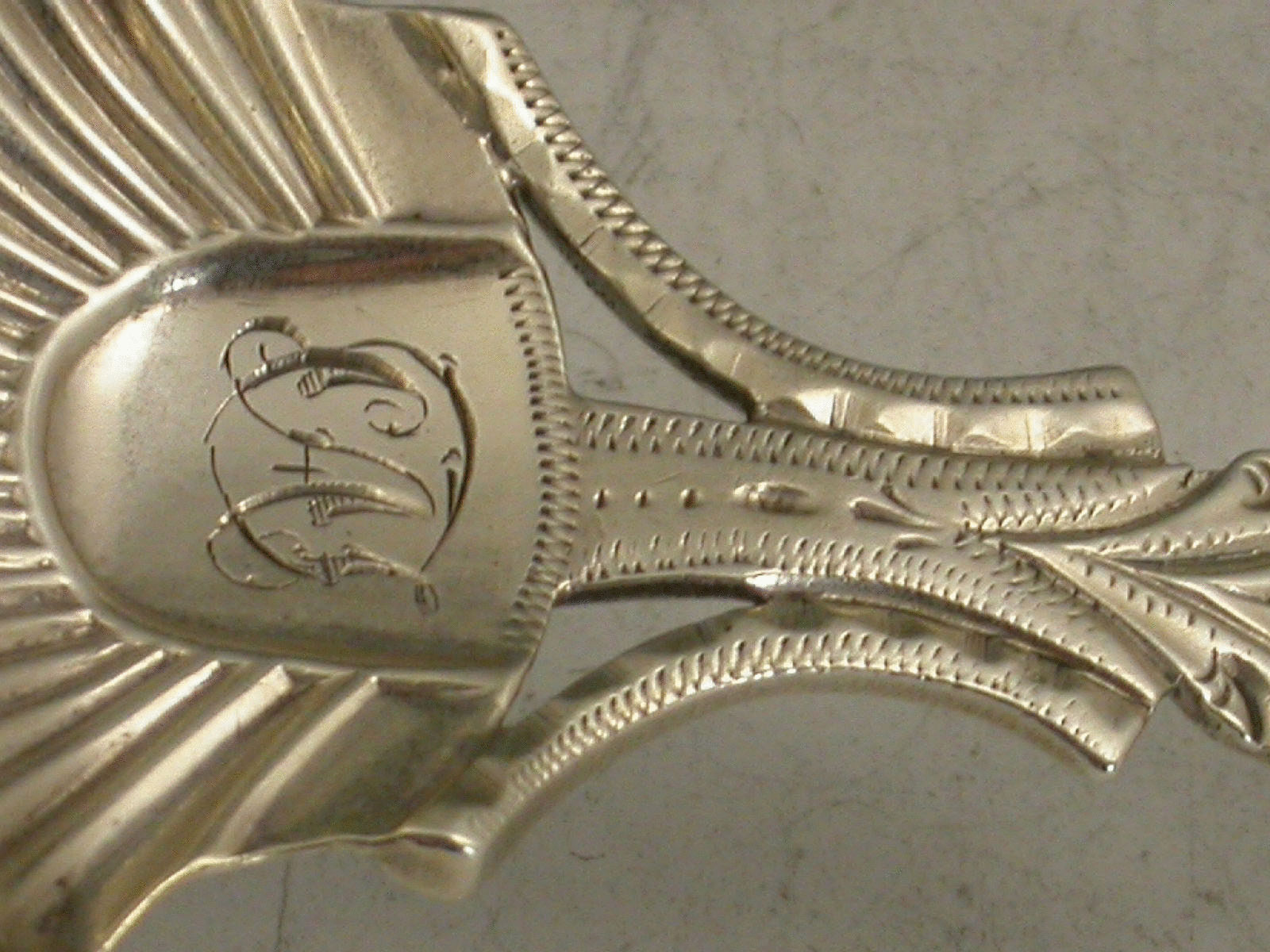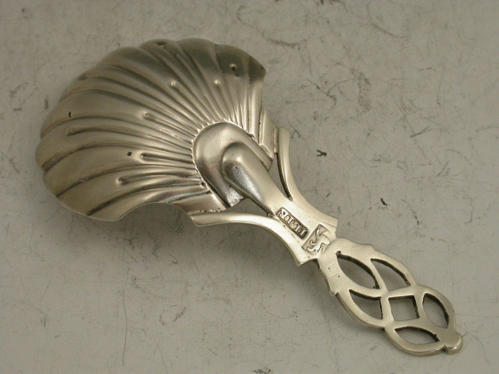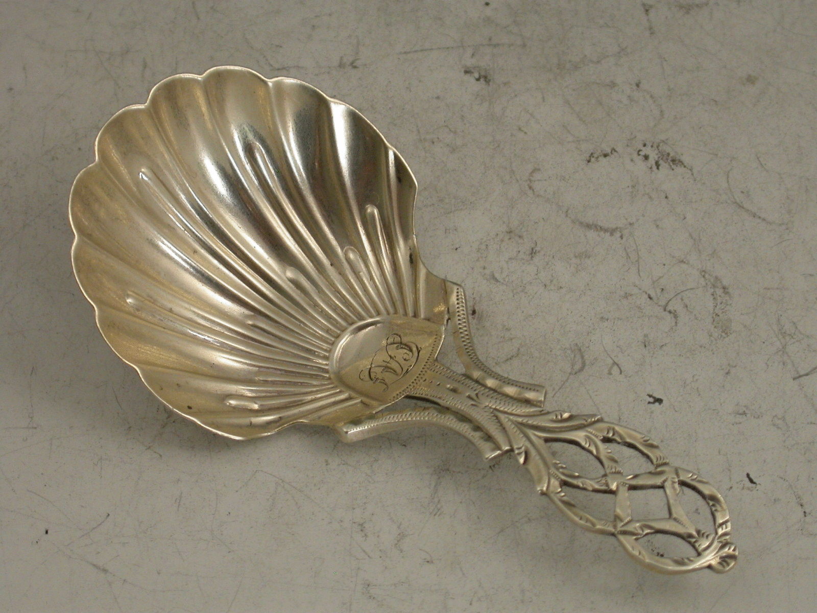 An extremely rare George III 18th century Provincial silver Caddy Spoon with shaped fluted scallop shell bowl, the pierced and entwined lattice work handle with bright cut engraved decoration. Contemporary initials engraved to base of handle.
